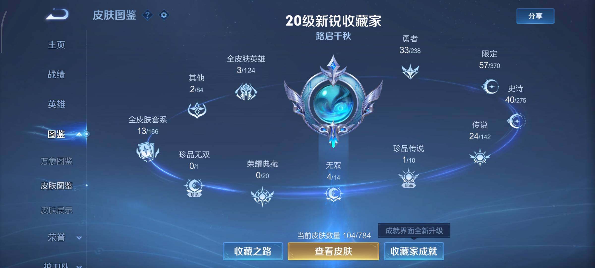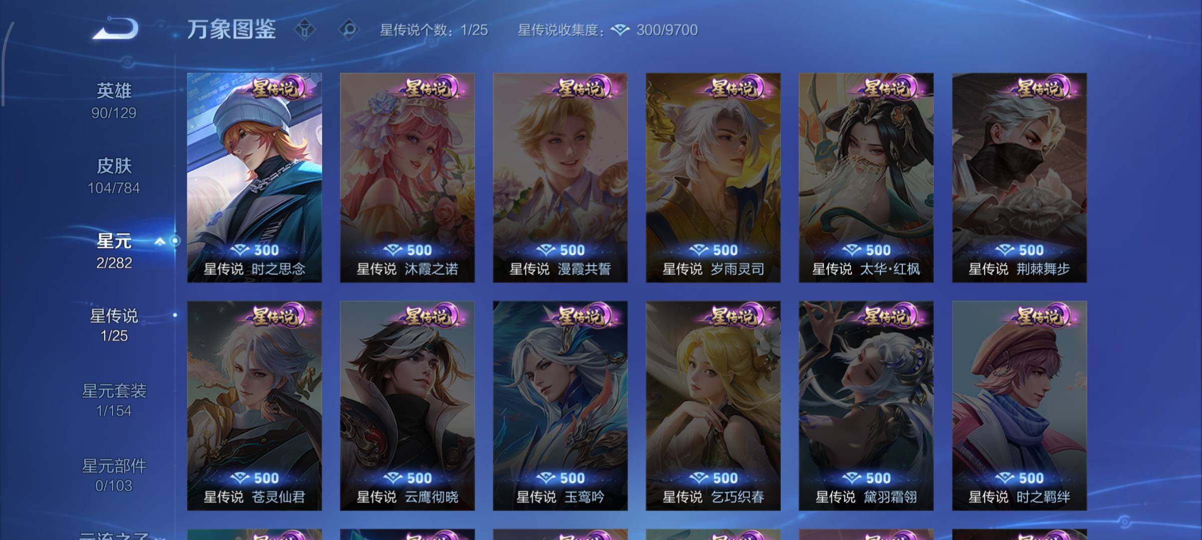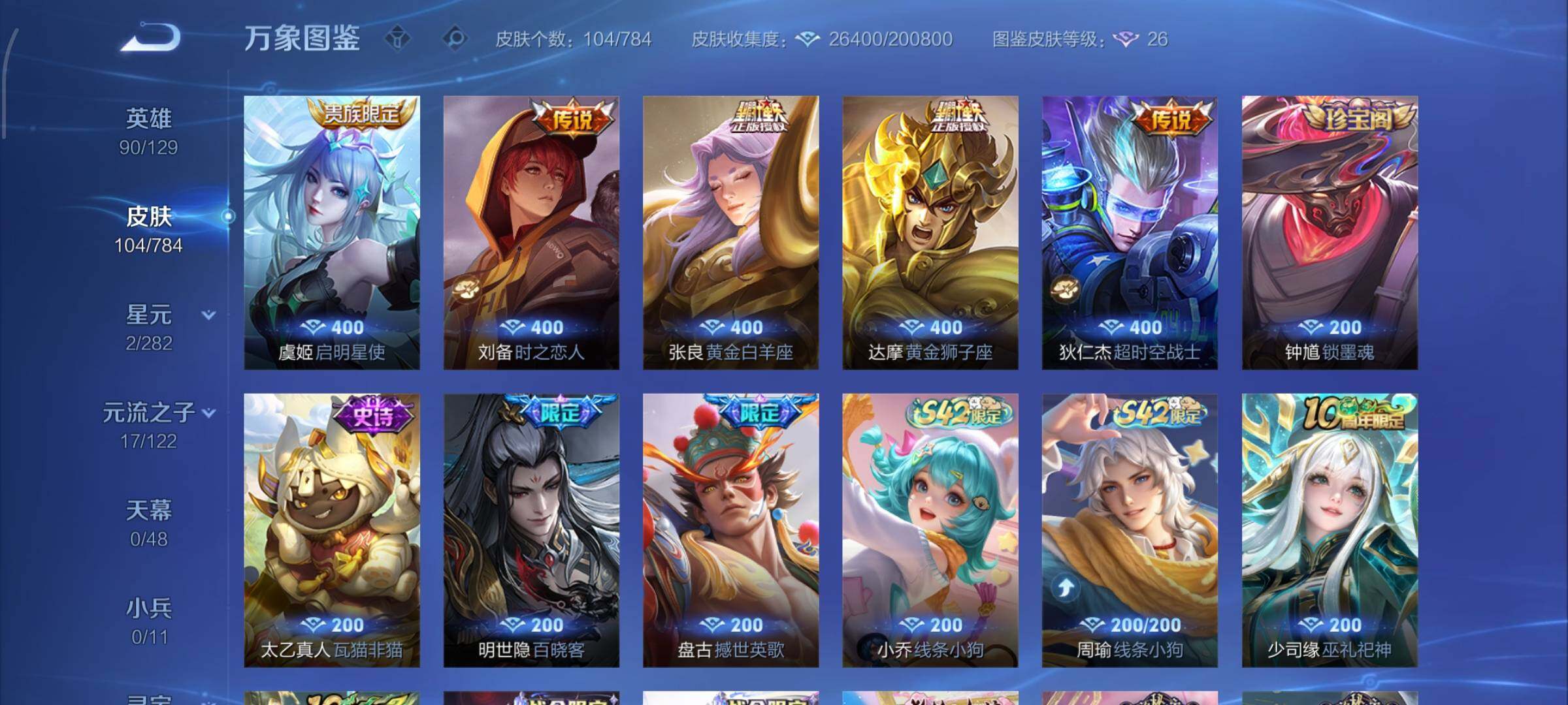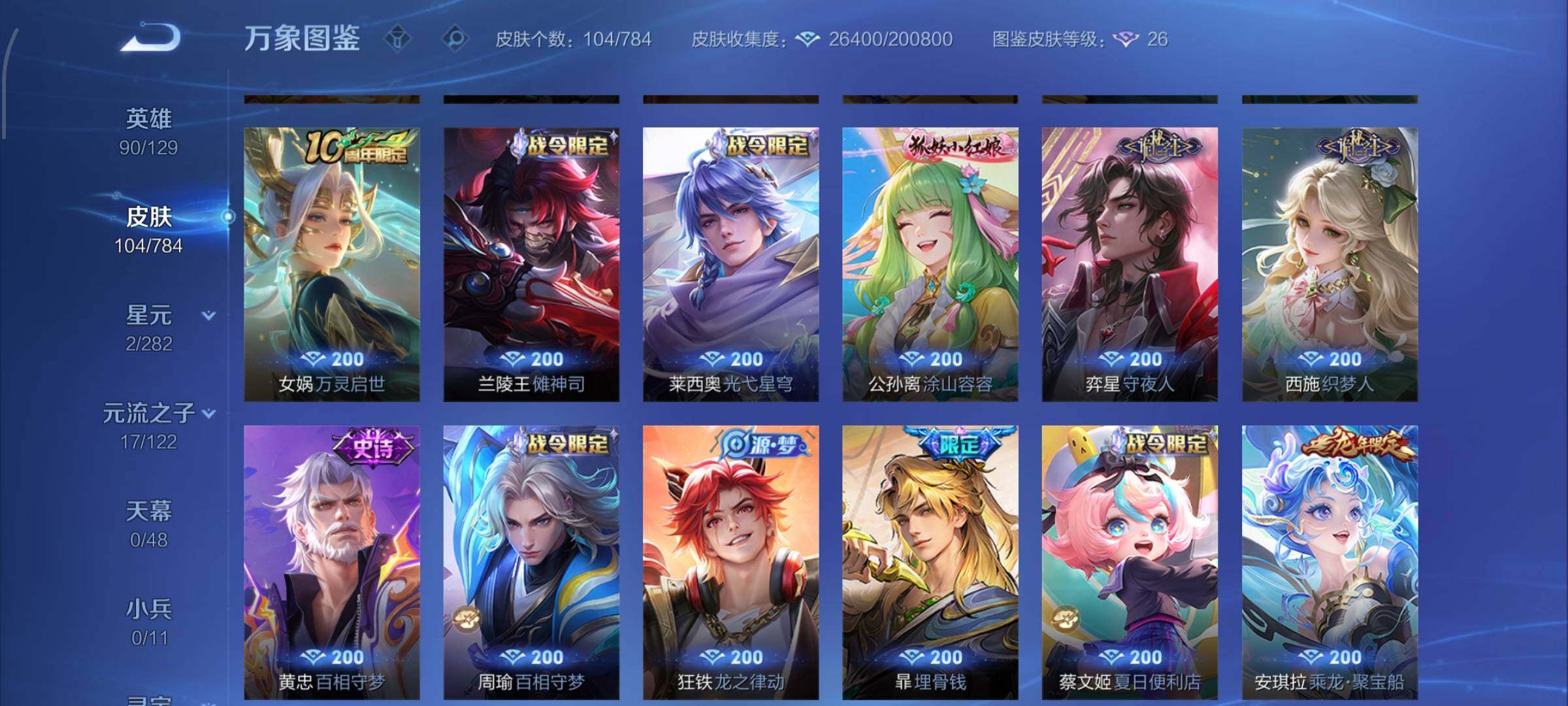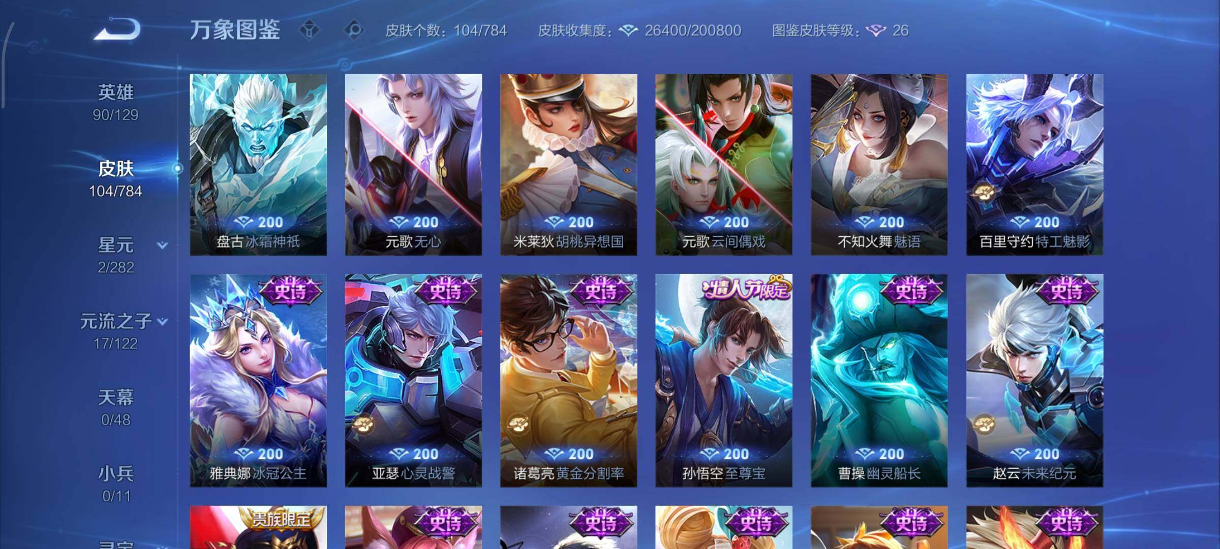 【史诗皮肤】:钟馗锁墨魂,太乙真人瓦猫非猫,明世隐百晓客,盘古撼世英歌,周瑜线条小狗,小乔线条小狗,少司缘巫礼祀神,女娲万灵启世,兰陵王傩神司,莱西奥光弋星穹,公孙离涂山容容,弈星守夜人,西施织梦人,黄忠百相守梦,周瑜百相守梦,狂铁龙之律动,暃埋骨钱,蔡文姬夏日便利店,安琪拉乘龙聚宝船,盘古冰霜神祇,元歌无心,米莱狄胡桃异想国,元歌云间偶戏,不知火舞魅语,百里守约特工魅影,雅典娜冰冠公主,亚瑟心灵战警,诸葛亮黄金分割率,孙悟空至尊宝,曹操幽灵船长,刘禅绅士熊喵,妲己魅力维加斯,嬴政摇滚巨星,孙尚香水果甜心,宫本武藏鬼剑武藏,狄仁杰魔术师,王昭君偶像歌手,貂蝉圣诞恋歌,赵云未来纪元,赵云皇家上将