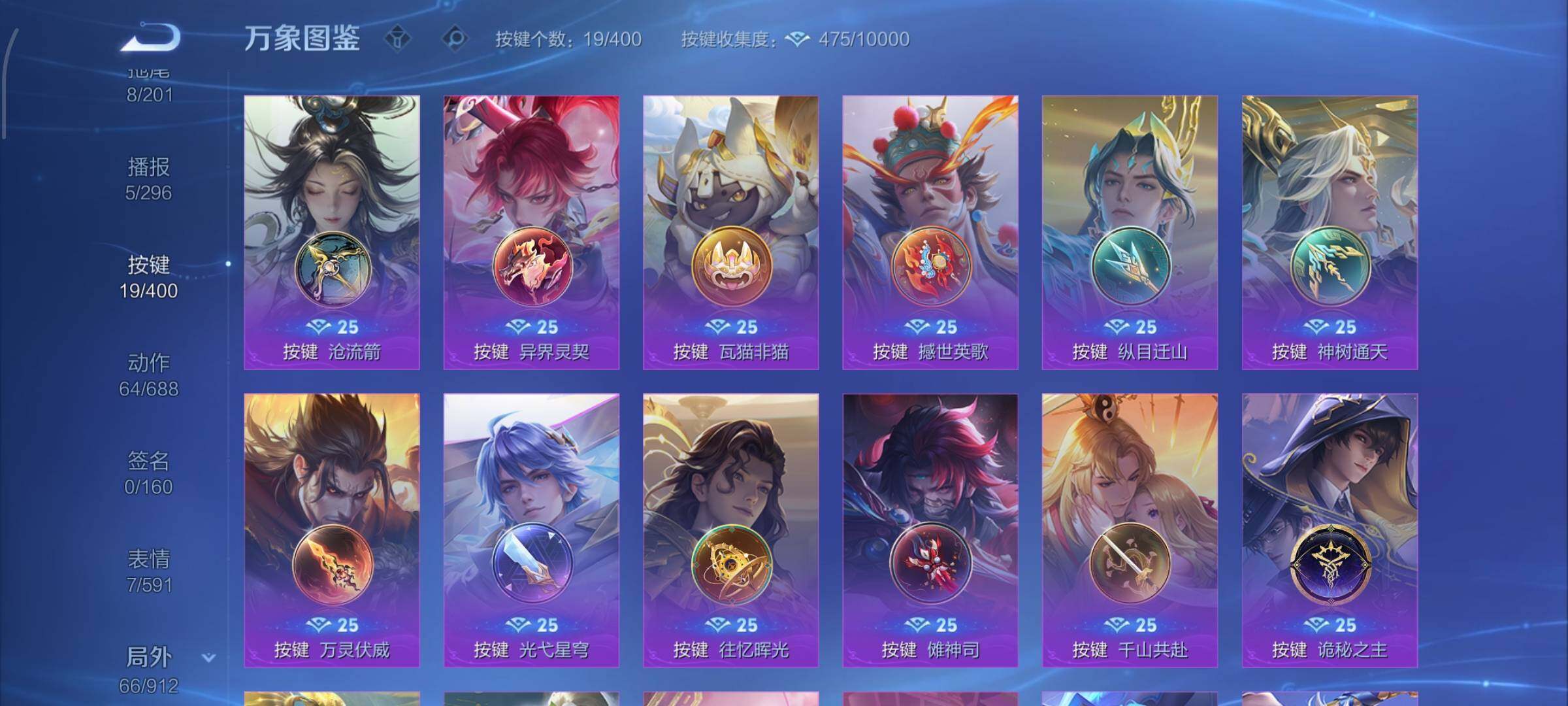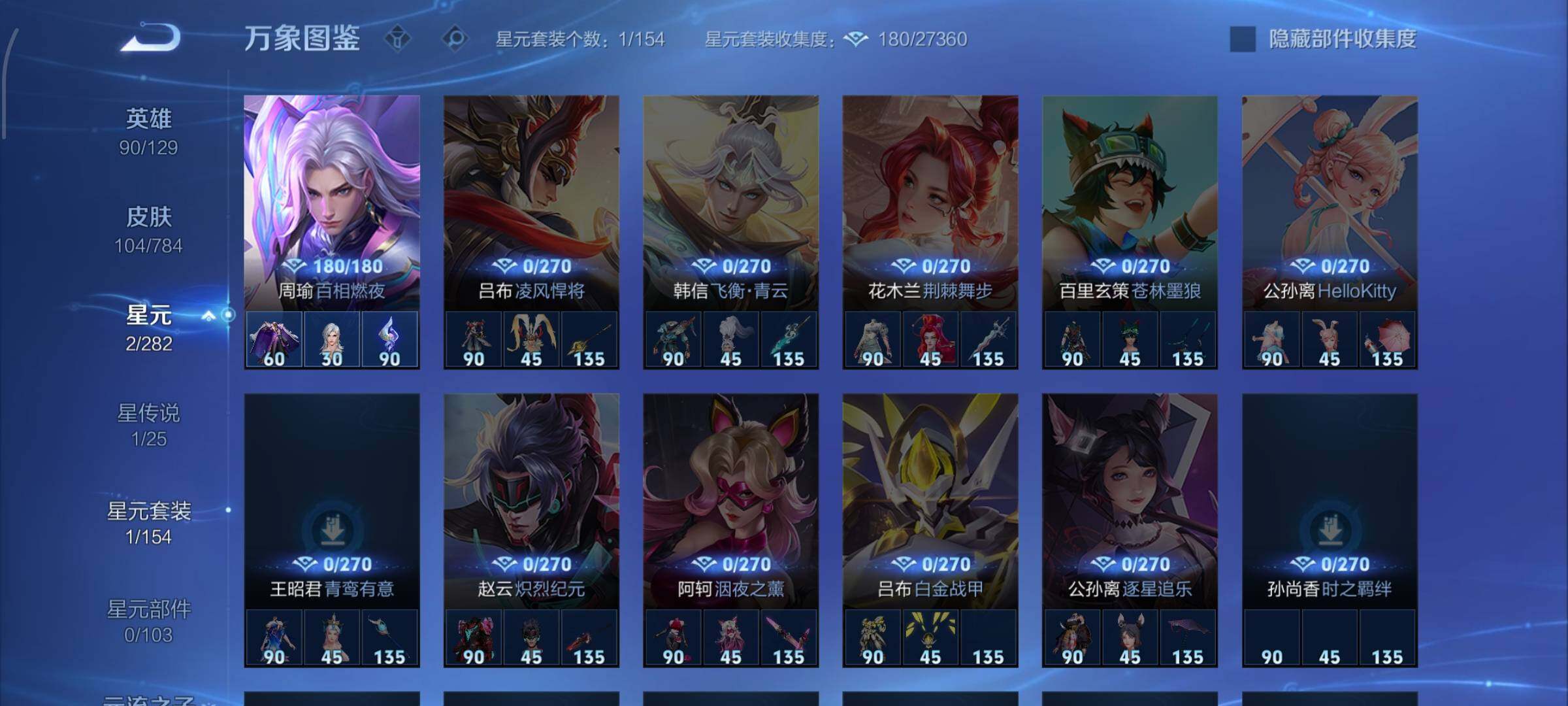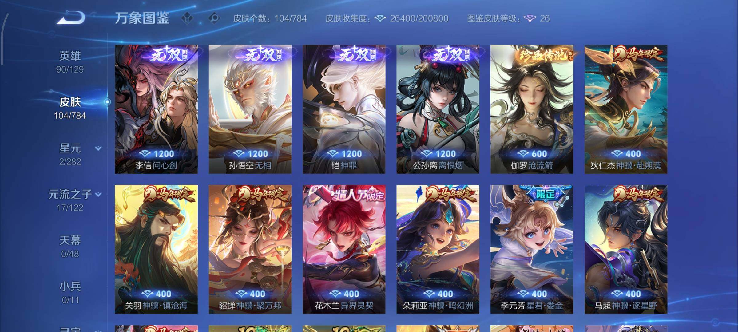 【其他皮肤】:吕布舞狮寰,鲁班七号班班快跑,妲己线条小狗,桑启线条小狗,安琪拉糖果风暴,虞姬溯影追猎,蚩奼极光幻客,曹操逐霄之志,艾琳鹤鸣心笺,孙权径山谋武,张良罗小黑战记,明世隐往忆晖光,亚瑟荣光之誓,哪吒罗小黑战记,鬼谷子克喵,莱西奥踏浪烽翎,孙策百相守梦,云中君云械蓝图,甄姬逆浪荇歌,西施雪境奇遇,牛魔牛运亨通,典韦铁甲之心,盘古重装意志,王昭君幻想奇妙夜,狄仁杰阴阳师,宫本武藏万象初新,刘备万事如意,达摩拳王,亚瑟死亡骑士,赵云忍炎影,韩信街头霸王,项羽海滩派对,百里守约绝影神枪,马可波罗激情绿茵
