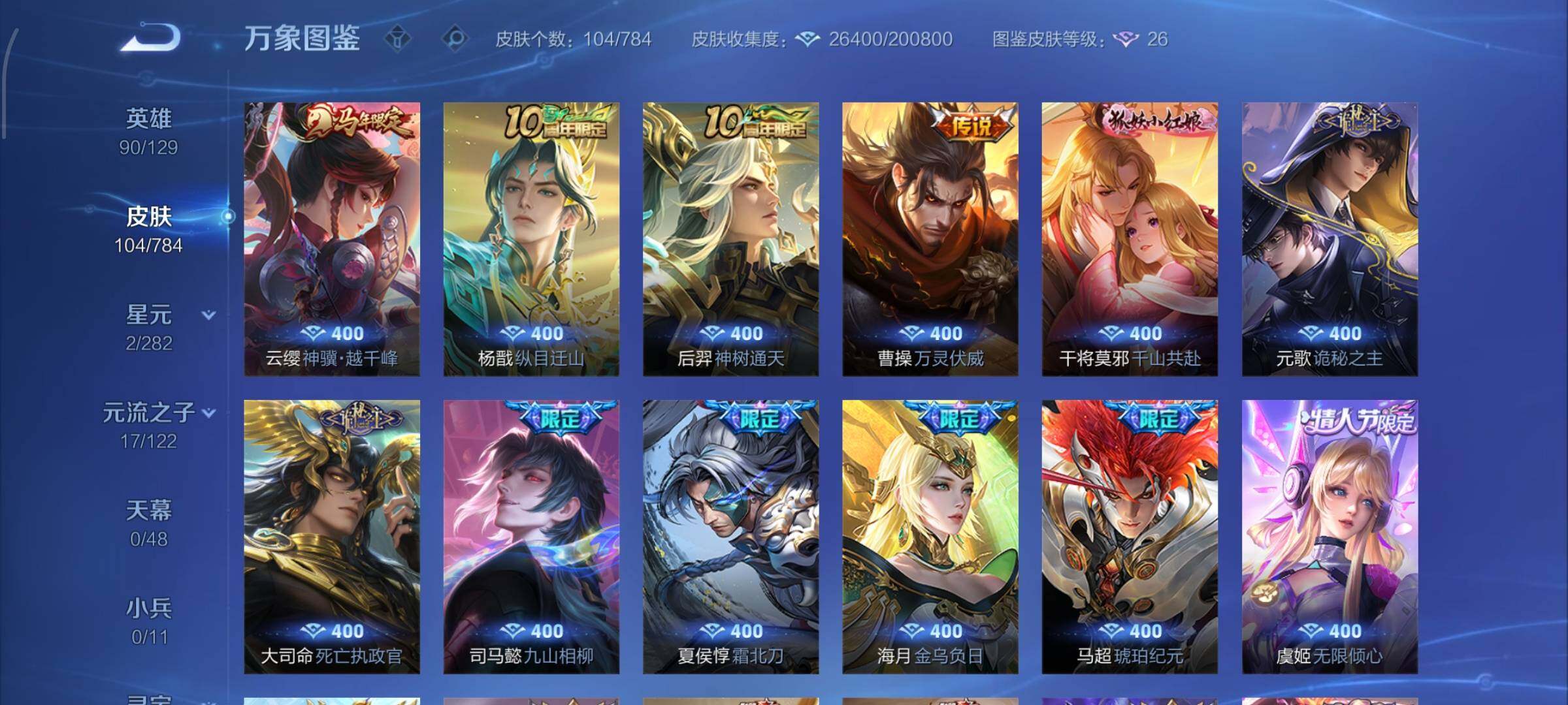 【限定皮肤】:公孙离离恨烟,夏侯惇霜北刀,暃埋骨钱,蔡文姬夏日便利店,狄仁杰阴阳师,赵云皇家上将,元歌云间偶戏,元歌无心,狄仁杰魔术师,项羽海滩派对,孙悟空至尊宝,虞姬启明星使,虞姬无限倾心,米莱狄胡桃异想国,盘古冰霜神祇,马超琥珀纪元,安琪拉乘龙聚宝船,海月金乌负日
