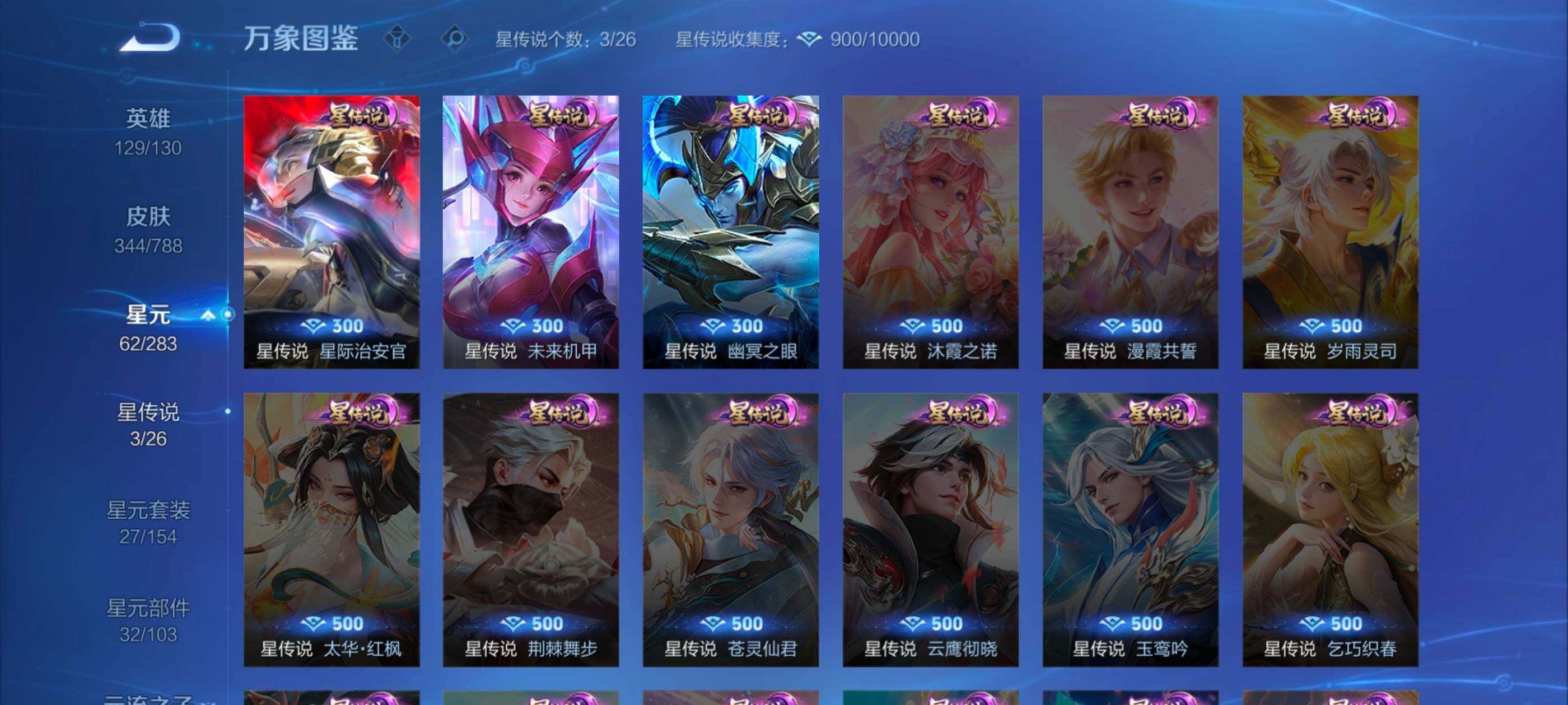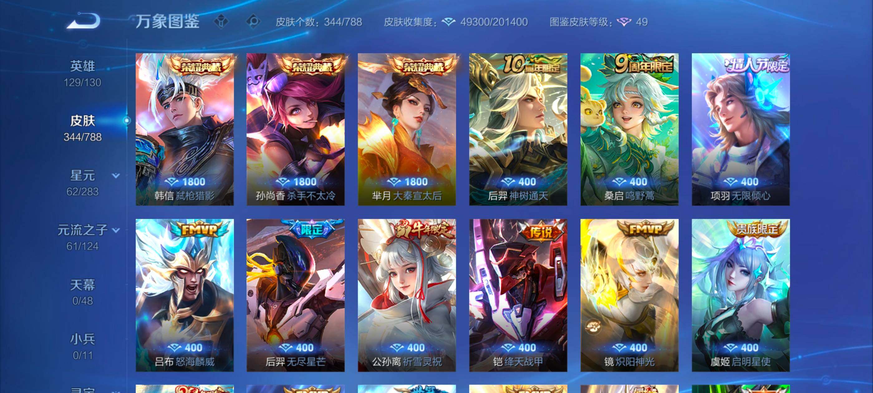 【传说皮肤】:后羿神树通天,桑启鸣野蒿,项羽无限倾心,吕布怒海麟威,后羿无尽星芒,公孙离祈雪灵祝,铠绛天战甲,镜炽阳神光,虞姬启明星使,伽罗太华,貂蝉猫影幻舞,虞姬云霓雀翎,花木兰冠军飞将,后羿黄金射手座,孙尚香末日机甲,宫本武藏地狱之眼,孙悟空地狱火,狄仁杰超时空战士