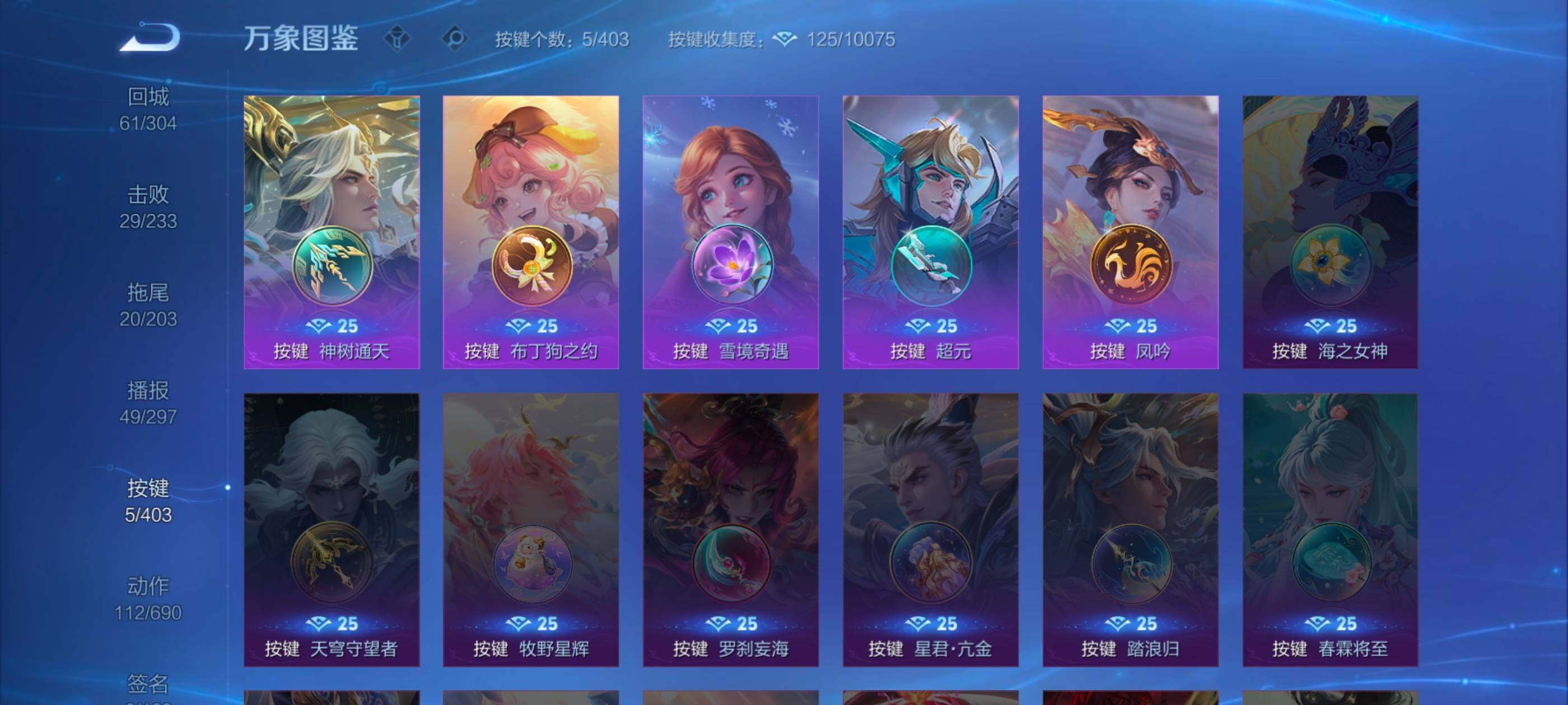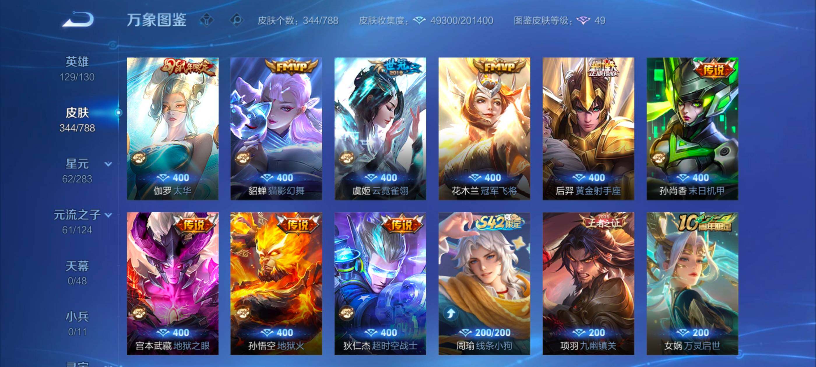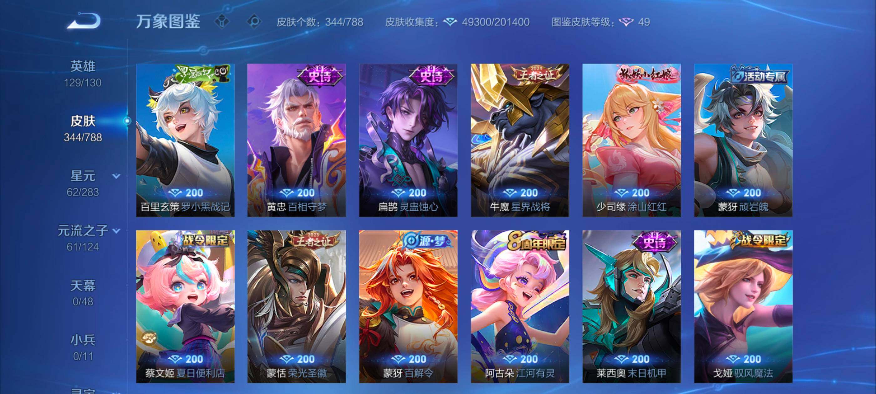 【史诗皮肤】:周瑜线条小狗,项羽九幽镇关,女娲万灵启世,百里玄策罗小黑战记,黄忠百相守梦,扁鹊灵蛊蚀心,牛魔星界战将,少司缘涂山红红,蒙犽顽岩魄,蔡文姬夏日便利店,蒙恬荣光圣徽,蒙犽百解令,阿古朵江河有灵,莱西奥末日机甲,戈娅驭风魔法,扁鹊奇幻香踪,马可波罗山海玄木吟,暃星界游侠,梦奇顽趣,狂铁电玩高手,雅典娜黎明之约,庄周高山流水,云中君纤云弄巧,裴擒虎李小龙,百里玄策原初追逐者,蒙犽狂想玩偶喵,马可波罗暗影游猎,瑶遇见神鹿,橘右京修罗,阿轲迷踪丽影,不知火舞魅语,小乔青蛇,娜可露露晚萤,蔡文姬繁星吟游,上官婉儿梁祝,兰陵王驯魔猎人,公孙离无限星赏官,狄仁杰鹰眼统帅,典韦蓝屏警告,孙策猫狗日记,嬴政白昼王子,杨玉环遇见飞天,阿轲节奏热浪,白起星夜王子,程咬金功夫厨神,李元芳逐浪之夏,刘禅天才门将,蔡文姬舞动绿茵,铠曙光守护者,百里守约特工魅影,安琪拉心灵骇客,雅典娜冰冠公主,亚瑟心灵战警,甄姬游园惊梦,诸葛亮黄金分割率,兰陵王暗隐猎兽者,小乔缤纷独角兽,夏侯惇乘风破浪,刘邦德古拉伯爵,花木兰水晶猎龙者,韩信白龙吟,张飞乱世虎臣,吕布末日机甲,李白千年之狐,曹操幽灵船长,刘禅绅士熊喵,吕布圣诞狂欢,墨子金属风暴,妲己女仆咖啡,妲己魅力维加斯,嬴政摇滚巨星,嬴政暗夜贵公子,孙尚香水果甜心,宫本武藏鬼剑武藏,廉颇地狱岩魂,狄仁杰魔术师,王昭君偶像歌手,甄姬冰雪圆舞曲,老夫子圣诞老人,貂蝉圣诞恋歌,赵云未来纪元,赵云皇家上将,钟无艳王者之锤,阿轲暗夜猫娘,露娜紫霞仙子,鲁班七号电玩小子