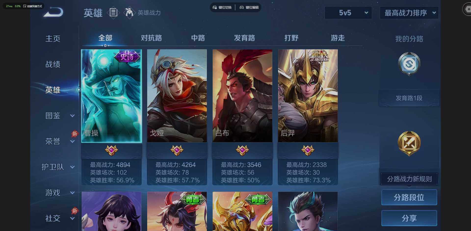 W10022【安卓区V8】可二次实名,英雄104,皮肤161,典藏:李白鸣剑.曳