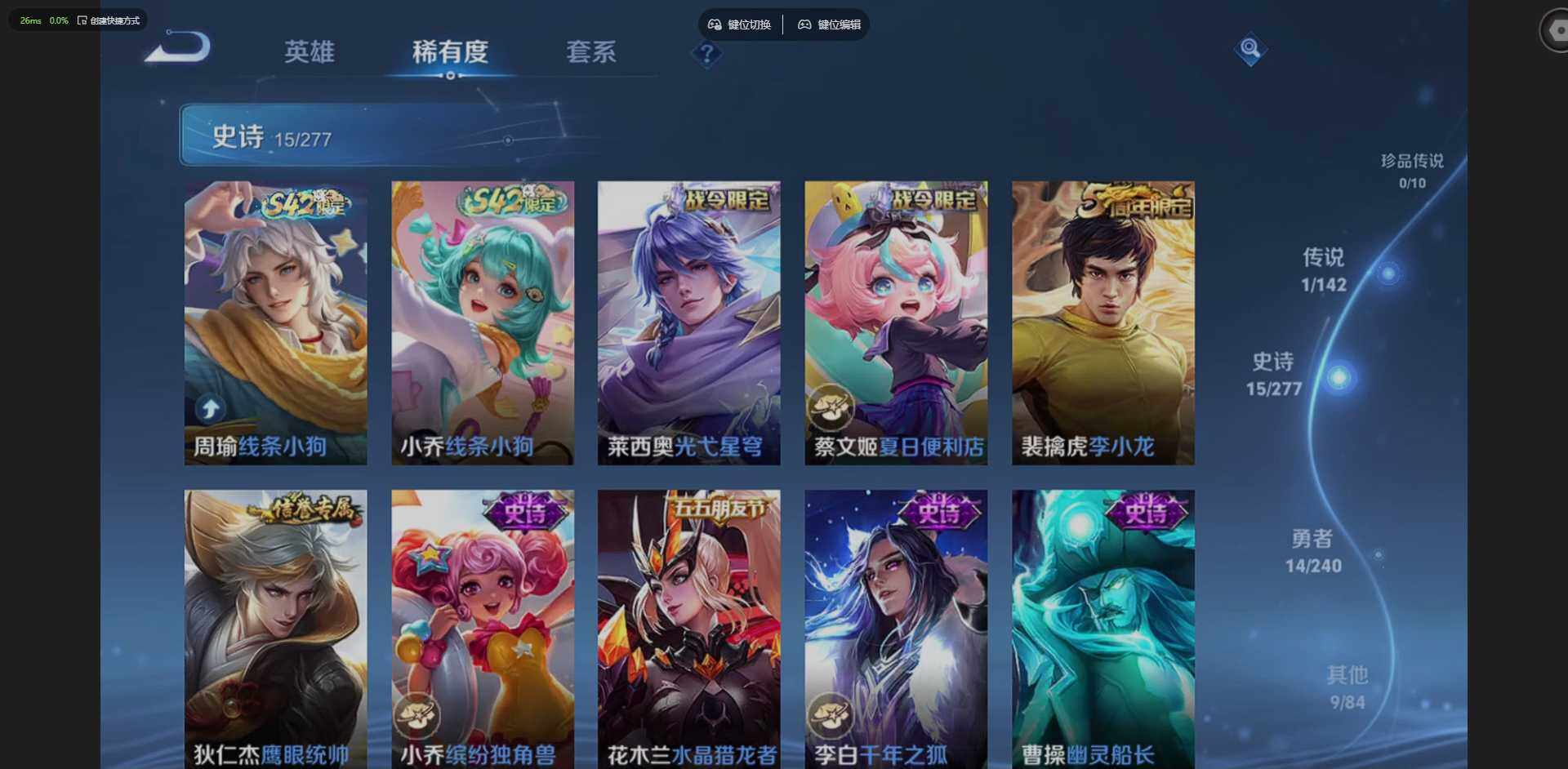 PX_2563015-贵族等级:,V3,英雄数:,57,皮肤数:,40,荣耀水晶:,最初的交响,星传说:,幽冥之眼,传说皮:,黄金射手座,限定皮:,李小龙