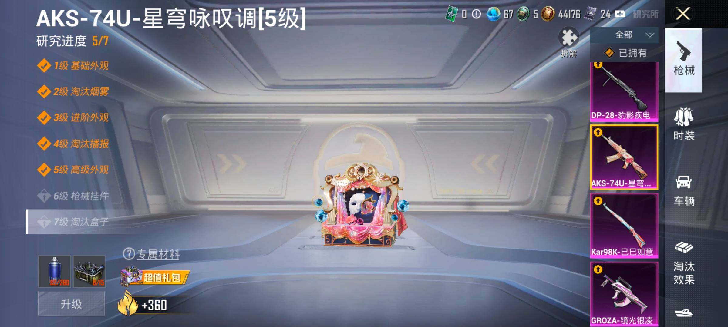 【4特效枪】,AKS-74U-星穹咏叹调,(5级),Kar98K-巳巳如意,(4级),DP-28-豹影疾电,(5级),GROZA-镜光银凌,(5级),