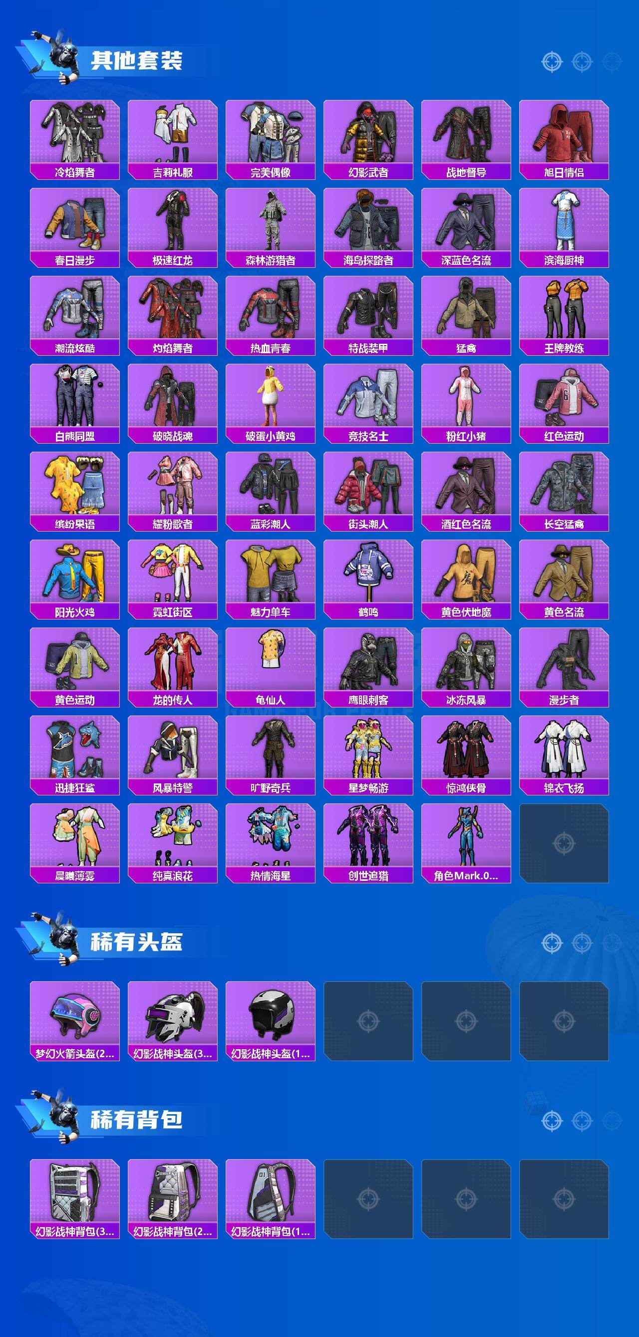 【稀有套装】:套装-龟仙人,套装-巳巳如意,套装-超能元气,套装-雪国风尚,套装-炫彩糖果,角色-幸运青,套装-马上有钱,套装-迅捷龙虾,套装-遗迹猎人,套装-雏菊兔兔,套装-萝兰蝴蝶,套装-小熊娃娃,角色-达芬奇,角色-临安公主,套装-燕燕于飞,套装-鱼渊荷华,套装-粉恋花,套装-紫幽梦,套装-蓝冰羽,套装-星影赞美诗,套装-星渊小夜曲,套装-彩虹兔,套装-云朵鹅,套装-雪绒豹,角色-乐音,角色-夜瞳黯灵,套装-朱霞炽焰,套装-凌霄紫焰,角色-绯色魅影,角色-紫俏灵猫,套装-书海巡游,套装-画境星梦,套装-琴音绮想,套装-雨过天青,套装-红釉青花,角色-枫露凝珀,套装-燕雀桃枝