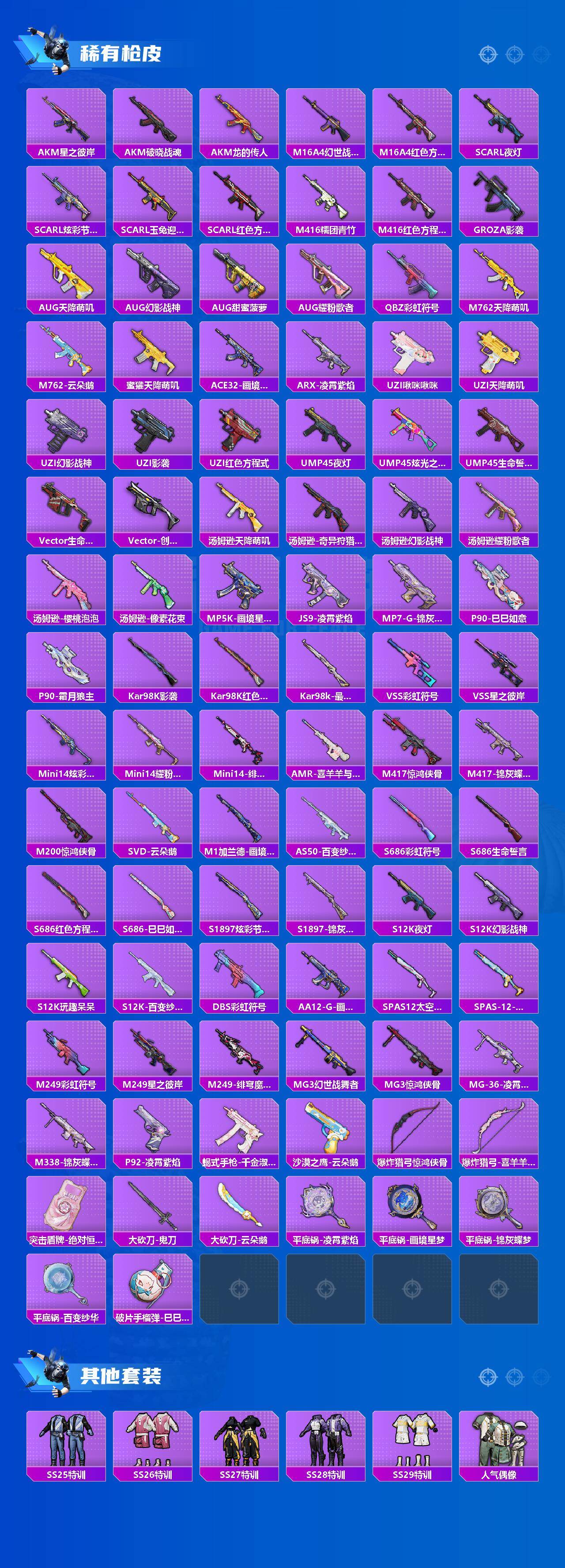 【粉色枪皮】:蜜獾-异瞳寒姬,ACE32-萌骑漫游,ACE32-百变纱华,ARX-无垠阁,AKS-74U-森灵之息,P90-诸神·破晓,Kar98K-巳巳如意,Mk14-福马献瑞,DP-28-豹影疾电