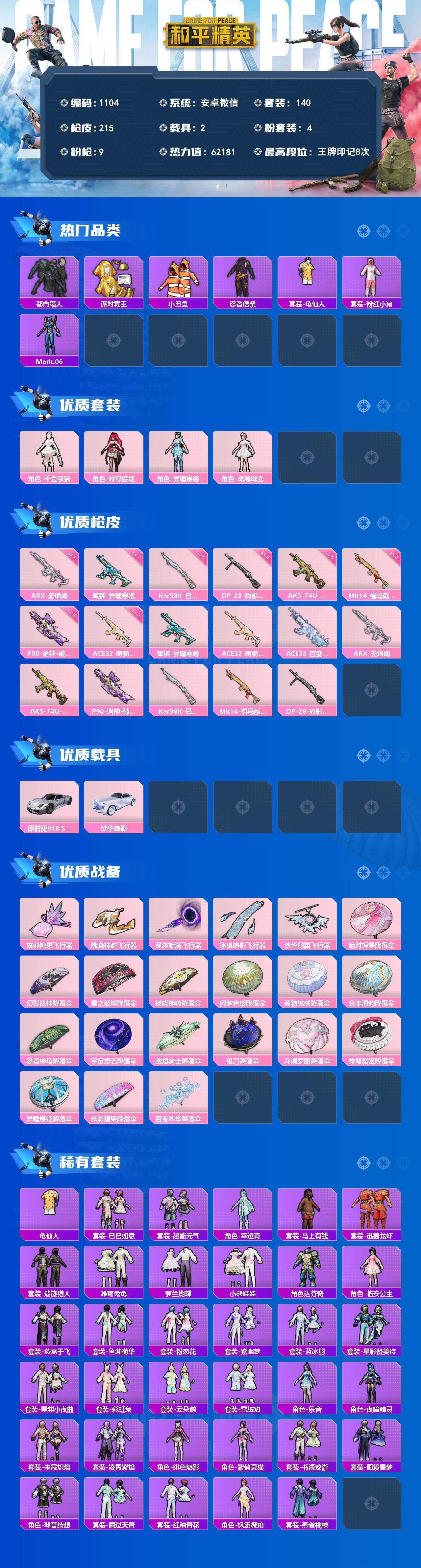 PX_2562935-装碎片-连体王者打野23段2星元9传说1典藏-地铁满天赋0违规【新红装敞篷车皮,异瞳寒姬,绯穹魔姬,千金淑猫,鸢尾珑雾,都市,金鞋,小丑鱼,忍者信条,龟仙人,粉红小猪,Mark.06】安卓,微信-4粉装-9特效枪-2载具-5粉色飞行器-62181热力值-8王牌印记-140套装-215枪皮