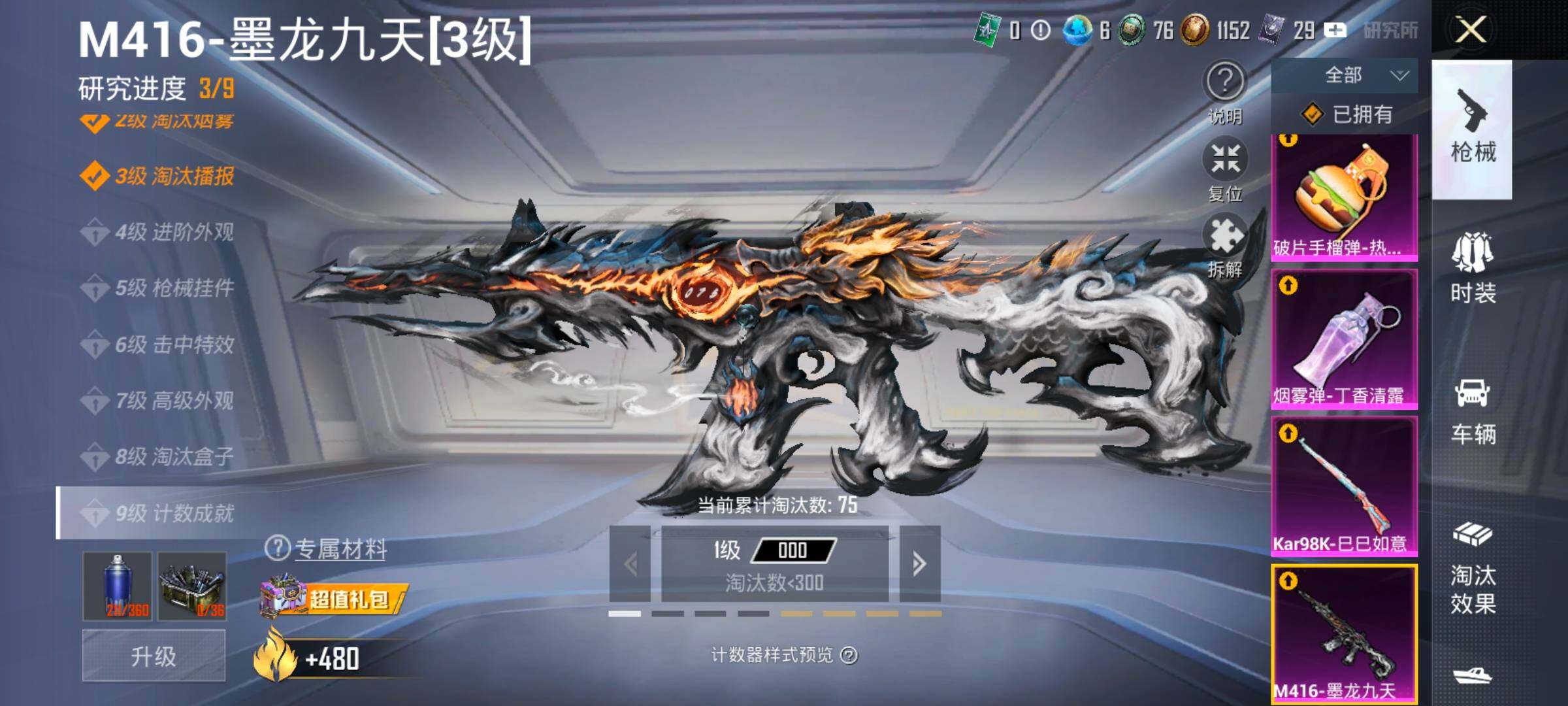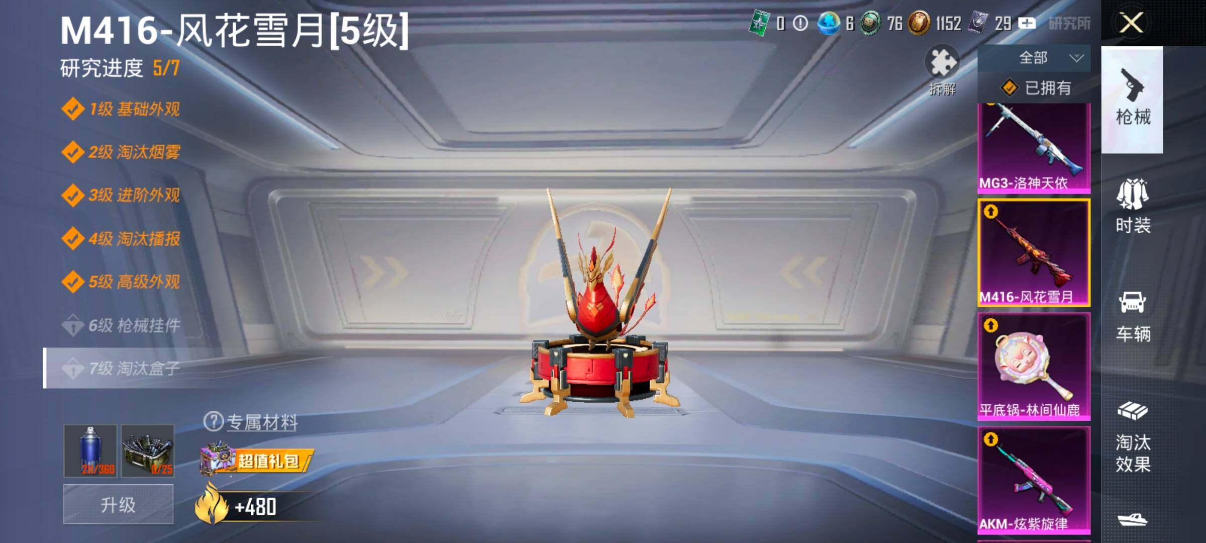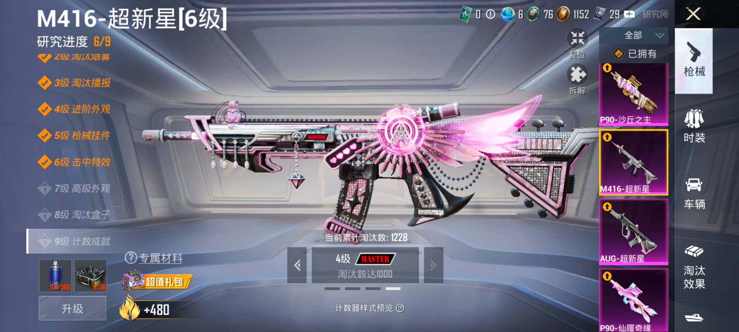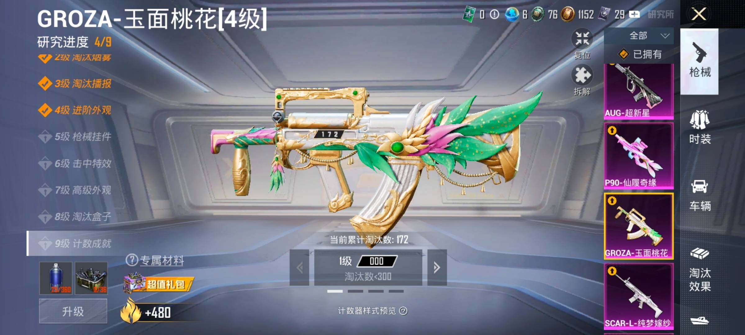 【30特效枪】,M416-五爪金龙,(1级),SCAR-L-纯梦嫁纱,(1级),M416-墨龙九天,(3级),M416-超新星,(6级),P90-沙丘之主,(1级),AKM-炫紫旋律,(1级),Mini14-龙虾霸霸,(1级),AKS-74U-森灵之息,(5级),Kar98K-巳巳如意,(5级),M24-暗星紫秘,(3级),DP-28-豹影疾电,(5级),AUG-超新星,(2级),M762-甜心娃娃,(4级),SCAR-L-天蓬元帅,(7级),Mini14-绚金瑰梦,(5级),Kar98K-绿意幻情,(3级),GROZA-玉面桃花,(4级),P90-仙履奇缘,(5级),UMP45-玉魂晶魄,(4级),AKM-盖世英雄,(7级),M416-风花雪月,(5级),MG3-洛神天依,(4级),Vector-红伞翩翩,(5级),S12K-海渊国主,(4级),Mk14-福马献瑞,(5级),AA12-G-萌骑幻想,(1级),平底锅-林间仙鹿,(2级),GROZA-焦糖拿铁,(1级),破片手榴弹-热量炸弹,(6级),烟雾弹-丁香清露,(4级),
