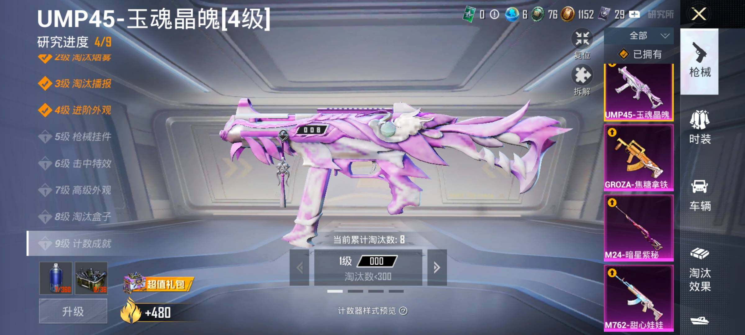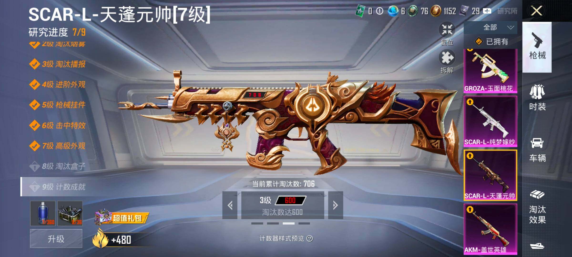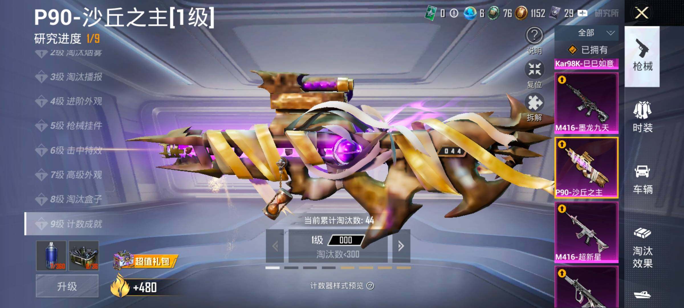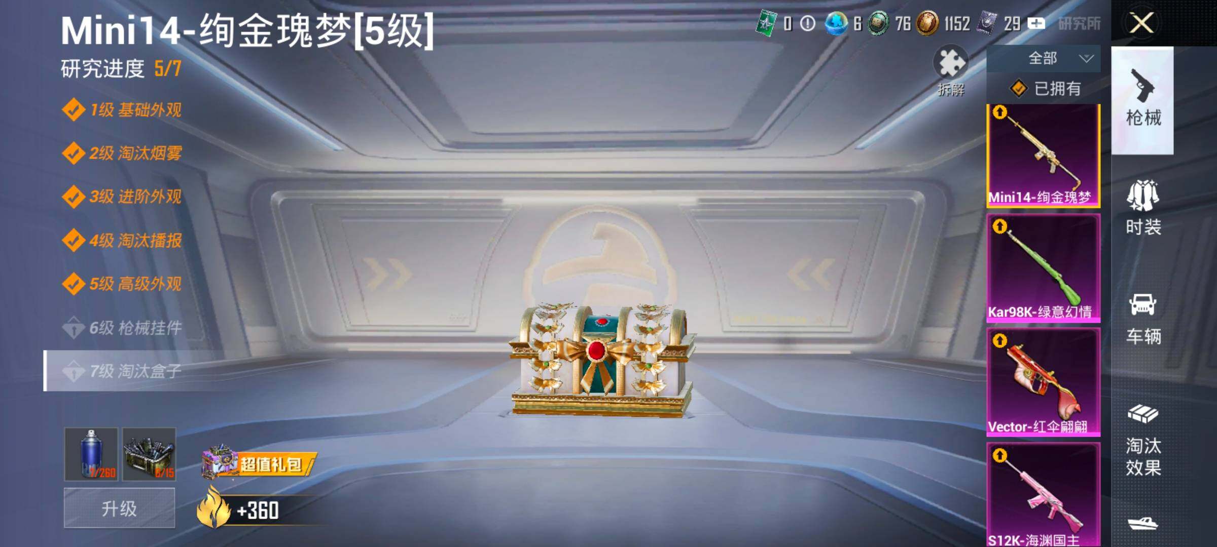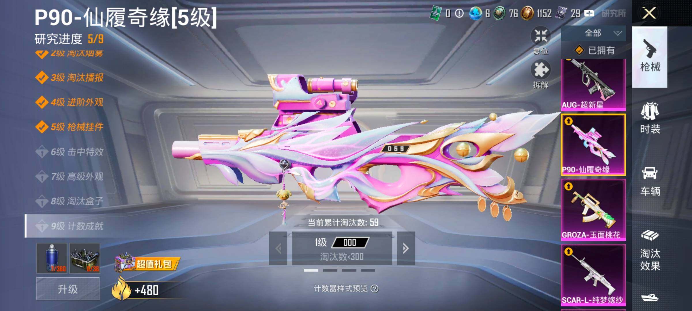 【30特效枪】,M416-五爪金龙,(1级),SCAR-L-纯梦嫁纱,(1级),M416-墨龙九天,(3级),M416-超新星,(6级),P90-沙丘之主,(1级),AKM-炫紫旋律,(1级),Mini14-龙虾霸霸,(1级),AKS-74U-森灵之息,(5级),Kar98K-巳巳如意,(5级),M24-暗星紫秘,(3级),DP-28-豹影疾电,(5级),AUG-超新星,(2级),M762-甜心娃娃,(4级),SCAR-L-天蓬元帅,(7级),Mini14-绚金瑰梦,(5级),Kar98K-绿意幻情,(3级),GROZA-玉面桃花,(4级),P90-仙履奇缘,(5级),UMP45-玉魂晶魄,(4级),AKM-盖世英雄,(7级),M416-风花雪月,(5级),MG3-洛神天依,(4级),Vector-红伞翩翩,(5级),S12K-海渊国主,(4级),Mk14-福马献瑞,(5级),AA12-G-萌骑幻想,(1级),平底锅-林间仙鹿,(2级),GROZA-焦糖拿铁,(1级),破片手榴弹-热量炸弹,(6级),烟雾弹-丁香清露,(4级),