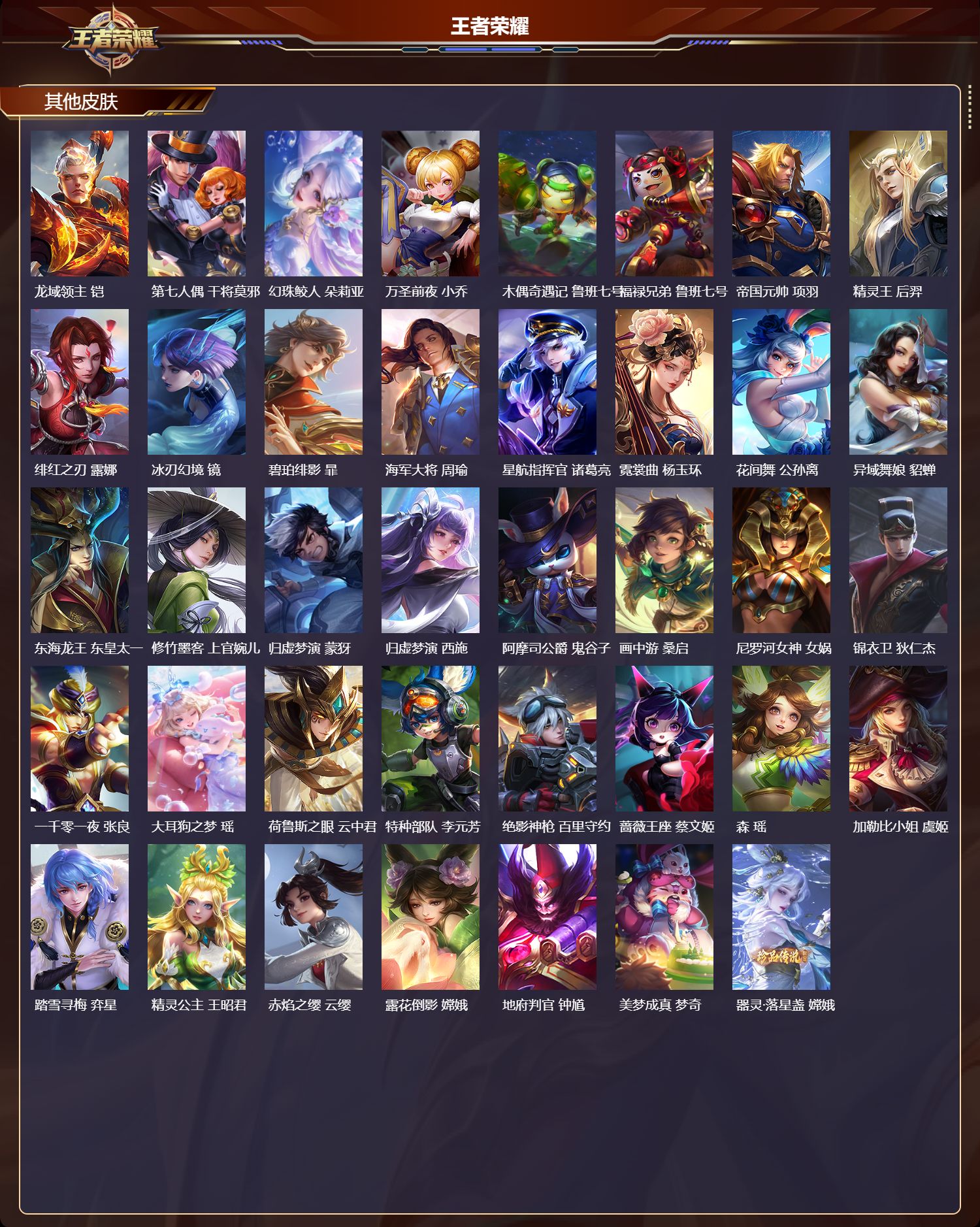 【43,其他皮肤】伊势巫女,大乔,前尘,金蝉,棒球奇才,沈梦溪,极冰防御线,盾山,龙域领主,铠,第七人偶,干将莫邪,幻珠鲛人,朵莉亚,万圣前夜,小乔,木偶奇遇记,鲁班七号,福禄兄弟,鲁班七号,帝国元帅,项羽,精灵王,后羿,绯红之刃,露娜,冰刃幻境,镜,碧珀绯影,暃,海军大将,周瑜,星航指挥官,诸葛亮,霓裳曲,杨玉环,花间舞,公孙离,异域舞娘,貂蝉,东海龙王,东皇太一,修竹墨客,上官婉儿,归虚梦演,蒙犽,归虚梦演,西施,阿摩司公爵,鬼谷子,画中游,桑启,尼罗河女神,女娲,锦衣卫,狄仁杰,一千零一夜,张良,大耳狗之梦,瑶,荷鲁斯之眼,云中君,特种部队,李元芳,绝影神枪,百里守约,蔷薇王座,蔡文姬,森,瑶,加勒比小姐,虞姬,踏雪寻梅,弈星,精灵公主,王昭君,赤焰之缨,云缨,露花倒影,嫦娥,地府判官,钟馗,美梦成真,梦奇,器灵·落星盏,嫦娥,