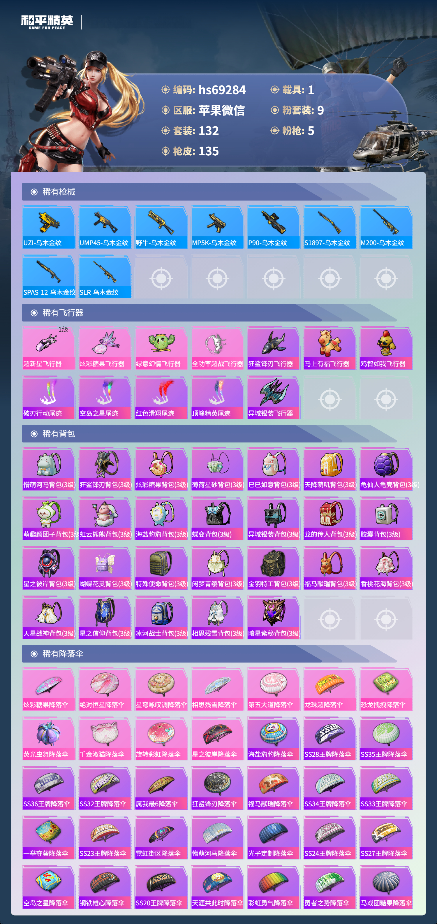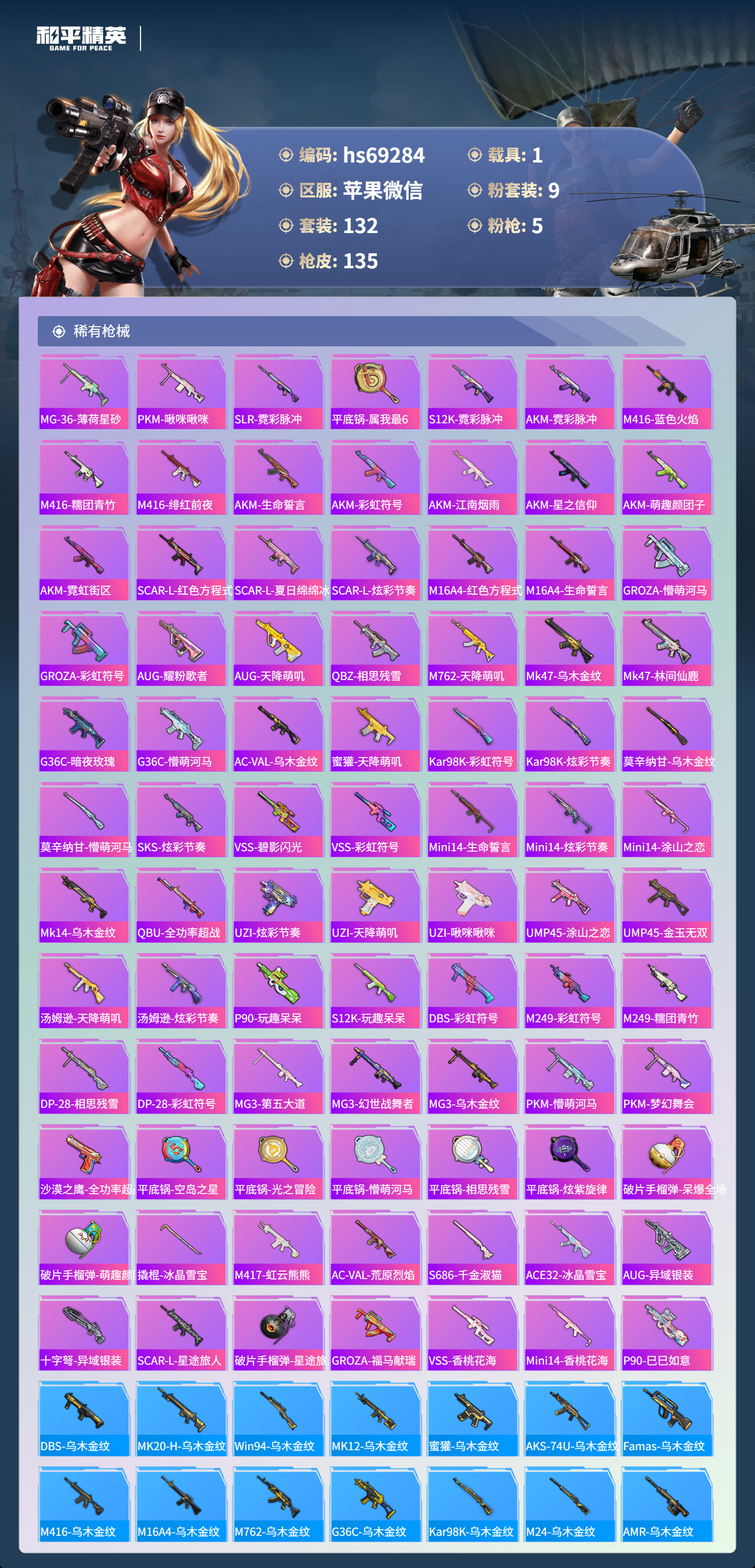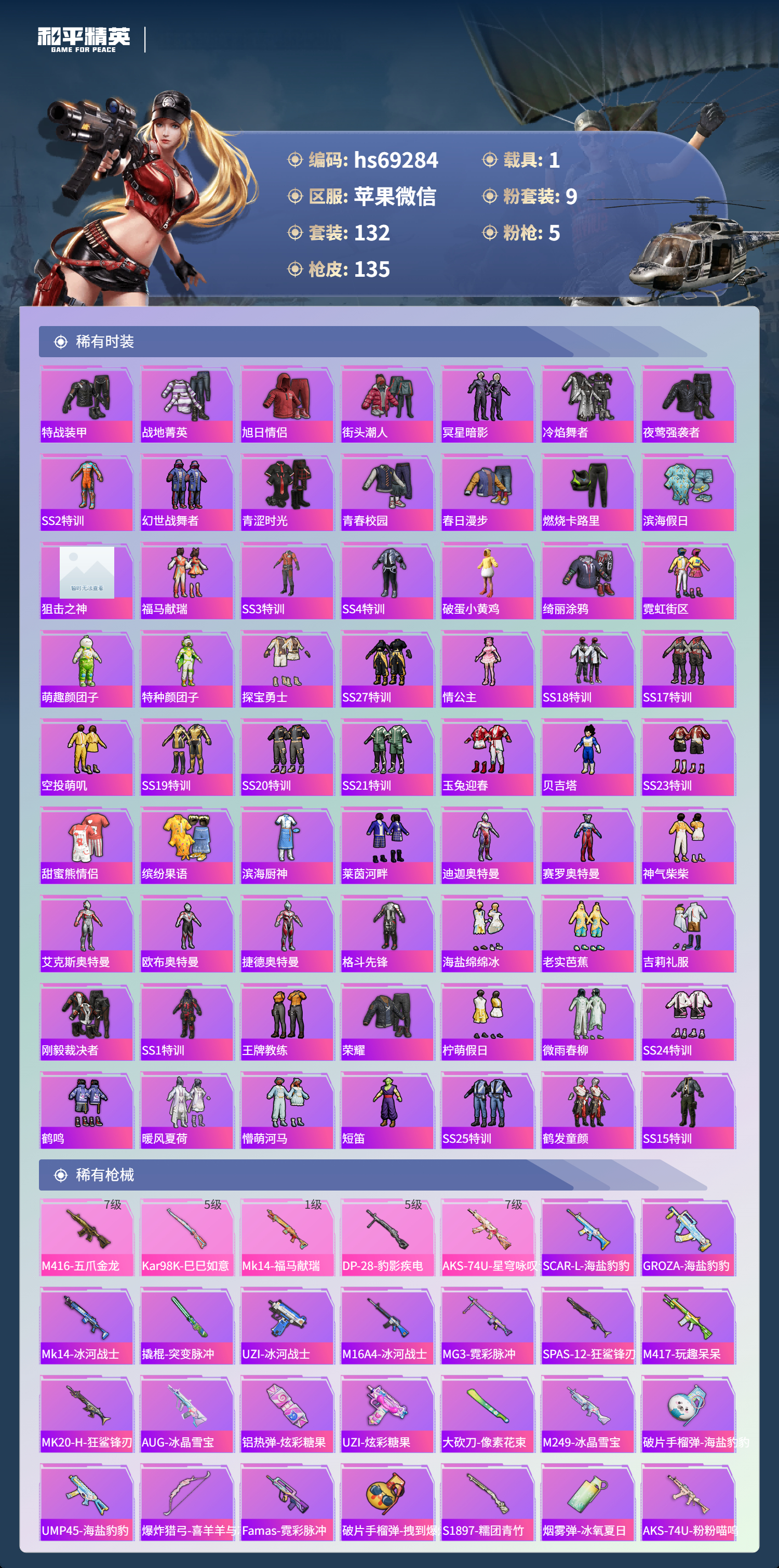 PX_2563359-,苹果微信-20王牌印记-9粉装-5特效枪-1载具-50285热力值-132套装-135枪皮-10卓越印记-1传奇印记