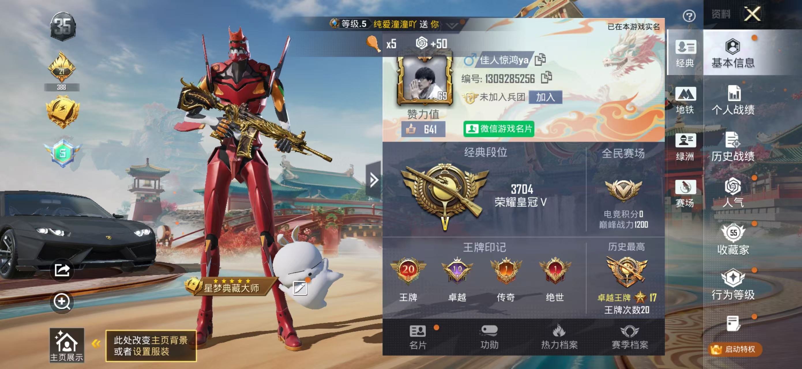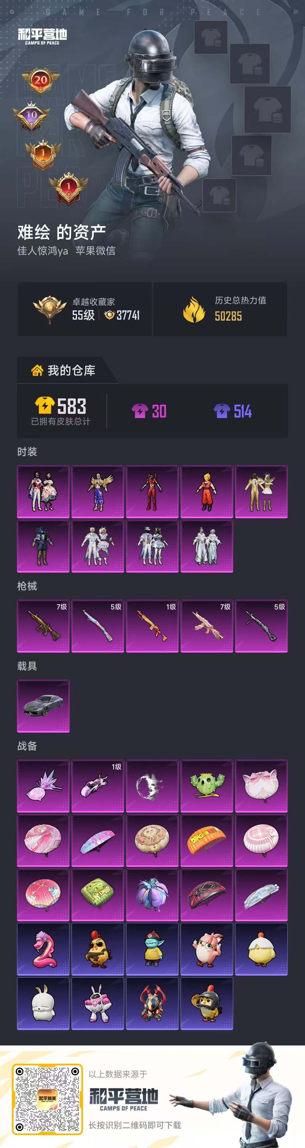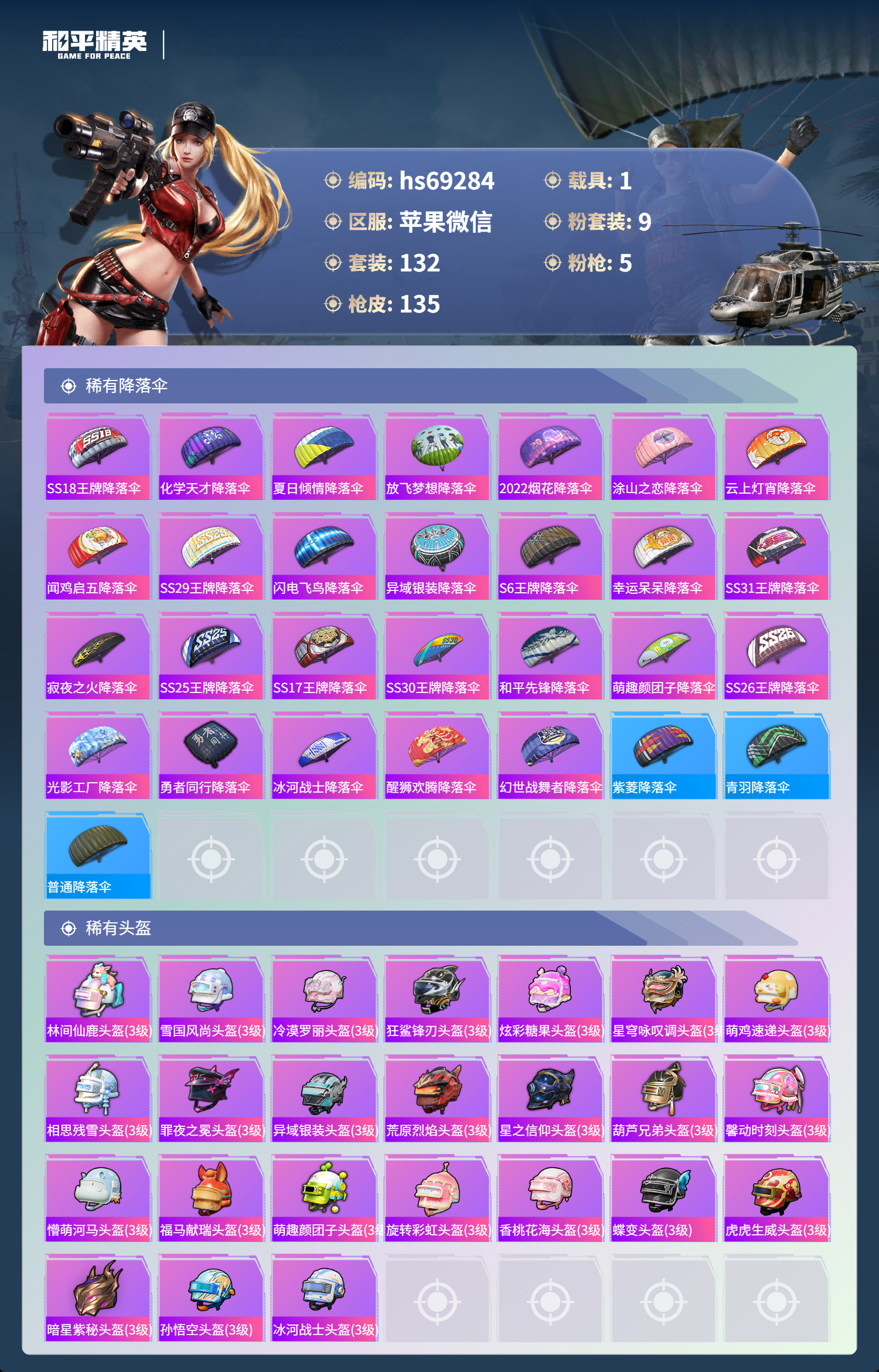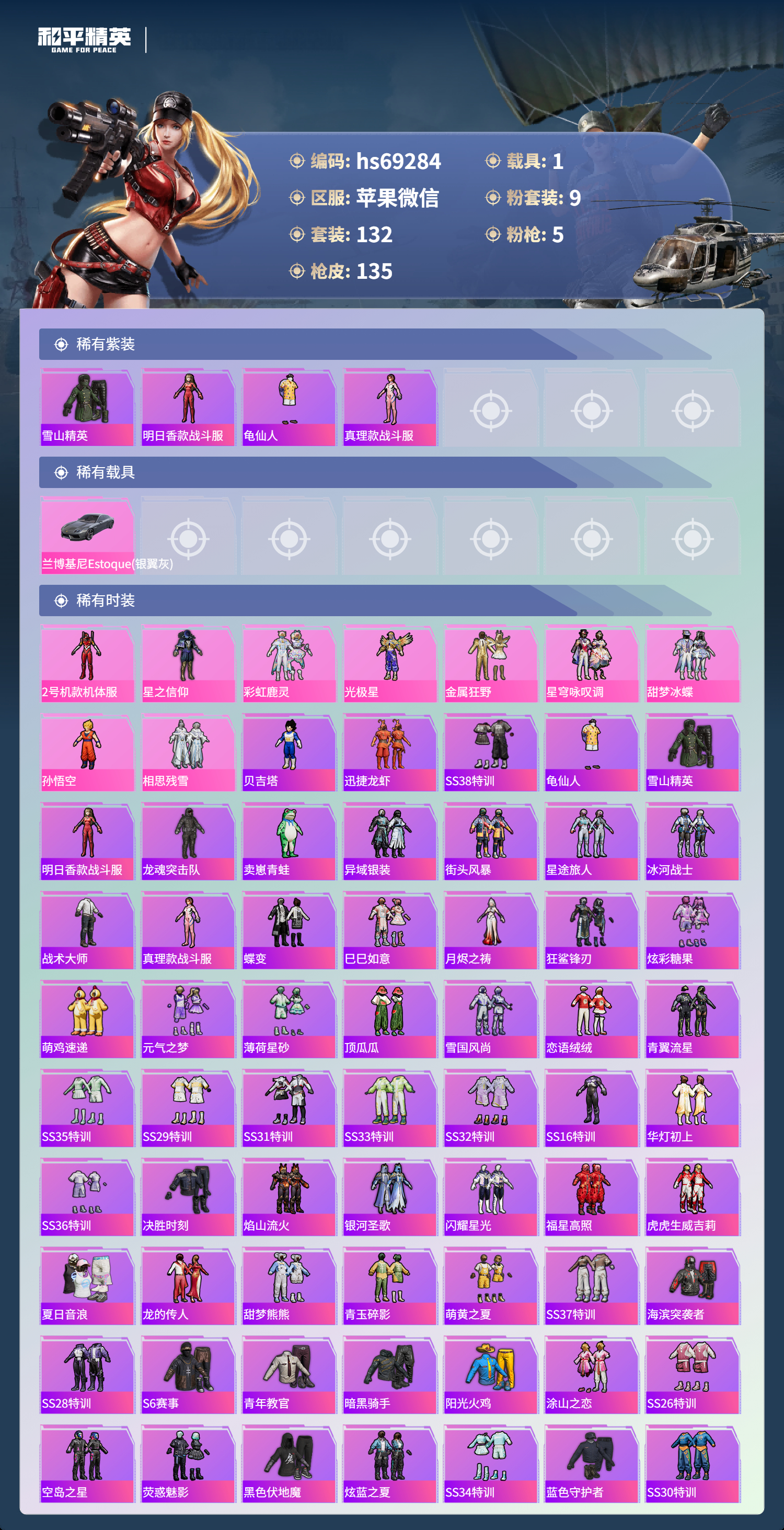 PX_2563359-,苹果微信-20王牌印记-9粉装-5特效枪-1载具-50285热力值-132套装-135枪皮-10卓越印记-1传奇印记