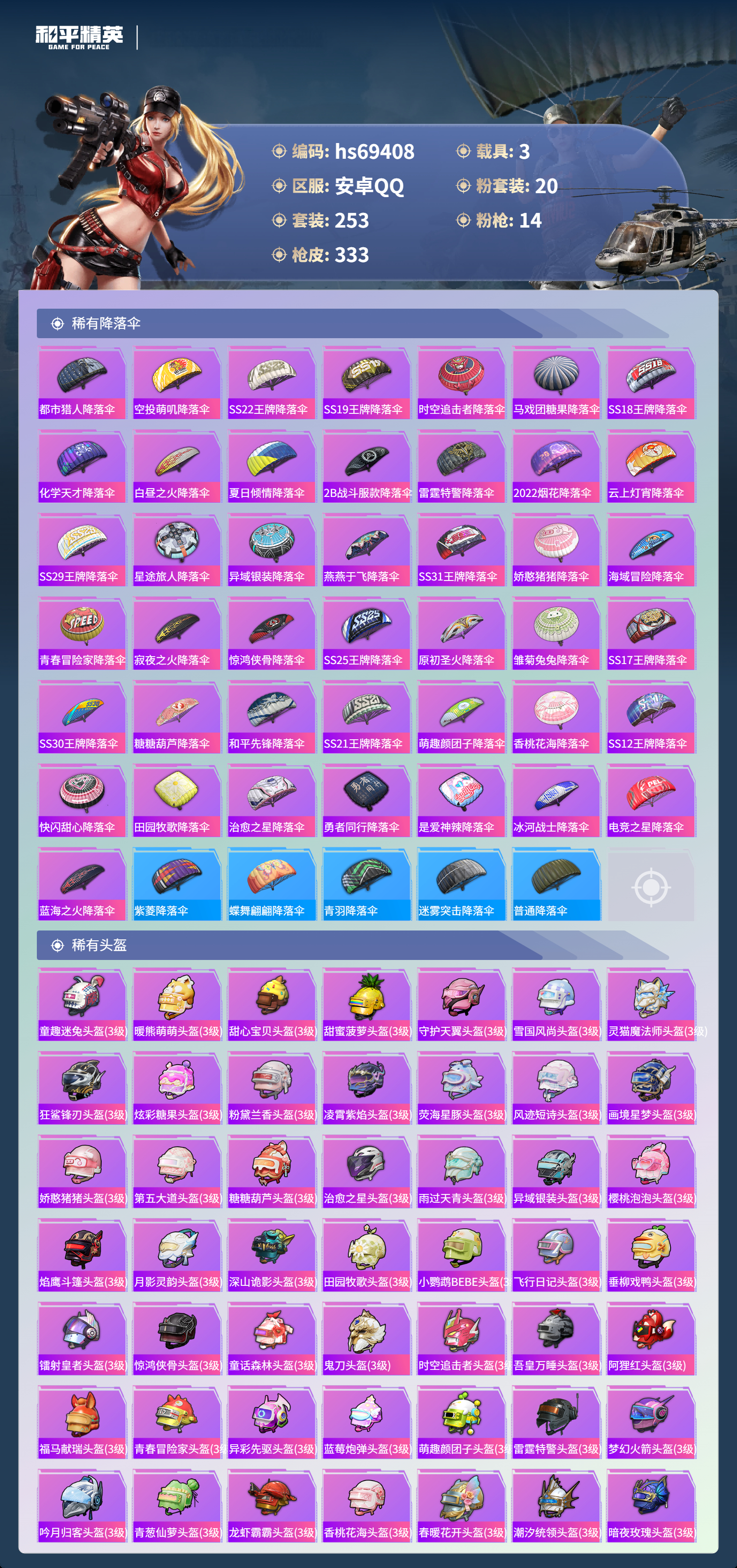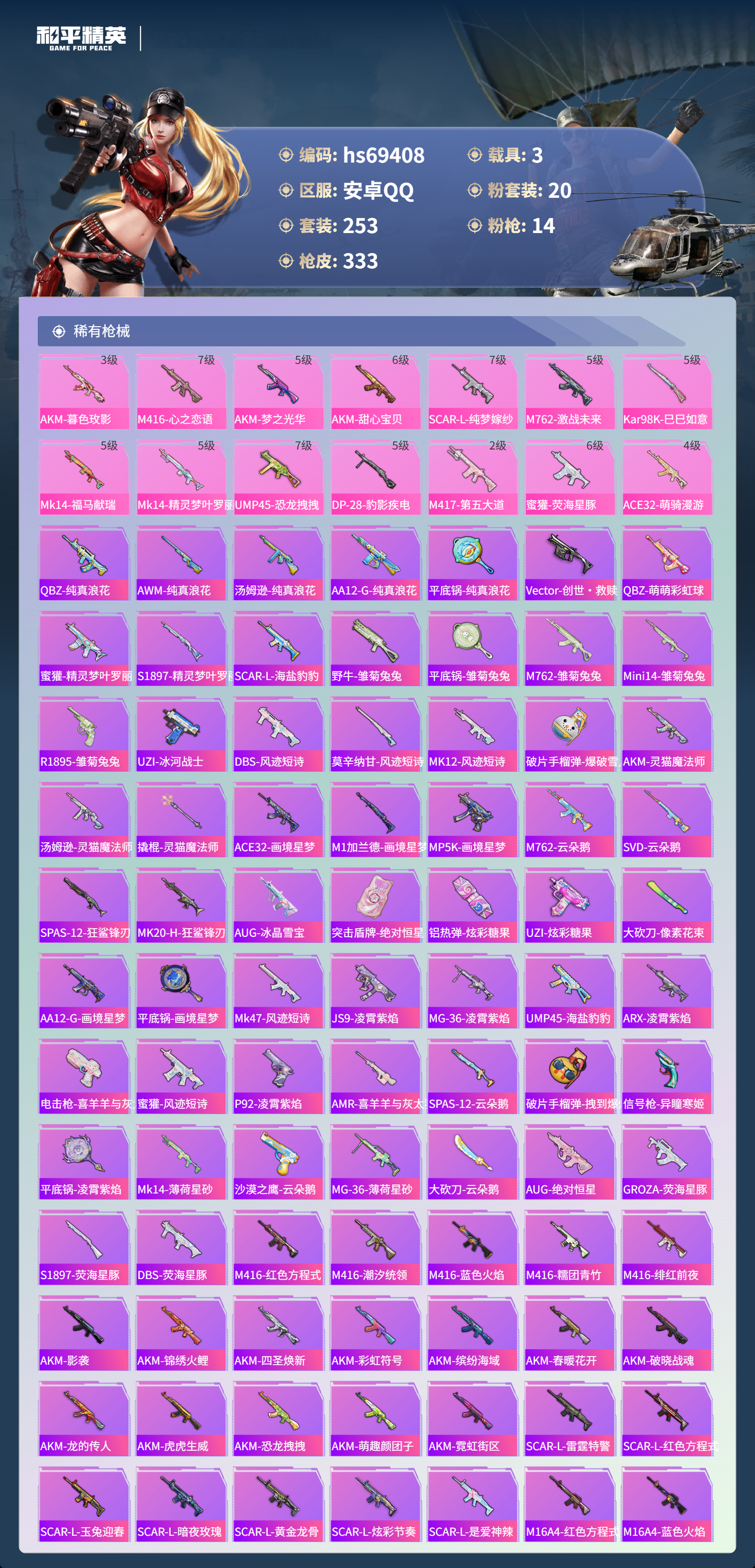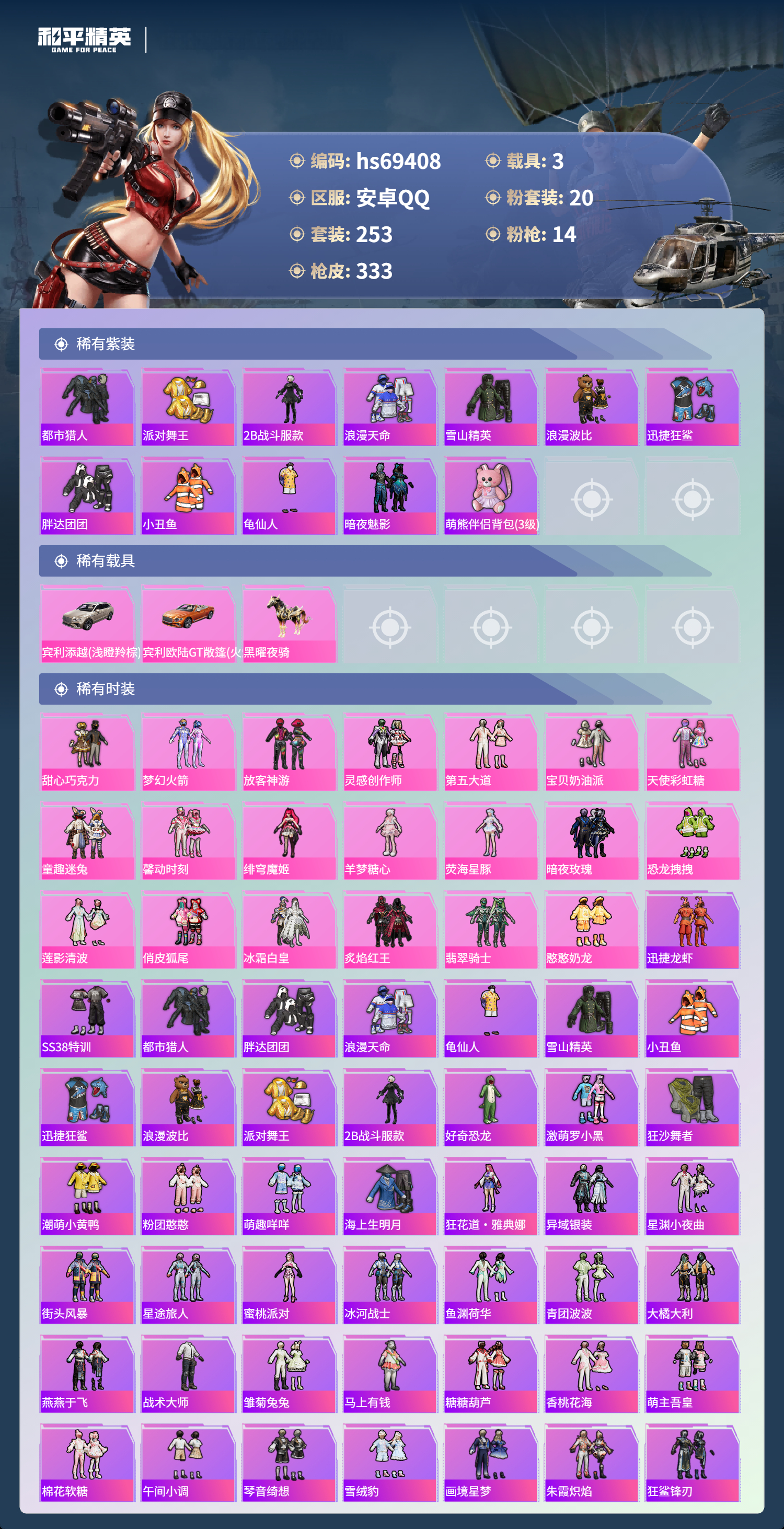 PX_2563361-,安卓手Q-28王牌印记-20粉装-14特效枪-3载具-热力值-253套装-333枪皮-4卓越印记-3传奇印记