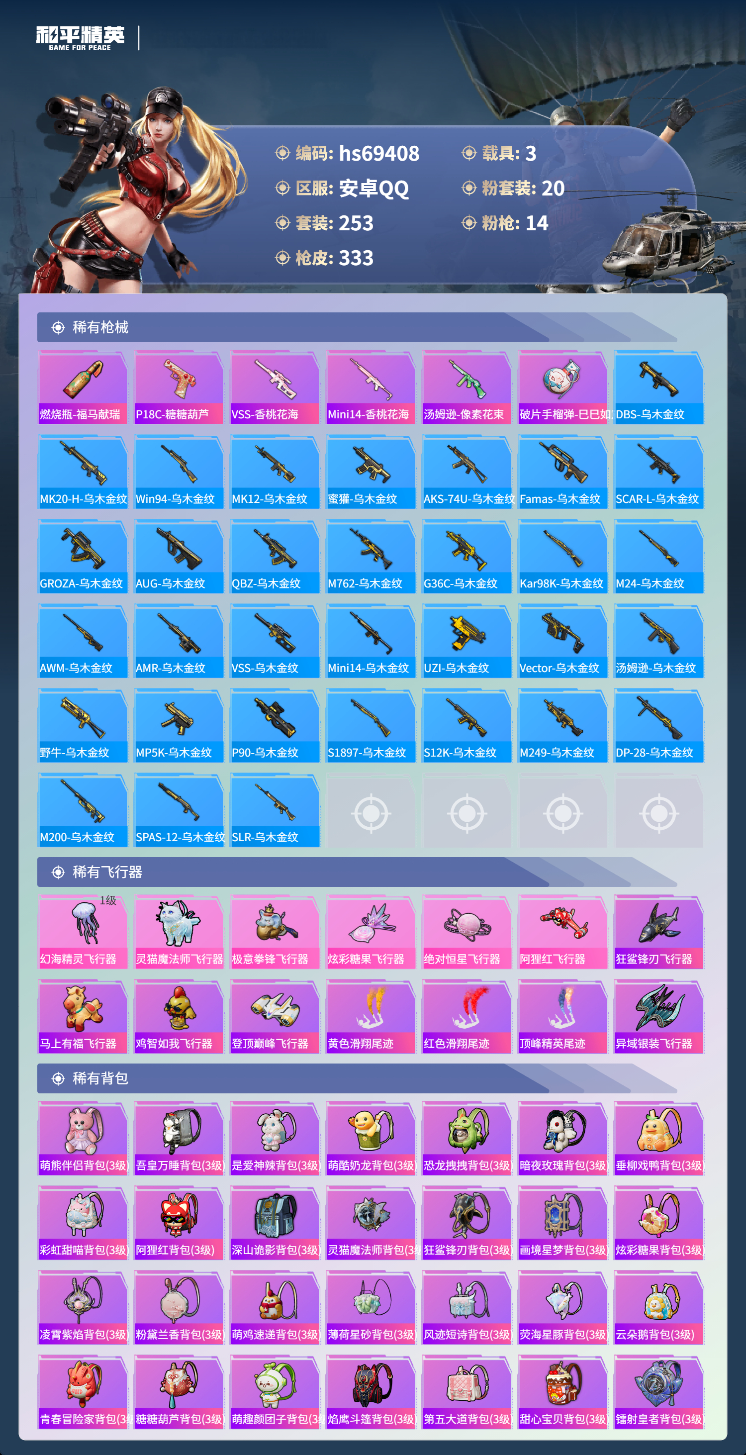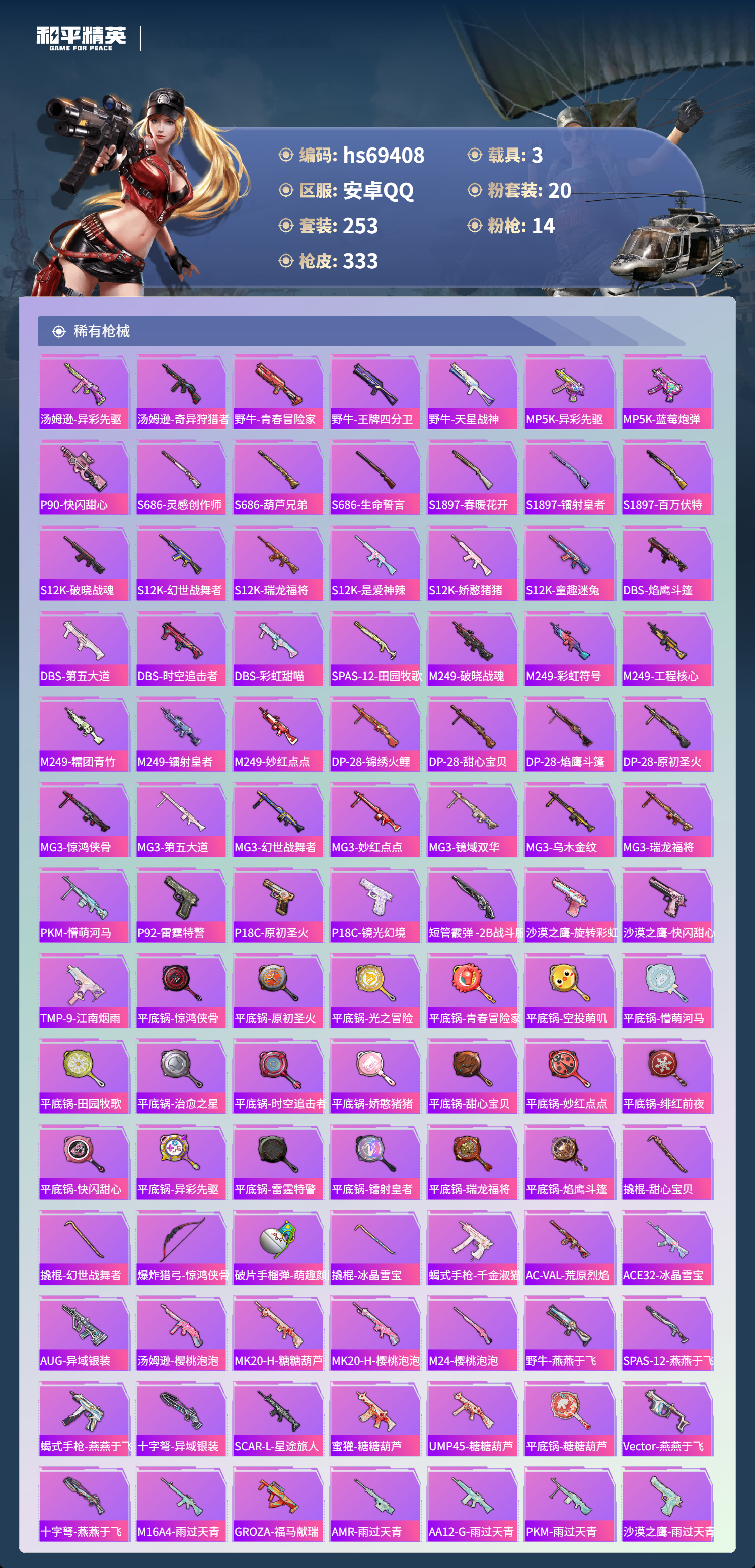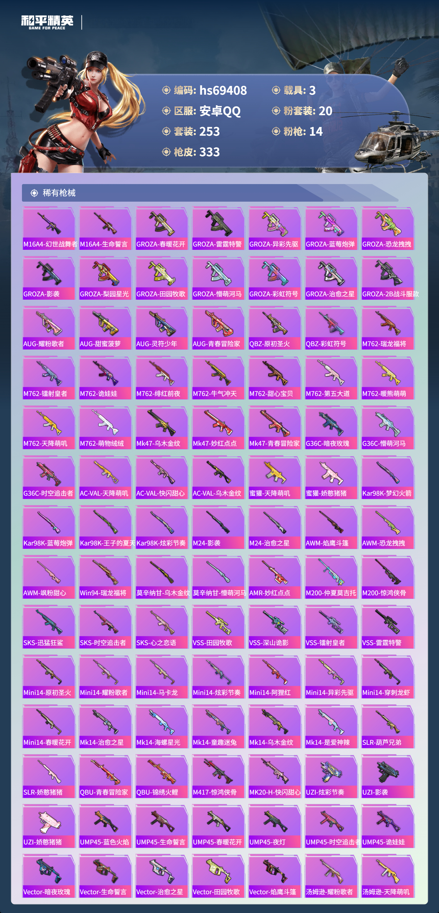【332稀有枪械】AKM-暮色玫影/3级,M416-心之恋语/7级,AKM-梦之光华/5级,AKM-甜心宝贝/6级,SCAR-L-纯梦嫁纱/7级,M762-激战未来/5级,Kar98K-巳巳如意/5级,Mk14-福马献瑞/5级,Mk14-精灵梦叶罗丽/5级,UMP45-恐龙拽拽/7级,DP-28-豹影疾电/5级,M417-第五大道/2级,蜜獾-荧海星豚/6级,ACE32-萌骑漫游/4级,QBZ-纯真浪花,AWM-纯真浪花,汤姆逊-纯真浪花,DBS-乌木金纹,AA12-G-纯真浪花,平底锅-纯真浪花,Vector-创世·救赎,QBZ-萌萌彩虹球,蜜獾-精灵梦叶罗丽,S1897-精灵梦叶罗丽,SCAR-L-海盐豹豹,野牛-雏菊兔兔,平底锅-雏菊兔兔,M762-雏菊兔兔,Mini14-雏菊兔兔,R1895-雏菊兔兔,UZI-冰河战士,MK20-H-乌木金纹,DBS-风迹短诗,莫辛纳甘-风迹短诗,Win94-乌木金纹,MK12-风迹短诗,MK12-乌木金纹,破片手榴弹-爆破雪人,AKM-灵猫魔法师,汤姆逊-灵猫魔法师,撬棍-灵猫魔法师,ACE32-画境星梦,M1加兰德-画境星梦,MP5K-画境星梦,蜜獾-乌木金纹,M762-云朵鹅,SVD-云朵鹅,SPAS-12-狂鲨锋刃,MK20-H-狂鲨锋刃,AUG-冰晶雪宝,突击盾牌-绝对恒星,铝热弹-炫彩糖果,UZI-炫彩糖果,大砍刀-像素花束,AA12-G-画境星梦,平底锅-画境星梦,Mk47-风迹短诗,JS9-凌霄紫焰,MG-36-凌霄紫焰,UMP45-海盐豹豹,ARX-凌霄紫焰,AKS-74U-乌木金纹,电击枪-喜羊羊与灰太狼,蜜獾-风迹短诗,P92-凌霄紫焰,AMR-喜羊羊与灰太狼,Famas-乌木金纹,SPAS-12-云朵鹅,破片手榴弹-拽到爆炸,信号枪-异瞳寒姬,平底锅-凌霄紫焰,Mk14-薄荷星砂,沙漠之鹰-云朵鹅,MG-36-薄荷星砂,大砍刀-云朵鹅,AUG-绝对恒星,GROZA-荧海星豚,S1897-荧海星豚,DBS-荧海星豚,M416-红色方程式,M416-潮汐统领,M416-蓝色火焰,M416-糯团青竹,M416-绯红前夜,AKM-影袭,AKM-锦绣火鲤,AKM-四圣焕新,AKM-彩虹符号,AKM-缤纷海域,AKM-春暖花开,AKM-破晓战魂,AKM-龙的传人,AKM-虎虎生威,AKM-恐龙拽拽,AKM-萌趣颜团子,AKM-霓虹街区,SCAR-L-雷霆特警,SCAR-L-红色方程式,SCAR-L-玉兔迎春,SCAR-L-乌木金纹,SCAR-L-暗夜玫瑰,SCAR-L-黄金龙骨,SCAR-L-炫彩节奏,SCAR-L-是爱神辣,M16A4-红色方程式,M16A4-蓝色火焰,M16A4-幻世战舞者,M16A4-生命誓言,GROZA-乌木金纹,GROZA-春暖花开,GROZA-雷霆特警,GROZA-异彩先驱,GROZA-蓝莓炮弹,GROZA-恐龙拽拽,GROZA-影袭,GROZA-梨园星光,GROZA-田园牧歌,GROZA-懵萌河马,GROZA-彩虹符号,GROZA-治愈之星,GROZA-2B战斗服款,AUG-乌木金纹,AUG-耀粉歌者,AUG-甜蜜菠萝,AUG-灵符少年,AUG-青春冒险家,QBZ-原初圣火,QBZ-乌木金纹,QBZ-彩虹符号,M762-瑞龙福将,M762-镭射皇者,M762-诡娃娃,M762-乌木金纹,M762-绯红前夜,M762-牛气冲天,M762-甜心宝贝,M762-第五大道,M762-暖熊萌萌,M762-天降萌叽,M762-萌物绒绒,Mk47-乌木金纹,Mk47-妙红点点,Mk47-青春冒险家,G36C-乌木金纹,G36C-暗夜玫瑰,G36C-懵萌河马,G36C-时空追击者,AC-VAL-天降萌叽,AC-VAL-快闪甜心,AC-VAL-乌木金纹,蜜獾-天降萌叽,蜜獾-娇憨猪猪,Kar98K-乌木金纹,Kar98K-梦幻火箭,Kar98K-蓝莓炮弹,Kar98K-王子的夏天,Kar98K-炫彩节奏,M24-乌木金纹,M24-影袭,M24-治愈之星,AWM-乌木金纹,AWM-焰鹰斗篷,AWM-恐龙拽拽,AWM-飒粉甜心,Win94-瑞龙福将,莫辛纳甘-乌木金纹,莫辛纳甘-懵萌河马,AMR-乌木金纹,AMR-妙红点点,M200-仲夏莫吉托,M200-惊鸿侠骨,SKS-迅猛狂鲨,SKS-时空追击者,SKS-心之恋语,VSS-乌木金纹,VSS-田园牧歌,VSS-深山诡影,VSS-镭射皇者,VSS-雷霆特警,Mini14-原初圣火,Mini14-耀粉歌者,Mini14-马卡龙,Mini14-乌木金纹,Mini14-炫彩节奏,Mini14-阿狸红,Mini14-异彩先驱,Mini14-穿刺龙虾,Mini14-春暖花开,Mk14-治愈之星,Mk14-海螺星光,Mk14-童趣迷兔,Mk14-乌木金纹,Mk14-是爱神辣,SLR-葫芦兄弟,SLR-娇憨猪猪,QBU-青春冒险家,QBU-锦绣火鲤,M417-惊鸿侠骨,MK20-H-快闪甜心,UZI-炫彩节奏,UZI-乌木金纹,UZI-影袭,UZI-娇憨猪猪,UMP45-蓝色火焰,UMP45-生命誓言,UMP45-春暖花开,UMP45-夜灯,UMP45-时空追击者,UMP45-诡娃娃,Vector-乌木金纹,Vector-暗夜玫瑰,Vector-生命誓言,Vector-治愈之星,Vector-田园牧歌,Vector-焰鹰斗篷,汤姆逊-耀粉歌者,汤姆逊-天降萌叽,汤姆逊-乌木金纹,汤姆逊-异彩先驱,汤姆逊-奇异狩猎者,野牛-乌木金纹,野牛-青春冒险家,野牛-王牌四分卫,野牛-天星战神,MP5K-异彩先驱,MP5K-蓝莓炮弹,MP5K-乌木金纹,P90-乌木金纹,P90-快闪甜心,S686-灵感创作师,S686-葫芦兄弟,S686-生命誓言,S1897-春暖花开,S1897-镭射皇者,S1897-乌木金纹,S1897-百万伏特,S12K-破晓战魂,S12K-幻世战舞者,S12K-乌木金纹,S12K-瑞龙福将,S12K-是爱神辣,S12K-娇憨猪猪,S12K-童趣迷兔,DBS-焰鹰斗篷,DBS-第五大道,DBS-时空追击者,DBS-彩虹甜喵,SPAS-12-田园牧歌,M249-破晓战魂,M249-彩虹符号,M249-工程核心,M249-糯团青竹,M249-乌木金纹,M249-镭射皇者,M249-妙红点点,DP-28-锦绣火鲤,DP-28-甜心宝贝,DP-28-焰鹰斗篷,DP-28-乌木金纹,DP-28-原初圣火,MG3-惊鸿侠骨,MG3-第五大道,MG3-幻世战舞者,MG3-妙红点点,MG3-镜域双华,MG3-乌木金纹,MG3-瑞龙福将,PKM-懵萌河马,P92-雷霆特警,P18C-原初圣火,P18C-镜光幻境,短管霰弹,-2B战斗服款,沙漠之鹰-旋转彩虹,沙漠之鹰-快闪甜心,TMP-9-江南烟雨,平底锅-惊鸿侠骨,平底锅-原初圣火,平底锅-光之冒险,平底锅-青春冒险家,平底锅-空投萌叽,平底锅-懵萌河马,平底锅-田园牧歌,平底锅-治愈之星,平底锅-时空追击者,平底锅-娇憨猪猪,平底锅-甜心宝贝,平底锅-妙红点点,平底锅-绯红前夜,平底锅-快闪甜心,平底锅-异彩先驱,平底锅-雷霆特警,平底锅-镭射皇者,平底锅-瑞龙福将,平底锅-焰鹰斗篷,撬棍-甜心宝贝,撬棍-幻世战舞者,爆炸猎弓-惊鸿侠骨,破片手榴弹-萌趣颜团子,撬棍-冰晶雪宝,蝎式手枪-千金淑猫,AC-VAL-荒原烈焰,ACE32-冰晶雪宝,AUG-异域银