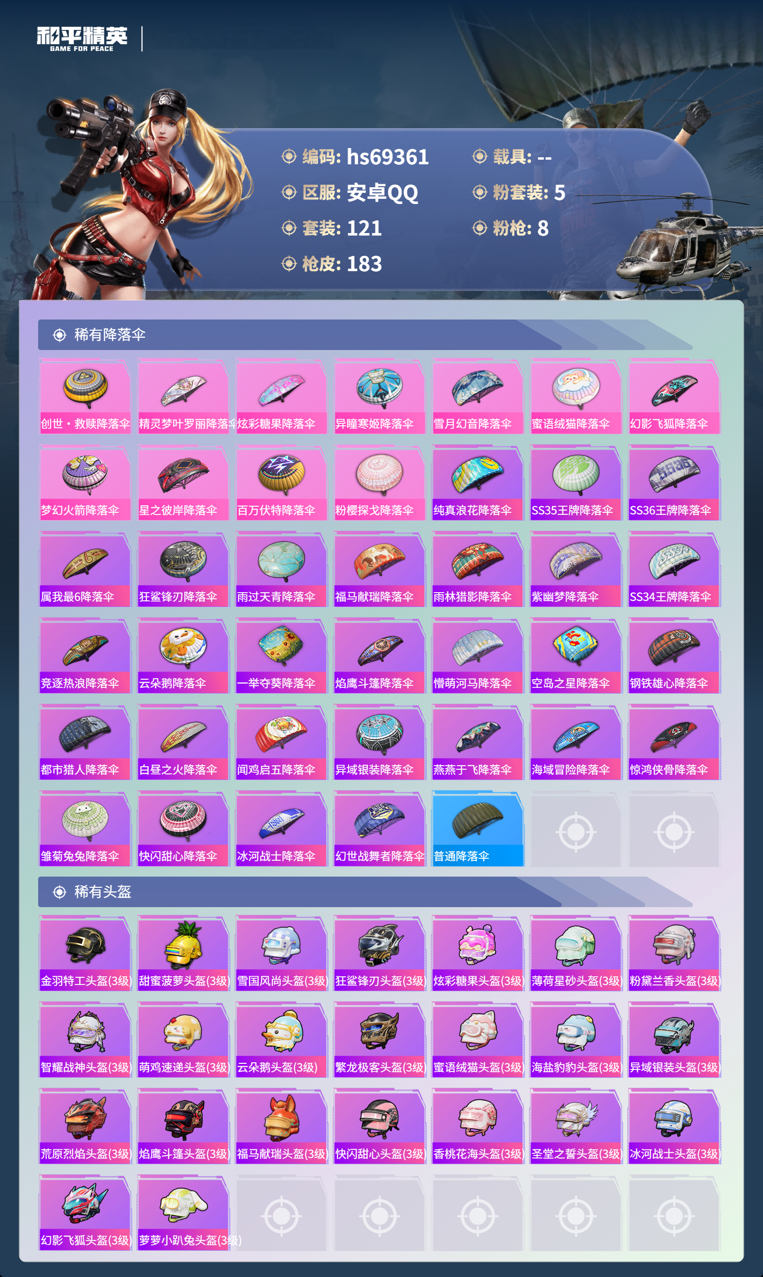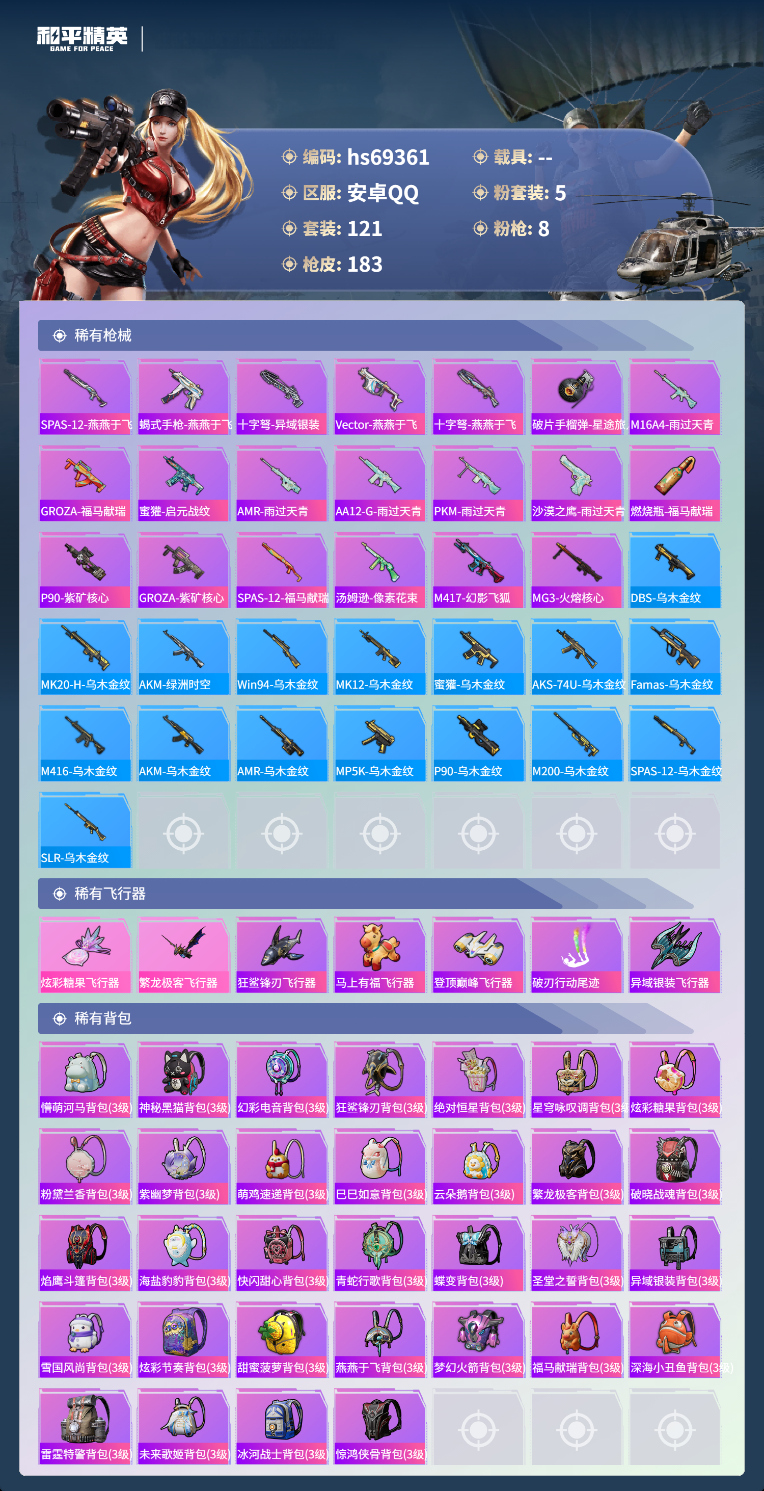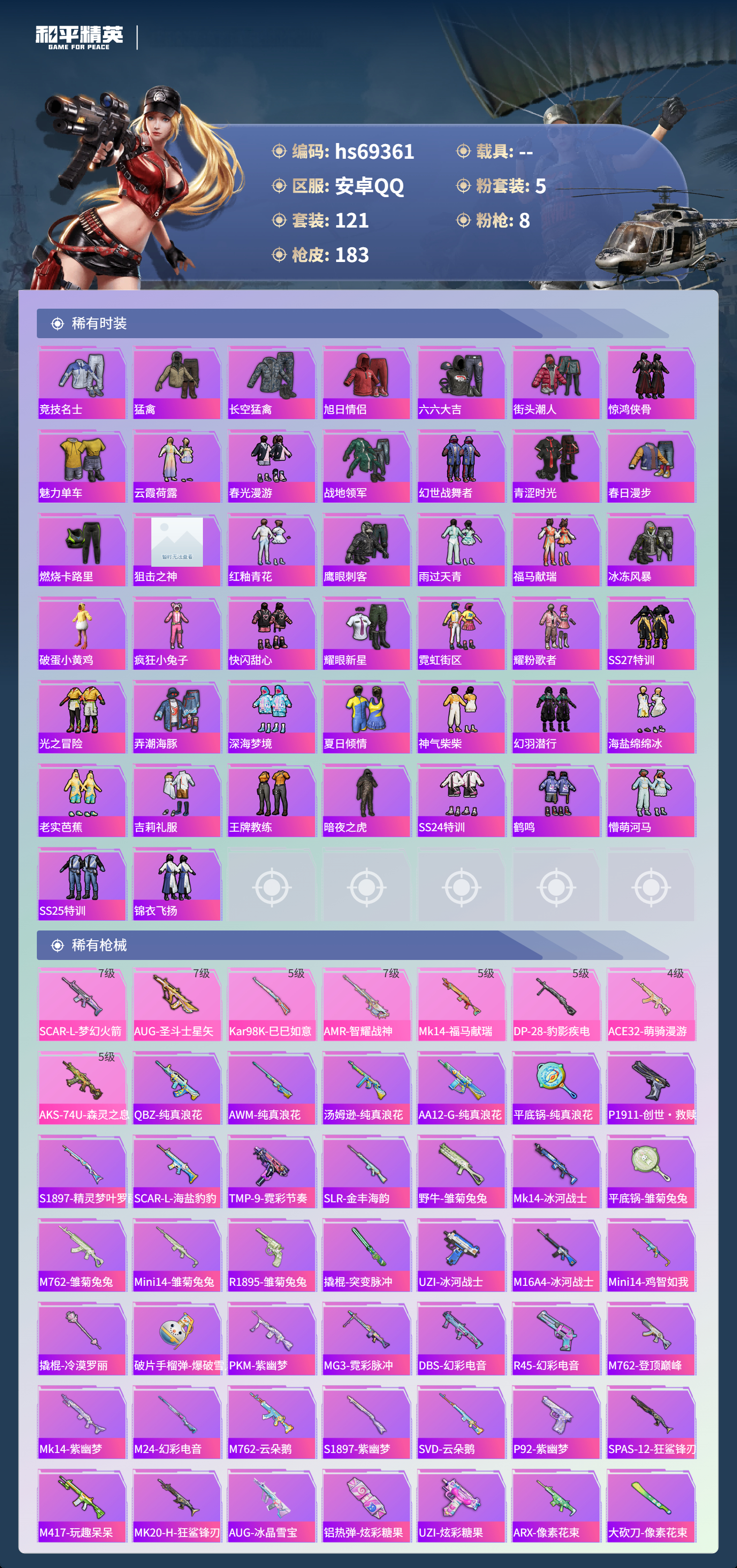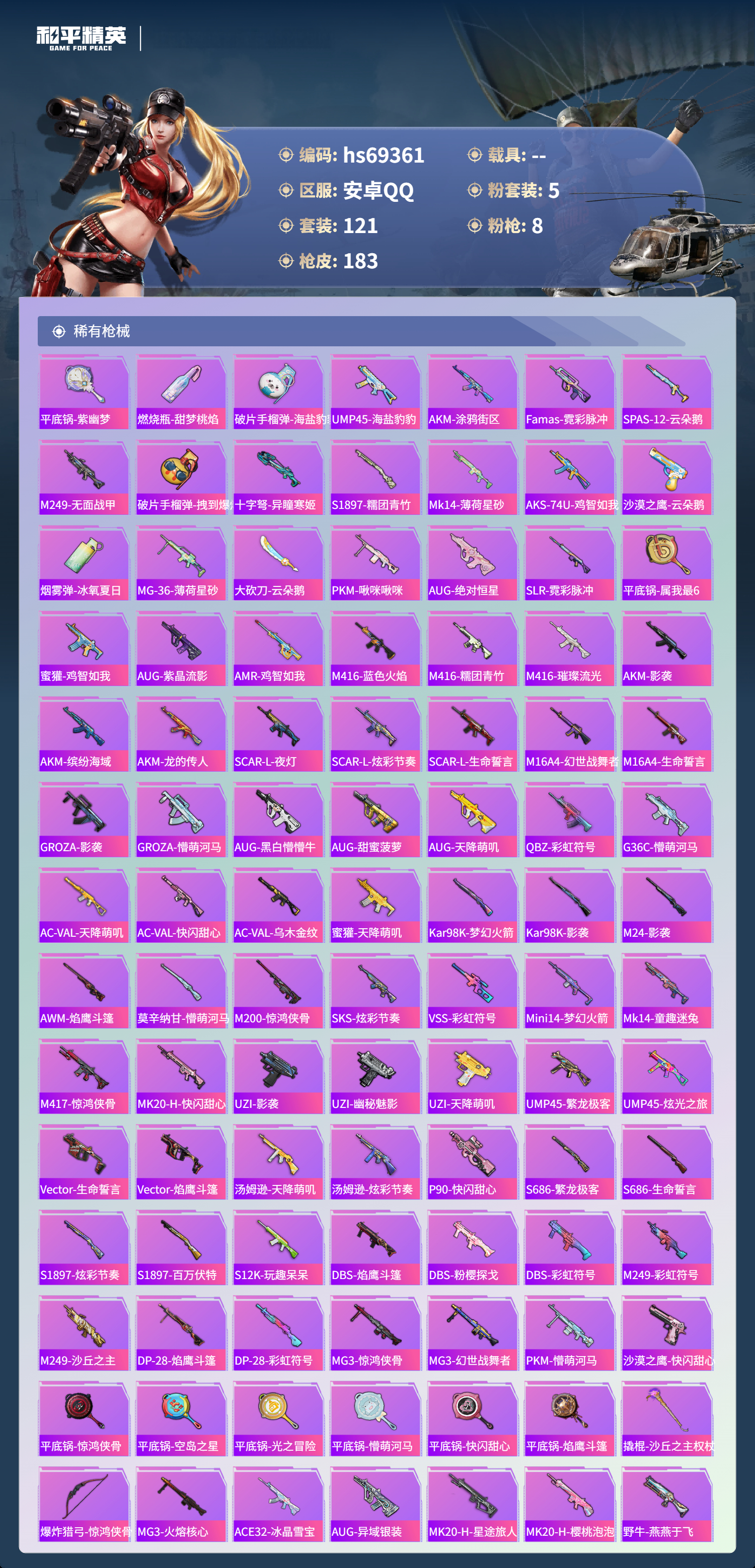 【183稀有枪械】SCAR-L-梦幻火箭/7级,AUG-圣斗士星矢/7级,Kar98K-巳巳如意/5级,AMR-智耀战神/7级,Mk14-福马献瑞/5级,DP-28-豹影疾电/5级,ACE32-萌骑漫游/4级,AKS-74U-森灵之息/5级,QBZ-纯真浪花,AWM-纯真浪花,汤姆逊-纯真浪花,DBS-乌木金纹,AA12-G-纯真浪花,平底锅-纯真浪花,P1911-创世·救赎,S1897-精灵梦叶罗丽,SCAR-L-海盐豹豹,TMP-9-霓彩节奏,SLR-金丰海韵,野牛-雏菊兔兔,Mk14-冰河战士,平底锅-雏菊兔兔,M762-雏菊兔兔,Mini14-雏菊兔兔,R1895-雏菊兔兔,撬棍-突变脉冲,UZI-冰河战士,M16A4-冰河战士,MK20-H-乌木金纹,Mini14-鸡智如我,AKM-绿洲时空,Win94-乌木金纹,MK12-乌木金纹,撬棍-冷漠罗丽,破片手榴弹-爆破雪人,PKM-紫幽梦,MG3-霓彩脉冲,DBS-幻彩电音,R45-幻彩电音,M762-登顶巅峰,Mk14-紫幽梦,M24-幻彩电音,蜜獾-乌木金纹,M762-云朵鹅,S1897-紫幽梦,SVD-云朵鹅,P92-紫幽梦,SPAS-12-狂鲨锋刃,M417-玩趣呆呆,MK20-H-狂鲨锋刃,AUG-冰晶雪宝,铝热弹-炫彩糖果,UZI-炫彩糖果,ARX-像素花束,大砍刀-像素花束,平底锅-紫幽梦,燃烧瓶-甜梦桃焰,破片手榴弹-海盐豹豹,UMP45-海盐豹豹,AKS-74U-乌木金纹,AKM-涂鸦街区,Famas-乌木金纹,Famas-霓彩脉冲,SPAS-12-云朵鹅,M249-无面战甲,破片手榴弹-拽到爆炸,十字弩-异瞳寒姬,S1897-糯团青竹,Mk14-薄荷星砂,AKS-74U-鸡智如我,沙漠之鹰-云朵鹅,烟雾弹-冰氧夏日,MG-36-薄荷星砂,大砍刀-云朵鹅,PKM-啾咪啾咪,AUG-绝对恒星,SLR-霓彩脉冲,平底锅-属我最6,蜜獾-鸡智如我,AUG-紫晶流影,AMR-鸡智如我,M416-乌木金纹,M416-蓝色火焰,M416-糯团青竹,M416-璀璨流光,AKM-影袭,AKM-乌木金纹,AKM-缤纷海域,AKM-龙的传人,SCAR-L-夜灯,SCAR-L-炫彩节奏,SCAR-L-生命誓言,M16A4-幻世战舞者,M16A4-生命誓言,GROZA-影袭,GROZA-懵萌河马,AUG-黑白懵懵牛,AUG-甜蜜菠萝,AUG-天降萌叽,QBZ-彩虹符号,G36C-懵萌河马,AC-VAL-天降萌叽,AC-VAL-快闪甜心,AC-VAL-乌木金纹,蜜獾-天降萌叽,Kar98K-梦幻火箭,Kar98K-影袭,M24-影袭,AWM-焰鹰斗篷,莫辛纳甘-懵萌河马,AMR-乌木金纹,M200-惊鸿侠骨,SKS-炫彩节奏,VSS-彩虹符号,Mini14-梦幻火箭,Mk14-童趣迷兔,M417-惊鸿侠骨,MK20-H-快闪甜心,UZI-影袭,UZI-幽秘魅影,UZI-天降萌叽,UMP45-繁龙极客,UMP45-炫光之旅,Vector-生命誓言,Vector-焰鹰斗篷,汤姆逊-天降萌叽,汤姆逊-炫彩节奏,MP5K-乌木金纹,P90-乌木金纹,P90-快闪甜心,S686-繁龙极客,S686-生命誓言,S1897-炫彩节奏,S1897-百万伏特,S12K-玩趣呆呆,DBS-焰鹰斗篷,DBS-粉樱探戈,DBS-彩虹符号,M249-彩虹符号,M249-沙丘之主,DP-28-焰鹰斗篷,DP-28-彩虹符号,MG3-惊鸿侠骨,MG3-幻世战舞者,PKM-懵萌河马,沙漠之鹰-快闪甜心,平底锅-惊鸿侠骨,平底锅-空岛之星,平底锅-光之冒险,平底锅-懵萌河马,平底锅-快闪甜心,平底锅-焰鹰斗篷,撬棍-沙丘之主权杖,爆炸猎弓-惊鸿侠骨,MG3-火熔核心,ACE32-冰晶雪宝,AUG-异域银装,MK20-H-星途旅人,MK20-H-樱桃泡泡,野牛-燕燕于飞,M200-乌木金纹,SPAS-12-燕燕于飞,蝎式手枪-燕燕于飞,十字弩-异域银装,SPAS-12-乌木金纹,Vector-燕燕于飞,十字弩-燕燕于飞,破片手榴弹-星途旅人,M16A4-雨过天青,GROZA-福马献瑞,蜜獾-启元战纹,AMR-雨过天青,SLR-乌木金纹,AA12-G-雨过天青,PKM-雨过天青,沙漠之鹰-雨过天青,燃烧瓶-福马献瑞,P90-紫矿核心,GROZA-紫矿核心,SPAS-12-福马献瑞,汤姆逊-像素花束,M417-幻影飞狐,MG3-火熔核心