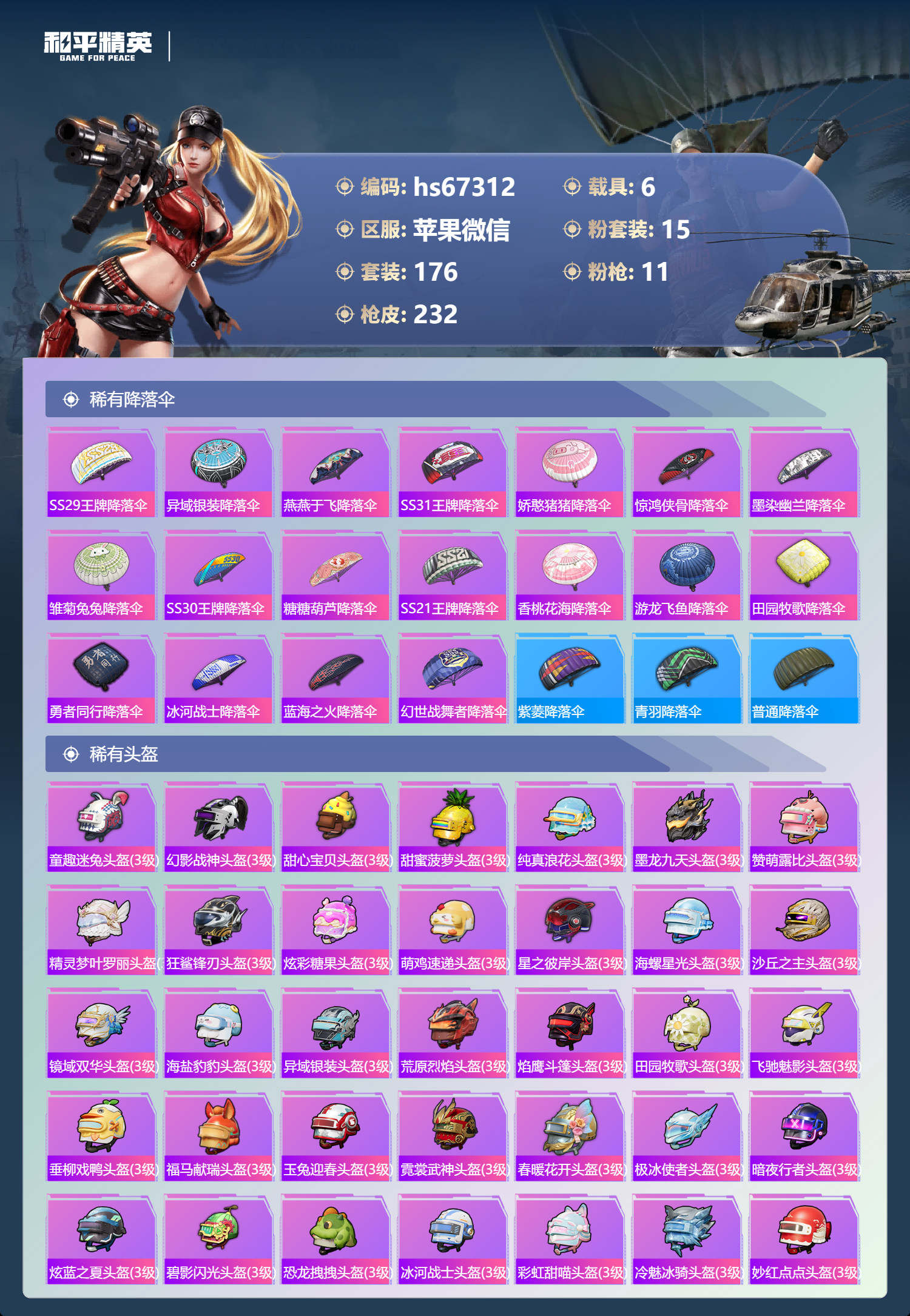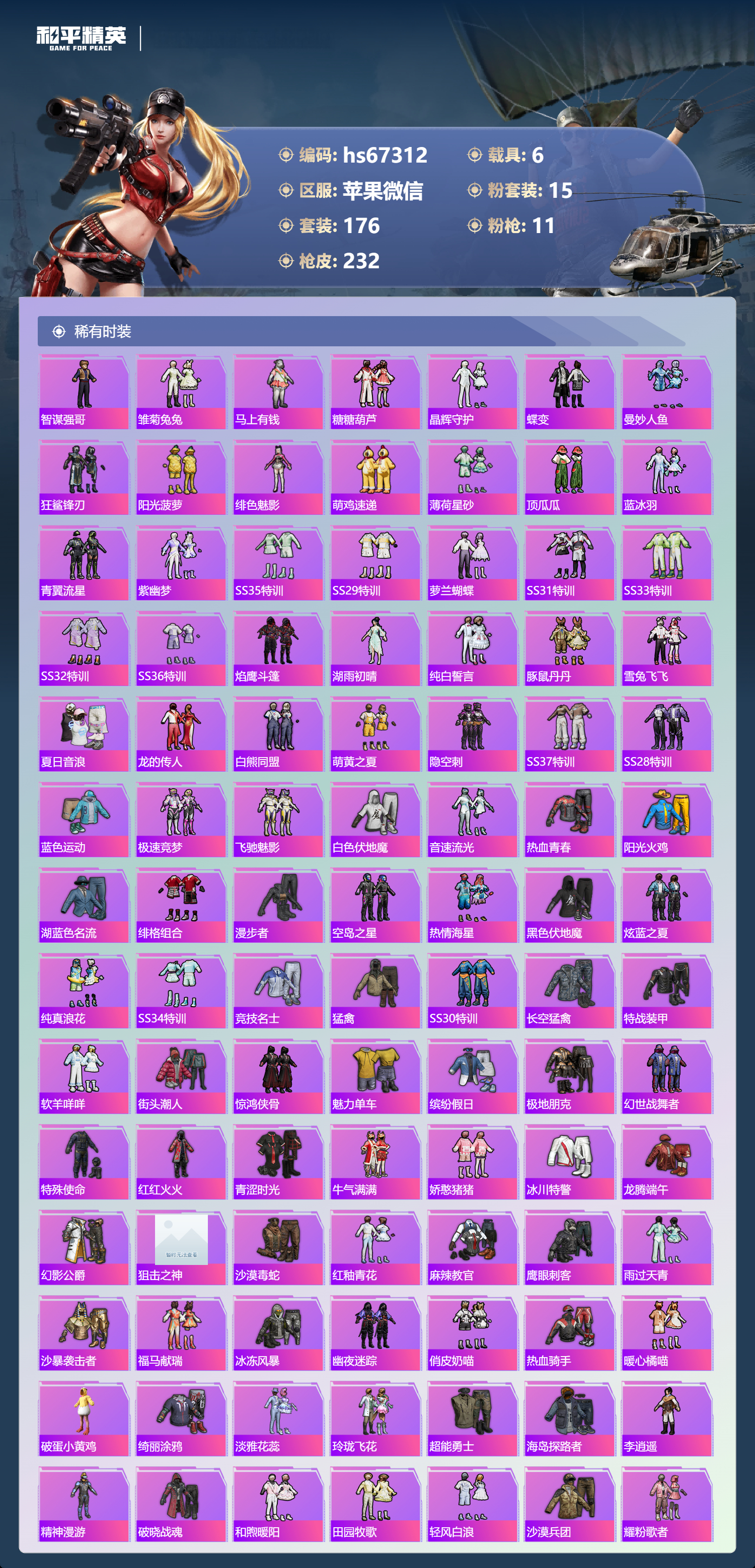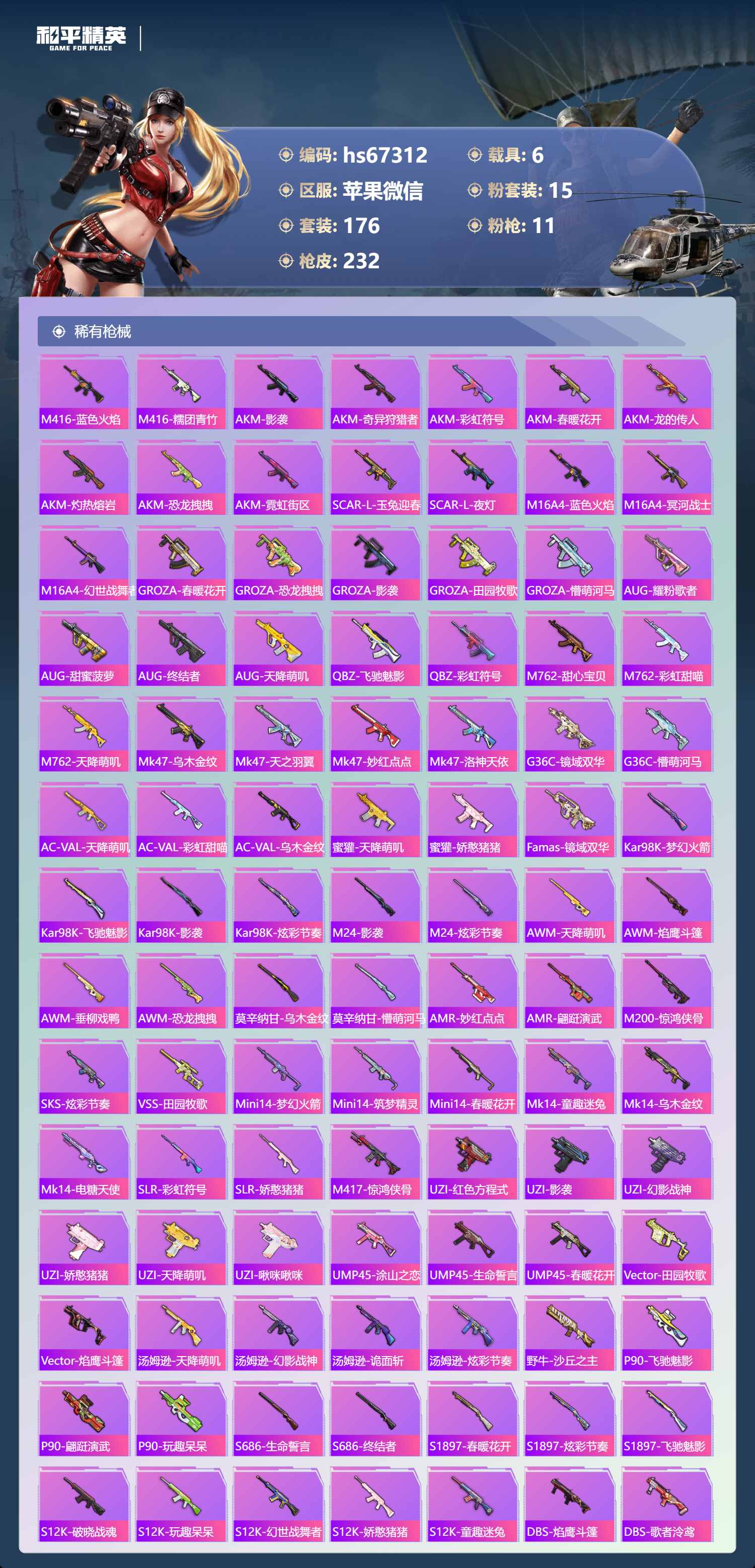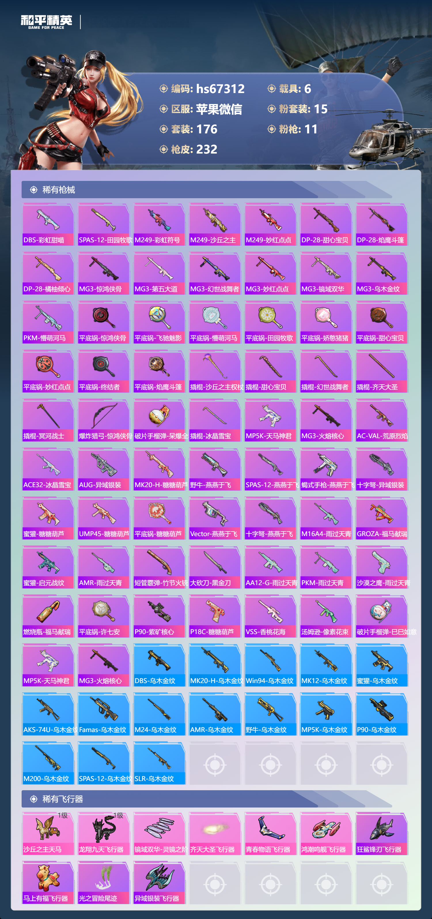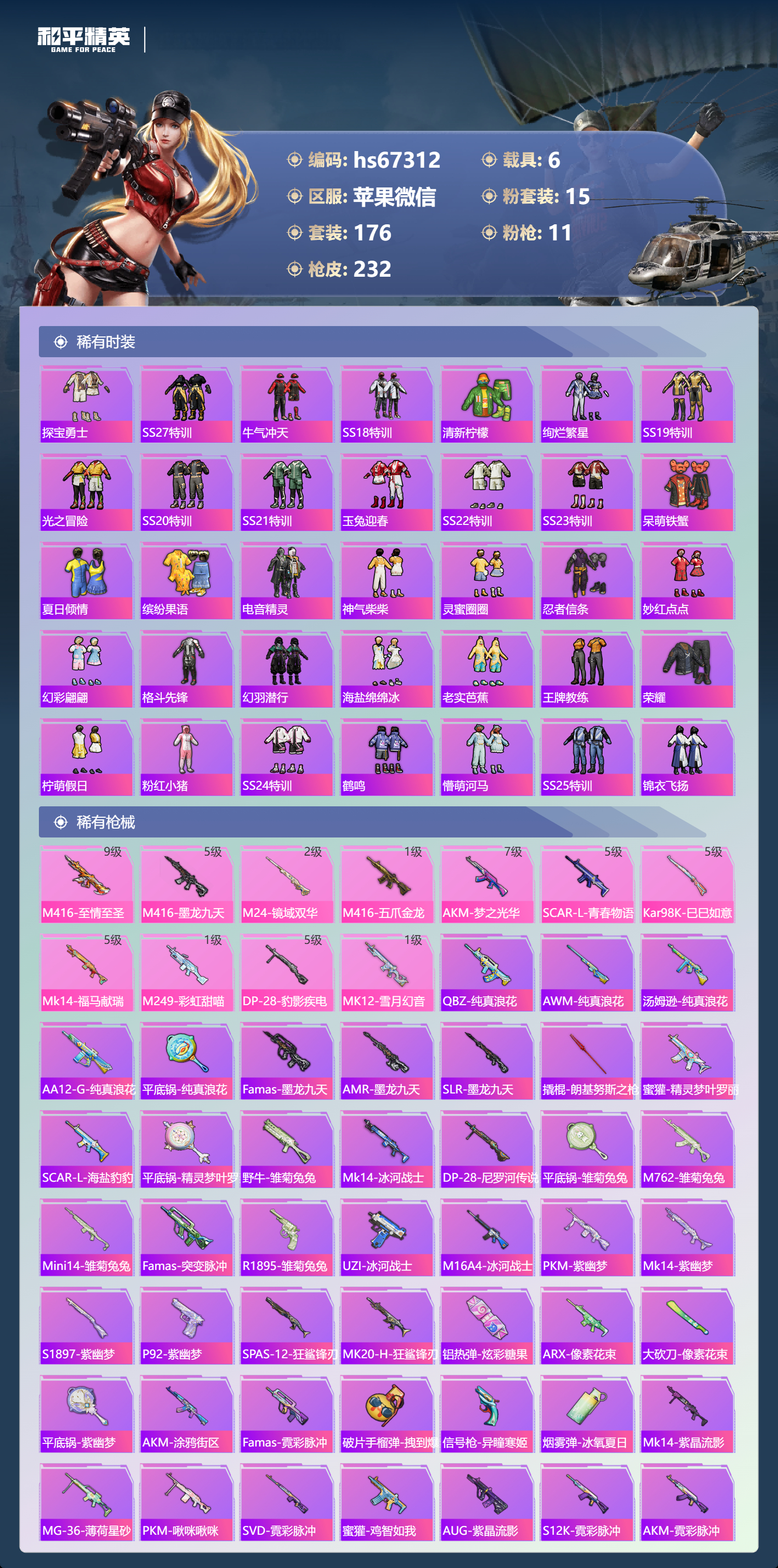 【234稀有枪械】M416-至情至圣/9级,M416-墨龙九天/5级,M24-镜域双华/2级,M416-五爪金龙/1级,AKM-梦之光华/7级,SCAR-L-青春物语/5级,Kar98K-巳巳如意/5级,Mk14-福马献瑞/5级,M249-彩虹甜喵/1级,DP-28-豹影疾电/5级,MK12-雪月幻音/1级,QBZ-纯真浪花,AWM-纯真浪花,汤姆逊-纯真浪花,DBS-乌木金纹,AA12-G-纯真浪花,平底锅-纯真浪花,Famas-墨龙九天,AMR-墨龙九天,SLR-墨龙九天,撬棍-朗基努斯之枪,蜜獾-精灵梦叶罗丽,SCAR-L-海盐豹豹,平底锅-精灵梦叶罗丽,野牛-雏菊兔兔,Mk14-冰河战士,DP-28-尼罗河传说,平底锅-雏菊兔兔,M762-雏菊兔兔,Mini14-雏菊兔兔,Famas-突变脉冲,R1895-雏菊兔兔,UZI-冰河战士,M16A4-冰河战士,MK20-H-乌木金纹,Win94-乌木金纹,MK12-乌木金纹,PKM-紫幽梦,Mk14-紫幽梦,蜜獾-乌木金纹,S1897-紫幽梦,P92-紫幽梦,SPAS-12-狂鲨锋刃,MK20-H-狂鲨锋刃,铝热弹-炫彩糖果,ARX-像素花束,大砍刀-像素花束,平底锅-紫幽梦,AKS-74U-乌木金纹,AKM-涂鸦街区,Famas-乌木金纹,Famas-霓彩脉冲,破片手榴弹-拽到爆炸,信号枪-异瞳寒姬,烟雾弹-冰氧夏日,Mk14-紫晶流影,MG-36-薄荷星砂,PKM-啾咪啾咪,SVD-霓彩脉冲,蜜獾-鸡智如我,AUG-紫晶流影,S12K-霓彩脉冲,AKM-霓彩脉冲,M416-蓝色火焰,M416-糯团青竹,AKM-影袭,AKM-奇异狩猎者,AKM-彩虹符号,AKM-春暖花开,AKM-龙的传人,AKM-灼热熔岩,AKM-恐龙拽拽,AKM-霓虹街区,SCAR-L-玉兔迎春,SCAR-L-夜灯,M16A4-蓝色火焰,M16A4-冥河战士,M16A4-幻世战舞者,GROZA-春暖花开,GROZA-恐龙拽拽,GROZA-影袭,GROZA-田园牧歌,GROZA-懵萌河马,AUG-耀粉歌者,AUG-甜蜜菠萝,AUG-终结者,AUG-天降萌叽,QBZ-飞驰魅影,QBZ-彩虹符号,M762-甜心宝贝,M762-彩虹甜喵,M762-天降萌叽,Mk47-乌木金纹,Mk47-天之羽翼,Mk47-妙红点点,Mk47-洛神天依,G36C-镜域双华,G36C-懵萌河马,AC-VAL-天降萌叽,AC-VAL-彩虹甜喵,AC-VAL-乌木金纹,蜜獾-天降萌叽,蜜獾-娇憨猪猪,Famas-镜域双华,Kar98K-梦幻火箭,Kar98K-飞驰魅影,Kar98K-影袭,Kar98K-炫彩节奏,M24-乌木金纹,M24-影袭,M24-炫彩节奏,AWM-天降萌叽,AWM-焰鹰斗篷,AWM-垂柳戏鸭,AWM-恐龙拽拽,莫辛纳甘-乌木金纹,莫辛纳甘-懵萌河马,AMR-乌木金纹,AMR-妙红点点,AMR-翩跹演武,M200-惊鸿侠骨,SKS-炫彩节奏,VSS-田园牧歌,Mini14-梦幻火箭,Mini14-筑梦精灵,Mini14-春暖花开,Mk14-童趣迷兔,Mk14-乌木金纹,Mk14-电糖天使,SLR-彩虹符号,SLR-娇憨猪猪,M417-惊鸿侠骨,UZI-红色方程式,UZI-影袭,UZI-幻影战神,UZI-娇憨猪猪,UZI-天降萌叽,UZI-啾咪啾咪,UMP45-涂山之恋,UMP45-生命誓言,UMP45-春暖花开,Vector-田园牧歌,Vector-焰鹰斗篷,汤姆逊-天降萌叽,汤姆逊-幻影战神,汤姆逊-诡面斩,汤姆逊-炫彩节奏,野牛-乌木金纹,野牛-沙丘之主,MP5K-乌木金纹,P90-乌木金纹,P90-飞驰魅影,P90-翩跹演武,P90-玩趣呆呆,S686-生命誓言,S686-终结者,S1897-春暖花开,S1897-炫彩节奏,S1897-飞驰魅影,S12K-破晓战魂,S12K-玩趣呆呆,S12K-幻世战舞者,S12K-娇憨猪猪,S12K-童趣迷兔,DBS-焰鹰斗篷,DBS-歌者泠鸢,DBS-彩虹甜喵,SPAS-12-田园牧歌,M249-彩虹符号,M249-沙丘之主,M249-妙红点点,DP-28-甜心宝贝,DP-28-焰鹰斗篷,DP-28-橘柚倾心,MG3-惊鸿侠骨,MG3-第五大道,MG3-幻世战舞者,MG3-妙红点点,MG3-镜域双华,MG3-乌木金纹,PKM-懵萌河马,平底锅-惊鸿侠骨,平底锅-飞驰魅影,平底锅-懵萌河马,平底锅-田园牧歌,平底锅-娇憨猪猪,平底锅-甜心宝贝,平底锅-妙红点点,平底锅-终结者,平底锅-焰鹰斗篷,撬棍-沙丘之主权杖,撬棍-甜心宝贝,撬棍-幻世战舞者,撬棍-齐天大圣,撬棍-冥河战士,爆炸猎弓-惊鸿侠骨,破片手榴弹-呆爆全场,撬棍-冰晶雪宝,MP5K-天马神君,MG3-火熔核心,AC-VAL-荒原烈焰,ACE32-冰晶雪宝,AUG-异域银装,MK20-H-糖糖葫芦,野牛-燕燕于飞,M200-乌木金纹,SPAS-12-燕燕于飞,蝎式手枪-燕燕于飞,十字弩-异域银装,蜜獾-糖糖葫芦,UMP45-糖糖葫芦,SPAS-12-乌木金纹,平底锅-糖糖葫芦,Vector-燕燕于飞,十字弩-燕燕于飞,M16A4-雨过天青,GROZA-福马献瑞,蜜獾-启元战纹,AMR-雨过天青,短管霰弹-竹节火铳,SLR-乌木金纹,大砍刀-黑金刀,AA12-G-雨过天青,PKM-雨过天青,沙漠之鹰-雨过天青,燃烧瓶-福马献瑞,平底锅-许七安,P90-紫矿核心,P18C-糖糖葫芦,VSS-香桃花海,汤姆逊-像素花束,破片手榴弹-巳巳如意,MP5K-天马神君,MG3-火熔核心