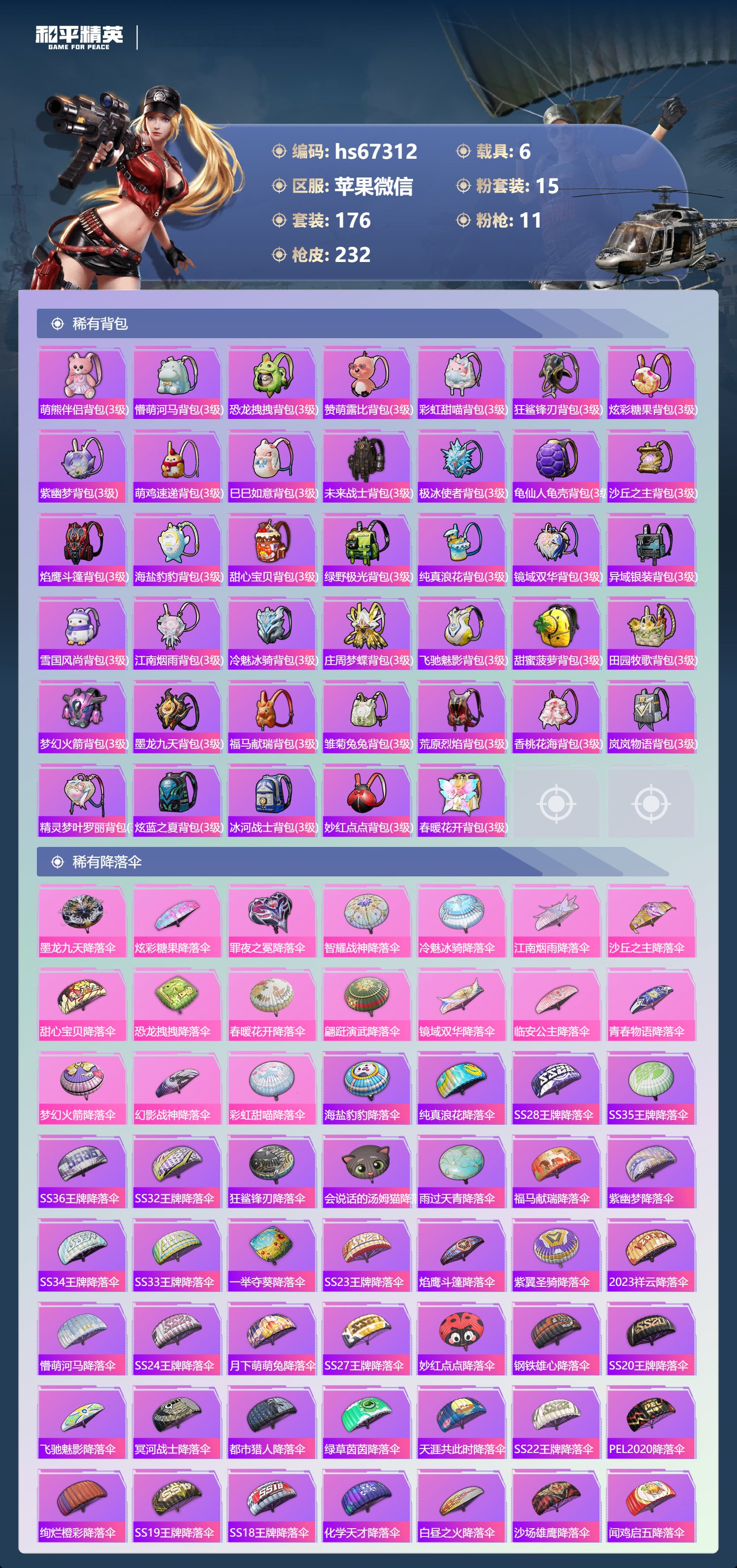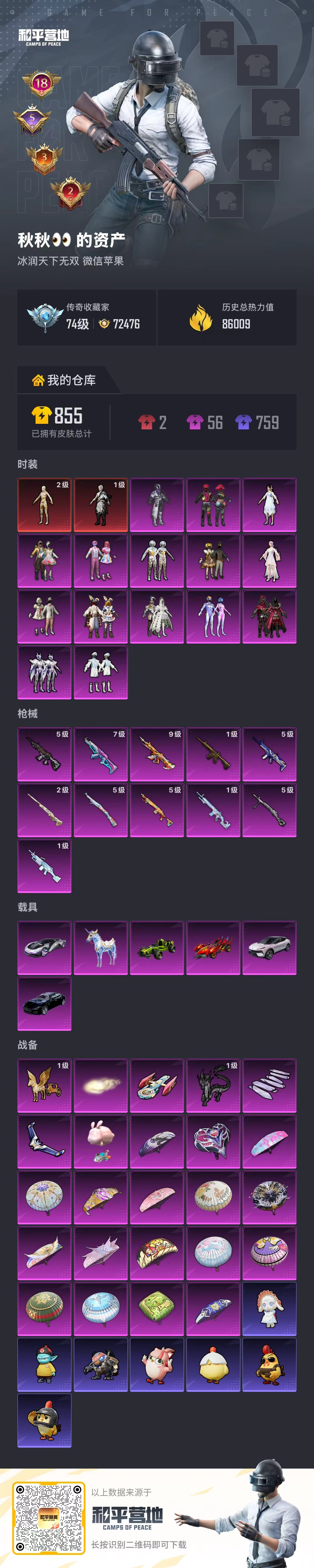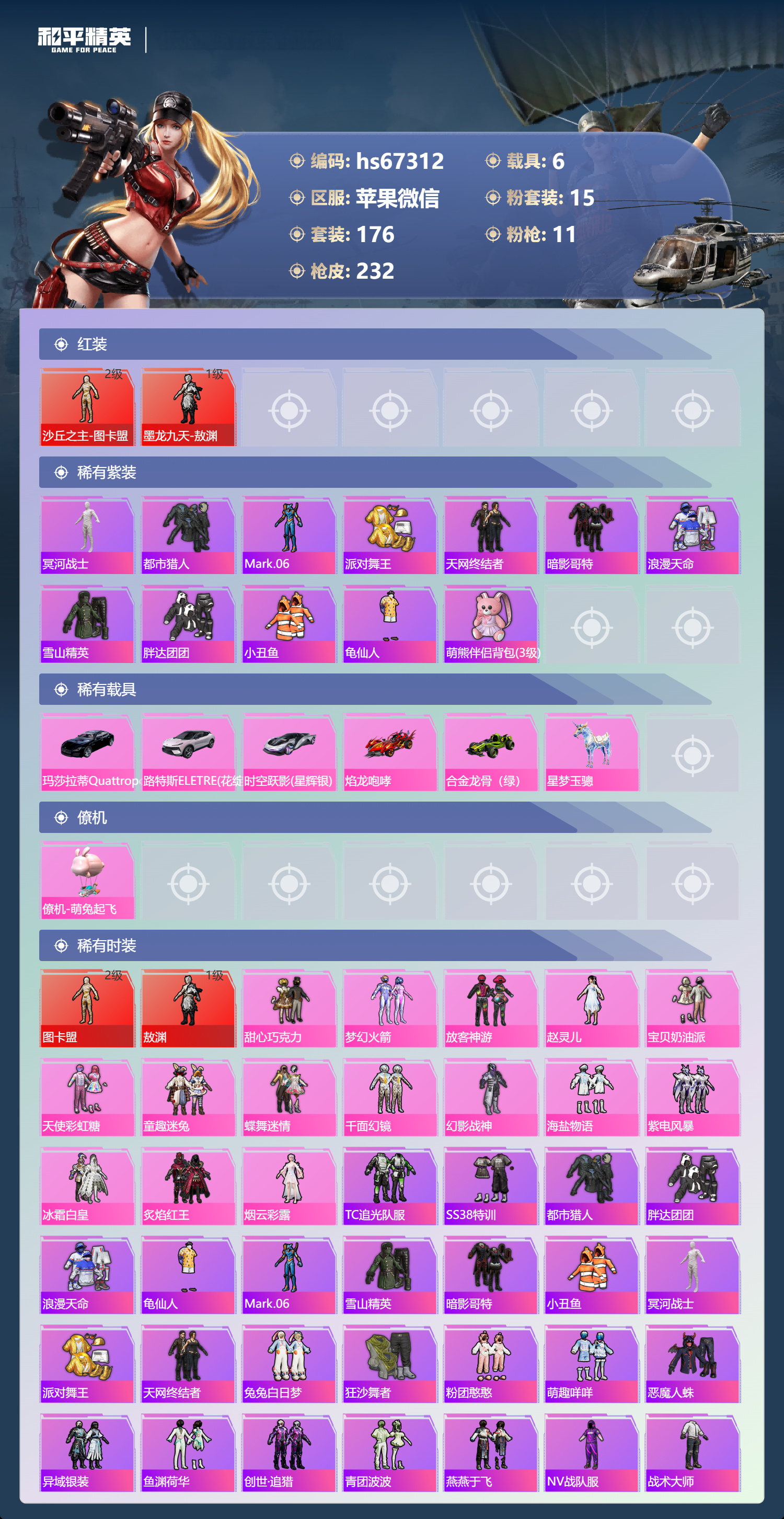 PX_2550149-,苹果微信-18王牌印记-有战神框-2红装-15粉装-11特效枪-6载具-86049热力值-176套装-232枪皮-5卓越印记-3传奇印记