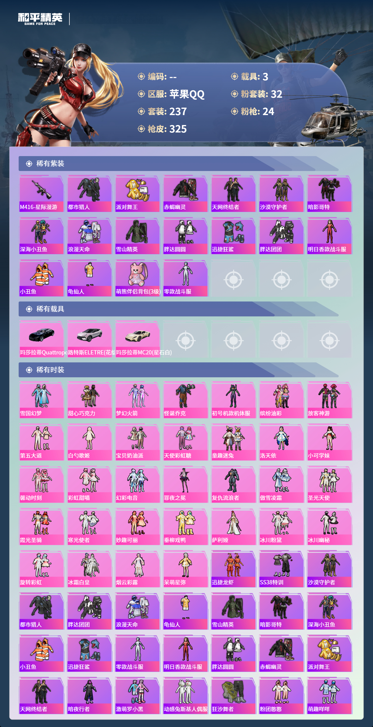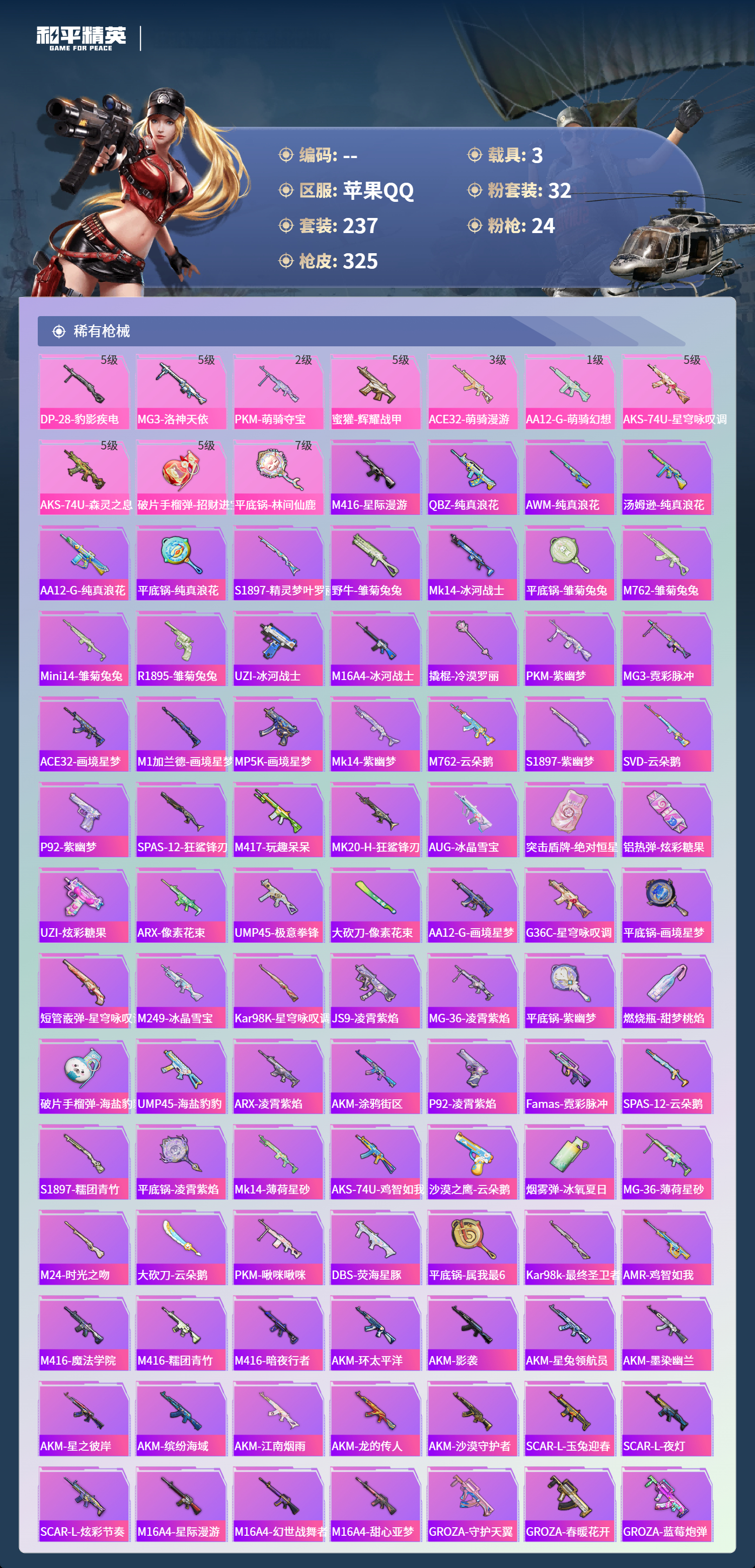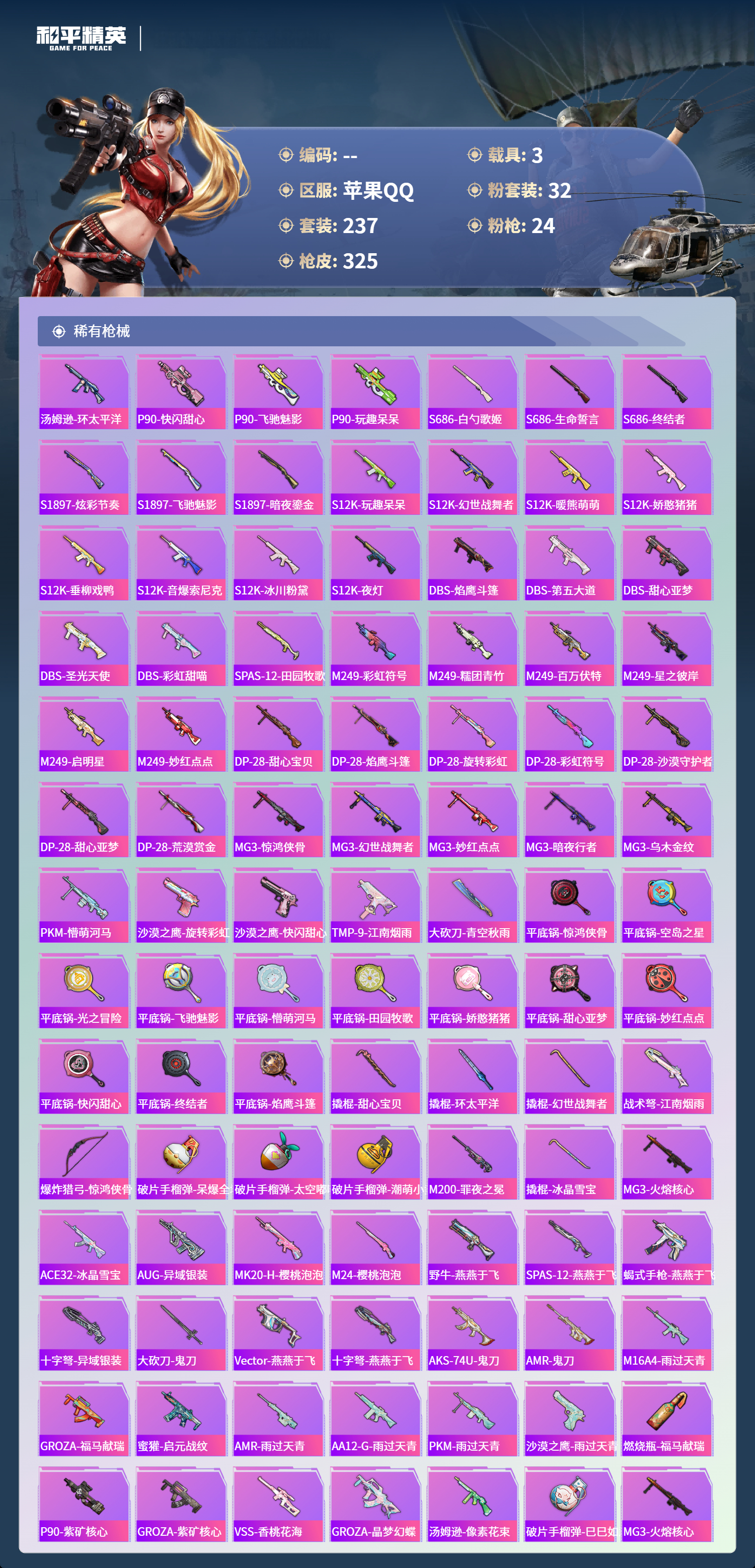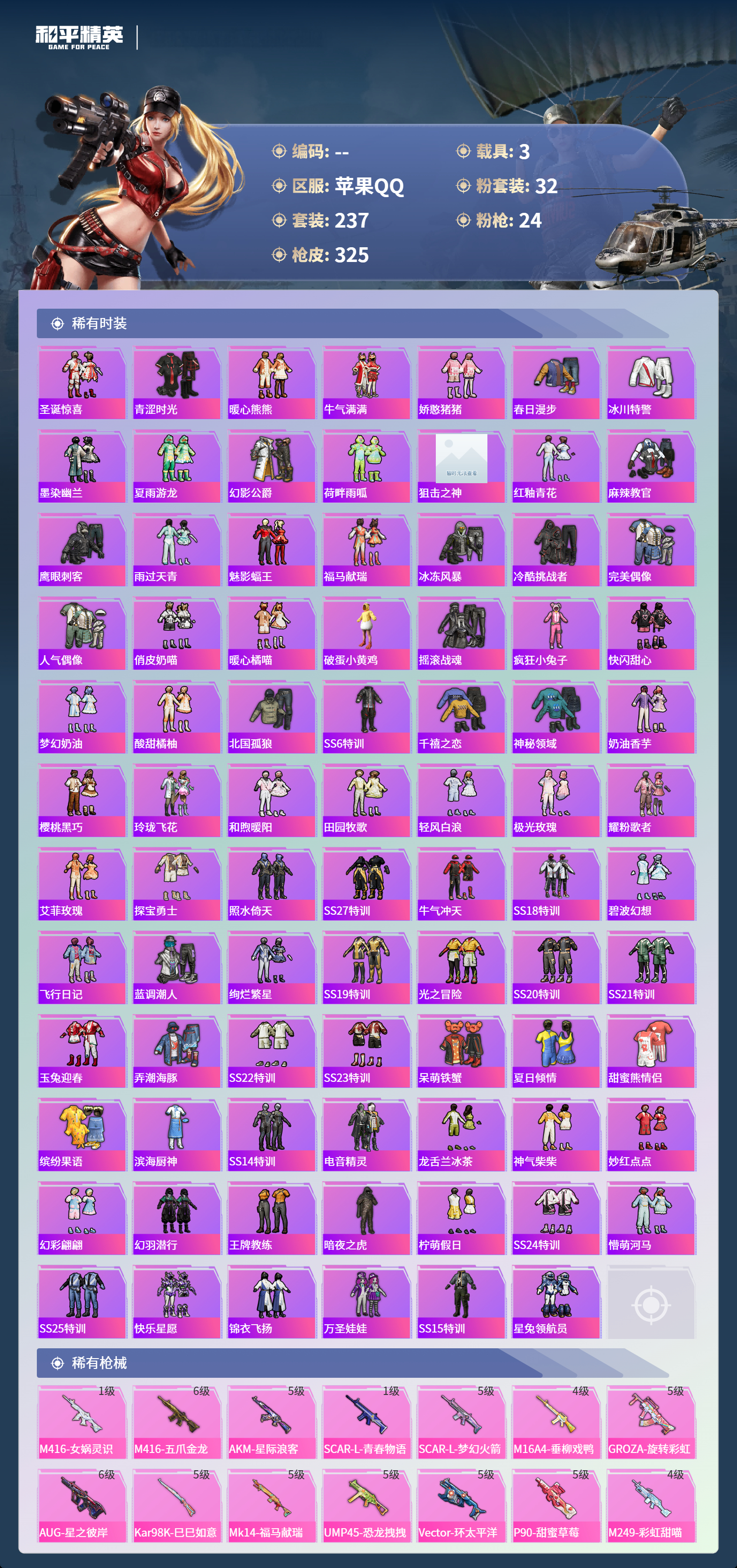 PX_2543124-苹果手Q-17王牌印记-32粉装-24特效枪-3载具-热力值-237套装-325枪皮-1卓越印记