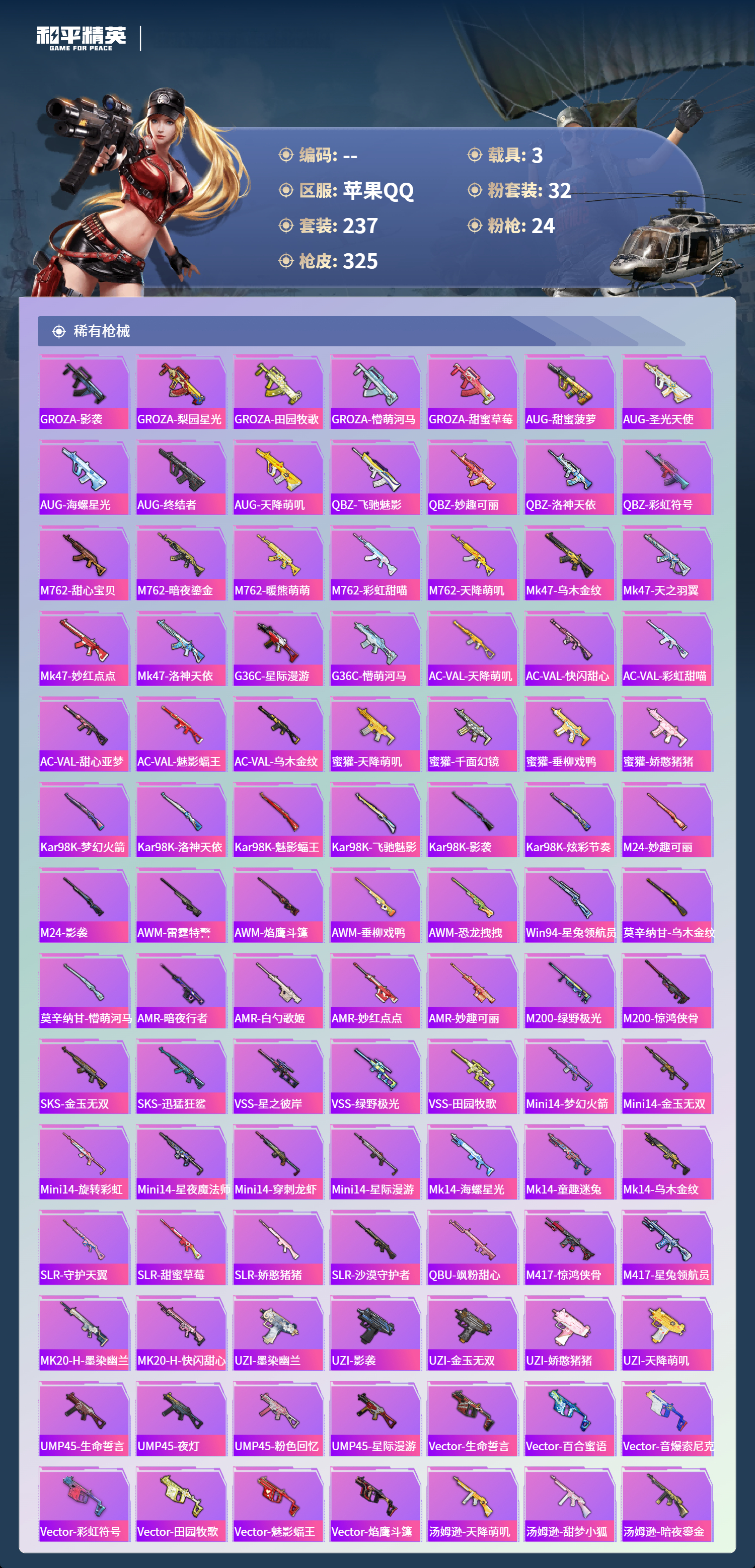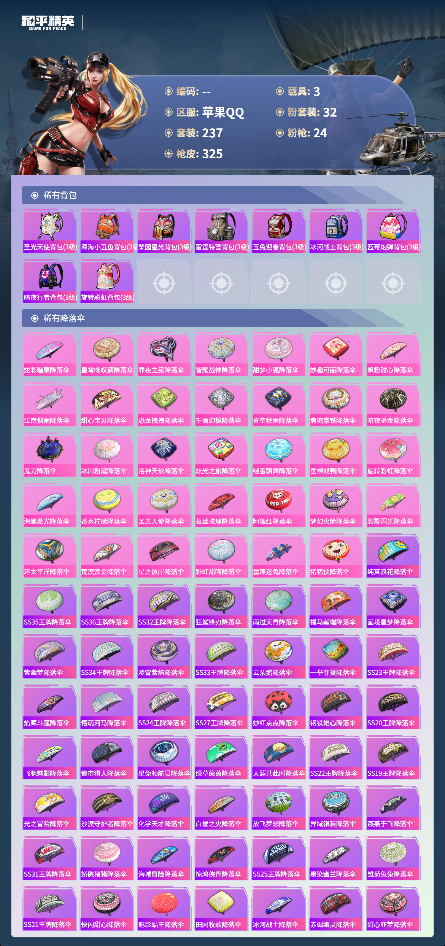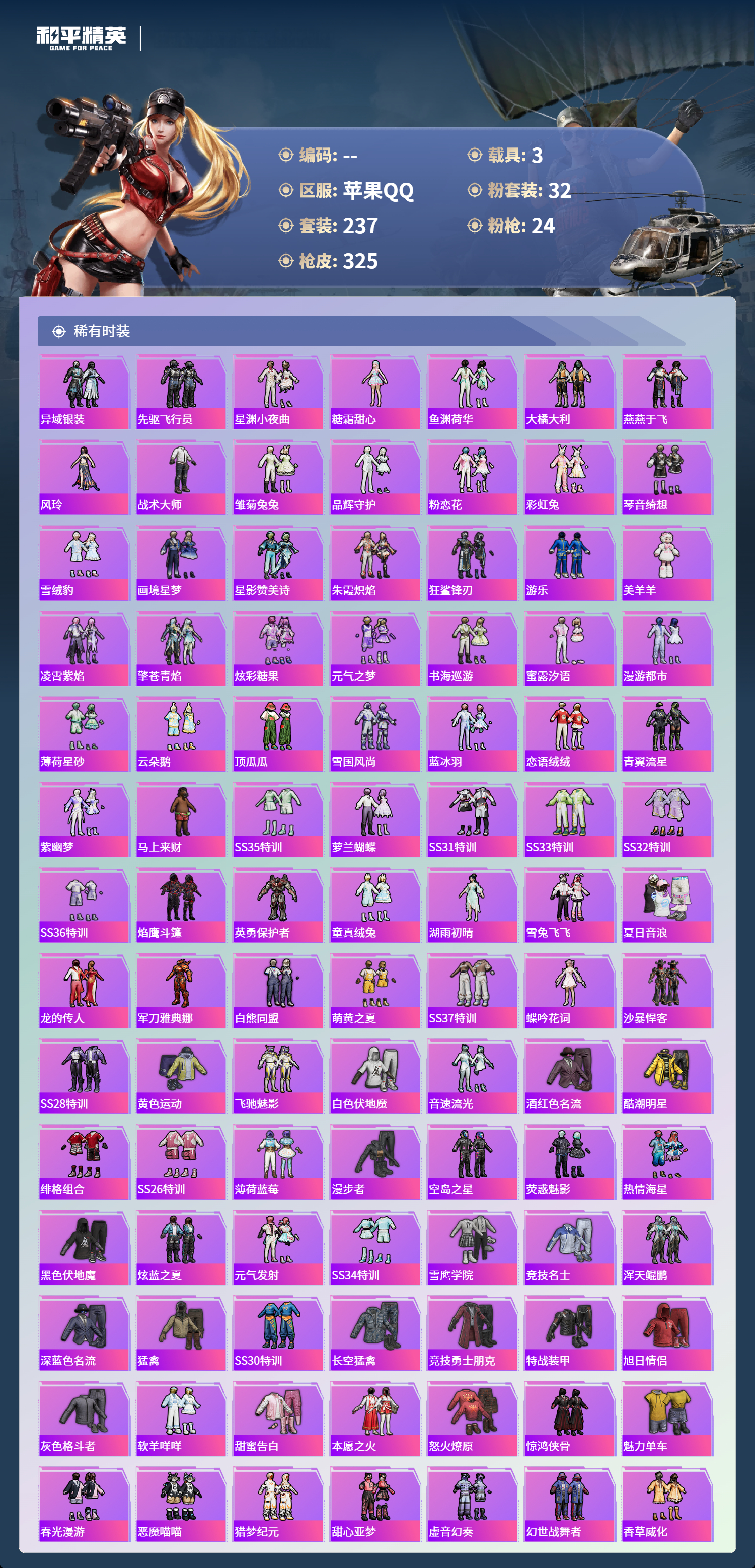PX_2543124-苹果手Q-17王牌印记-32粉装-24特效枪-3载具-热力值-237套装-325枪皮-1卓越印记