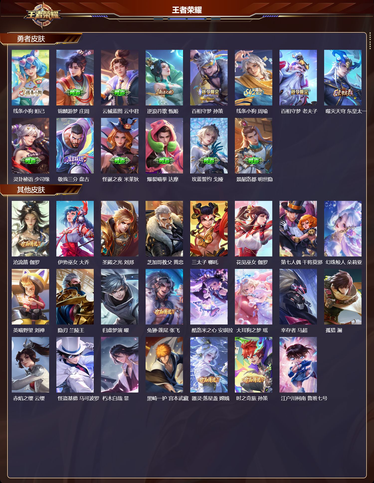 【23,其他皮肤】沧流箭,伽罗,伊势巫女,大乔,圣殿之光,刘邦,芝加哥教父,黄忠,三太子,哪吒,花见巫女,伽罗,第七人偶,干将莫邪,幻珠鲛人,朵莉亚,英喵野望,刘禅,隐刃,兰陵王,归虚梦演,曜,兔狲·蓬尾,张飞,酷洛米之心,安琪拉,大耳狗之梦,瑶,幸存者,马超,孤猎,澜,赤焰之缨,云缨,怪盗基德,马可波罗,朽木白哉,暃,黑崎一护,宫本武藏,器灵·落星盏,嫦娥,时之奇旅,孙策,江户川柯南,鲁班七号,