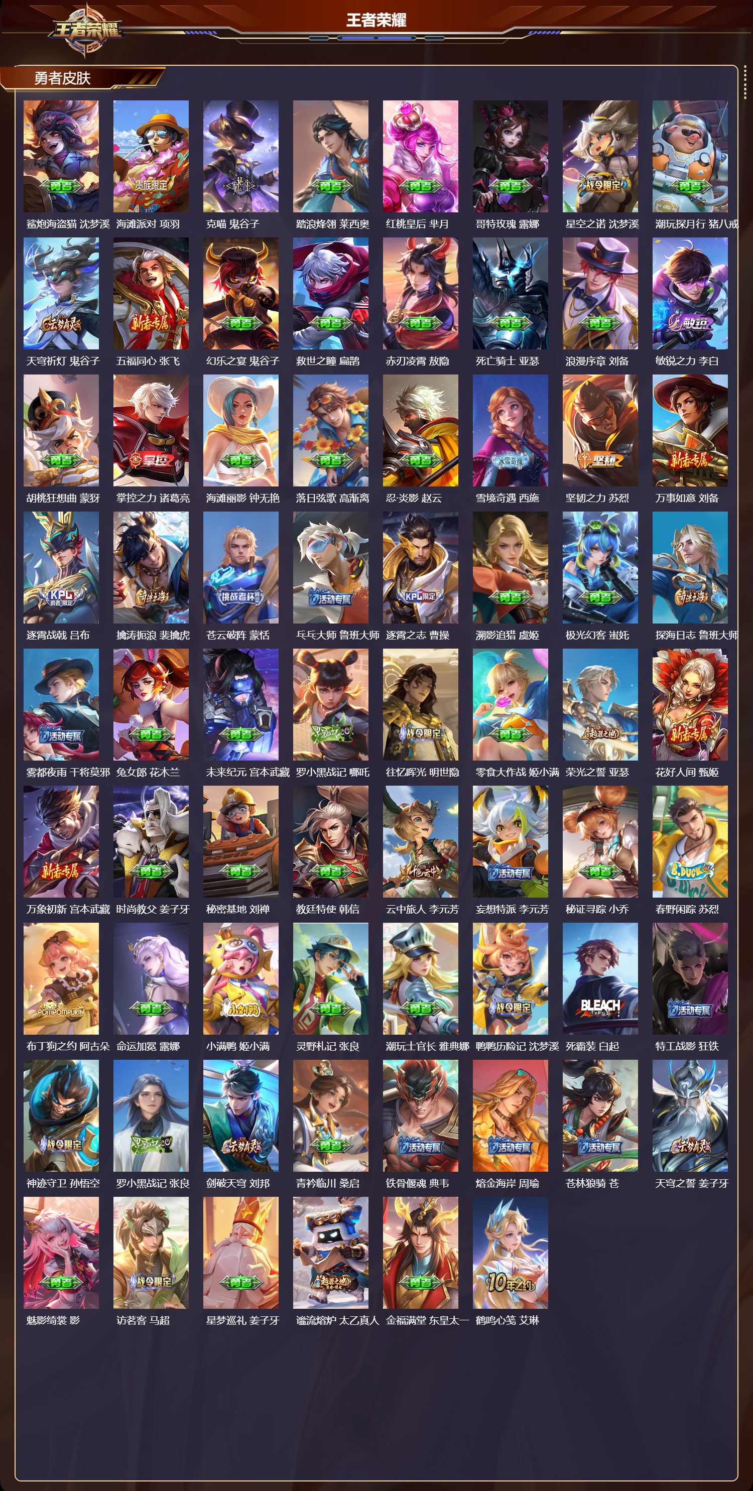 【93,勇者皮肤】沙漠行僧,达摩,大漠名商,沈梦溪,拳王,达摩,海盐诗旅,桑启,幻泉雾影,海月,白色死神,白起,黄金武士,典韦,阴阳师,狄仁杰,径山谋武,孙权,鲨炮海盗猫,沈梦溪,海滩派对,项羽,克喵,鬼谷子,踏浪烽翎,莱西奥,红桃皇后,芈月,哥特玫瑰,露娜,星空之诺,沈梦溪,潮玩探月行,猪八戒,天穹祈灯,鬼谷子,五福同心,张飞,幻乐之宴,鬼谷子,救世之瞳,扁鹊,赤刃凌霄,敖隐,死亡骑士,亚瑟,浪漫序章,刘备,敏锐之力,李白,胡桃狂想曲,蒙犽,掌控之力,诸葛亮,海滩丽影,钟无艳,落日弦歌,高渐离,忍·炎影,赵云,雪境奇遇,西施,坚韧之力,苏烈,万事如意,刘备,逐霄战戟,吕布,擒涛扼浪,裴擒虎,苍云破阵,蒙恬,乓乓大师,鲁班大师,逐霄之志,曹操,溯影追猎,虞姬,极光幻客,蚩奼,探海日志,鲁班大师,雾都夜雨,干将莫邪,兔女郎,花木兰,未来纪元,宫本武藏,罗小黑战记,哪吒,往忆晖光,明世隐,零食大作战,姬小满,荣光之誓,亚瑟,花好人间,甄姬,万象初新,宫本武藏,时尚教父,姜子牙,秘密基地,刘禅,教廷特使,韩信,云中旅人,李元芳,妄想特派,李元芳,秘证寻踪,小乔,春野闲踪,苏烈,布丁狗之约,阿古朵,命运加冕,露娜,小满鸭,姬小满,灵野札记,张良,潮玩士官长,雅典娜,鸭鸭历险记,沈梦溪,死霸装,白起,特工战影,狂铁,神迹守卫,孙悟空,罗小黑战记,张良,剑破天穹,刘邦,青衿临川,桑启,铁骨偃魂,典韦,熔金海岸,周瑜,苍林狼骑,苍,天穹之誓,姜子牙,魅影绮裳,影,访茗客,马超,星梦巡礼,姜子牙,谧流熔炉,太乙真人,金福满堂,东皇太一,鹤鸣心笺,艾琳,线条小狗,妲己,锦麟游梦,庄周,云械蓝图,云中君,逆浪荇歌,甄姬,百相守梦,孙策,线条小狗,周瑜,百相守梦,老夫子,噬灭天穹,东皇太一,灵卦秘语,少司缘,敬我三分,盘古,怪诞之夜,米莱狄,爆裂喵拳,达摩,玫蓝誓约,戈娅,景韶洛都,明世隐,