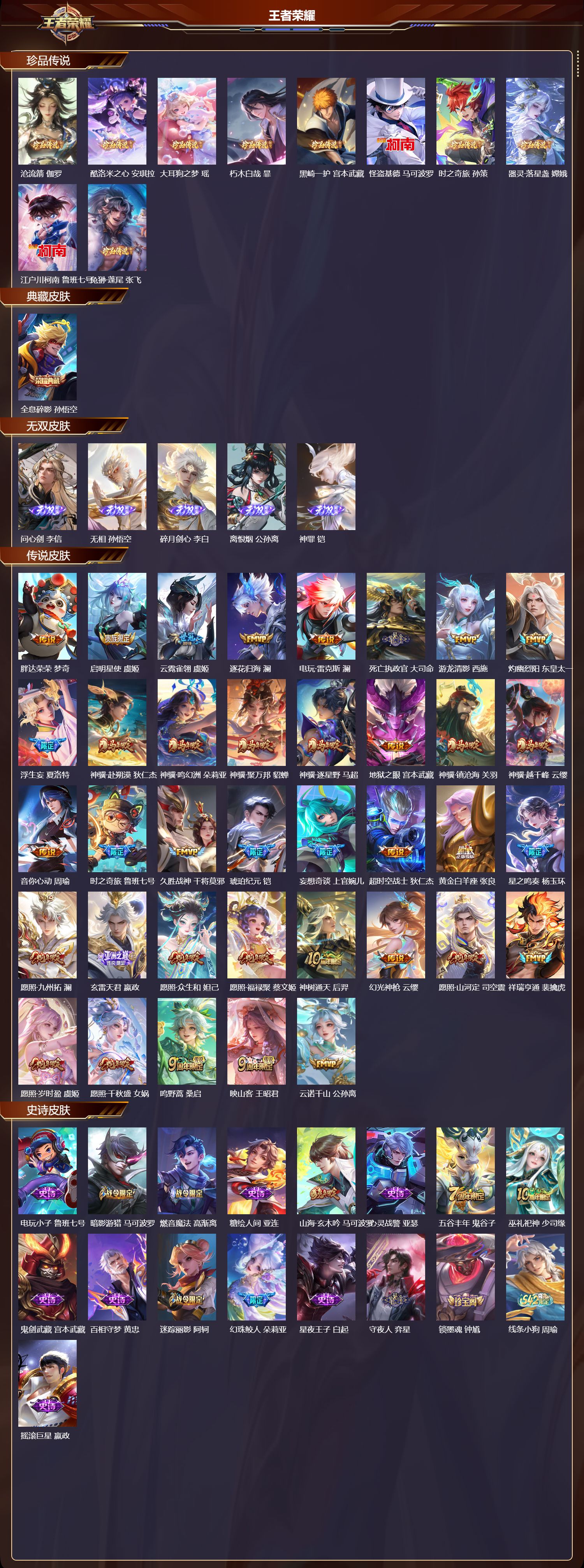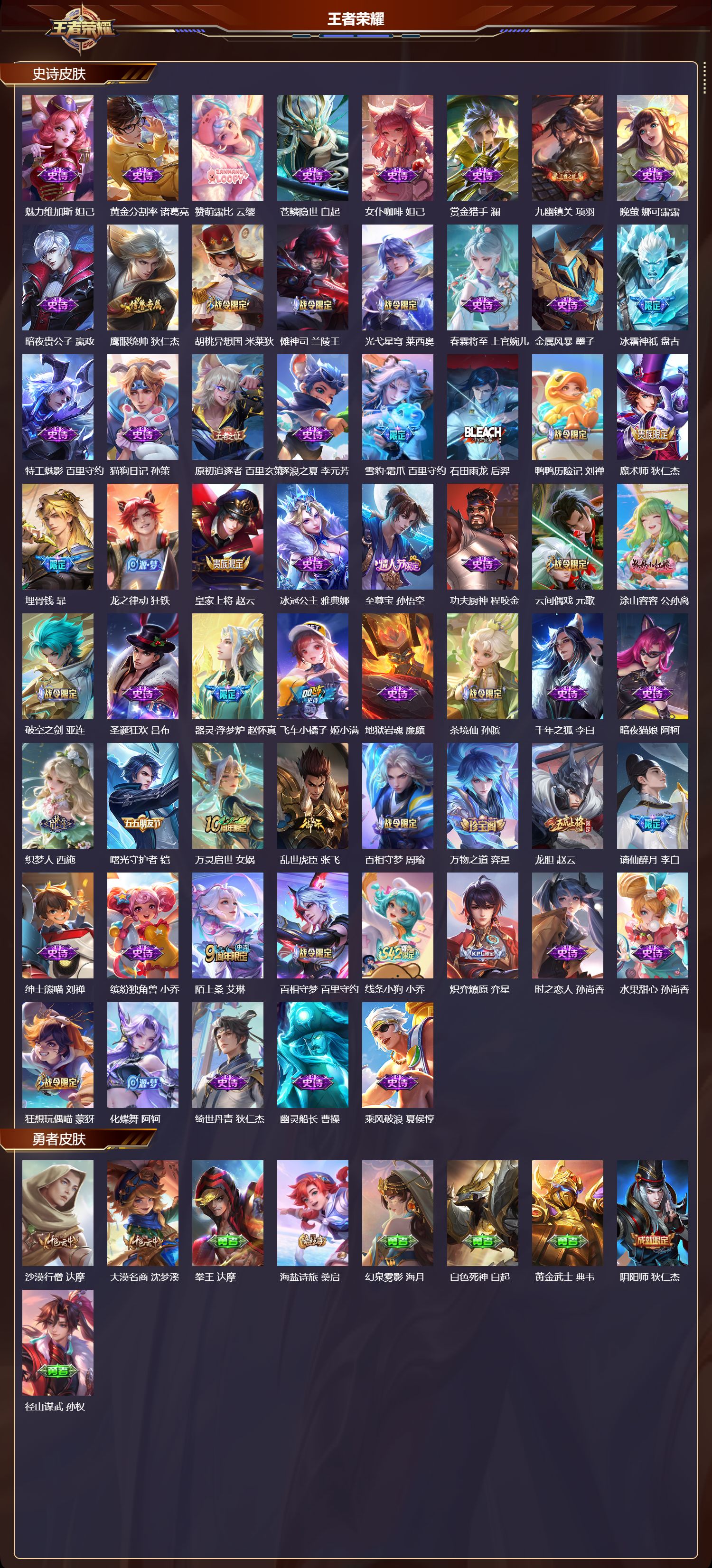 【78,史诗皮肤】电玩小子,鲁班七号,暗影游猎,马可波罗,燃音魔法,高渐离,糖绘人间,亚连,山海·玄木吟,马可波罗,心灵战警,亚瑟,五谷丰年,鬼谷子,巫礼祀神,少司缘,鬼剑武藏,宫本武藏,百相守梦,黄忠,迷踪丽影,阿轲,幻珠鲛人,朵莉亚,星夜王子,白起,守夜人,弈星,锁墨魂,钟馗,线条小狗,周瑜,摇滚巨星,嬴政,魅力维加斯,妲己,黄金分割率,诸葛亮,赞萌露比,云缨,苍鳞隐世,白起,女仆咖啡,妲己,赏金猎手,澜,九幽镇关,项羽,晚萤,娜可露露,暗夜贵公子,嬴政,鹰眼统帅,狄仁杰,胡桃异想国,米莱狄,傩神司,兰陵王,光弋星穹,莱西奥,春霖将至,上官婉儿,金属风暴,墨子,冰霜神祇,盘古,特工魅影,百里守约,猫狗日记,孙策,原初追逐者,百里玄策,逐浪之夏,李元芳,雪豹·霜爪,百里守约,石田雨龙,后羿,鸭鸭历险记,刘禅,魔术师,狄仁杰,埋骨钱,暃,龙之律动,狂铁,皇家上将,赵云,冰冠公主,雅典娜,至尊宝,孙悟空,功夫厨神,程咬金,云间偶戏,元歌,涂山容容,公孙离,破空之剑,亚连,圣诞狂欢,吕布,器灵·浮梦炉,赵怀真,飞车小橘子,姬小满,地狱岩魂,廉颇,茶境仙,孙膑,千年之狐,李白,暗夜猫娘,阿轲,织梦人,西施,曙光守护者,铠,万灵启世,女娲,乱世虎臣,张飞,百相守梦,周瑜,万物之道,弈星,龙胆,赵云,谪仙醉月,李白,绅士熊喵,刘禅,缤纷独角兽,小乔,陌上桑,艾琳,百相守梦,百里守约,线条小狗,小乔,炽弈燎原,弈星,时之恋人,孙尚香,水果甜心,孙尚香,狂想玩偶喵,蒙犽,化蝶舞,阿轲,绮世丹青,狄仁杰,幽灵船长,曹操,乘风破浪,夏侯惇,