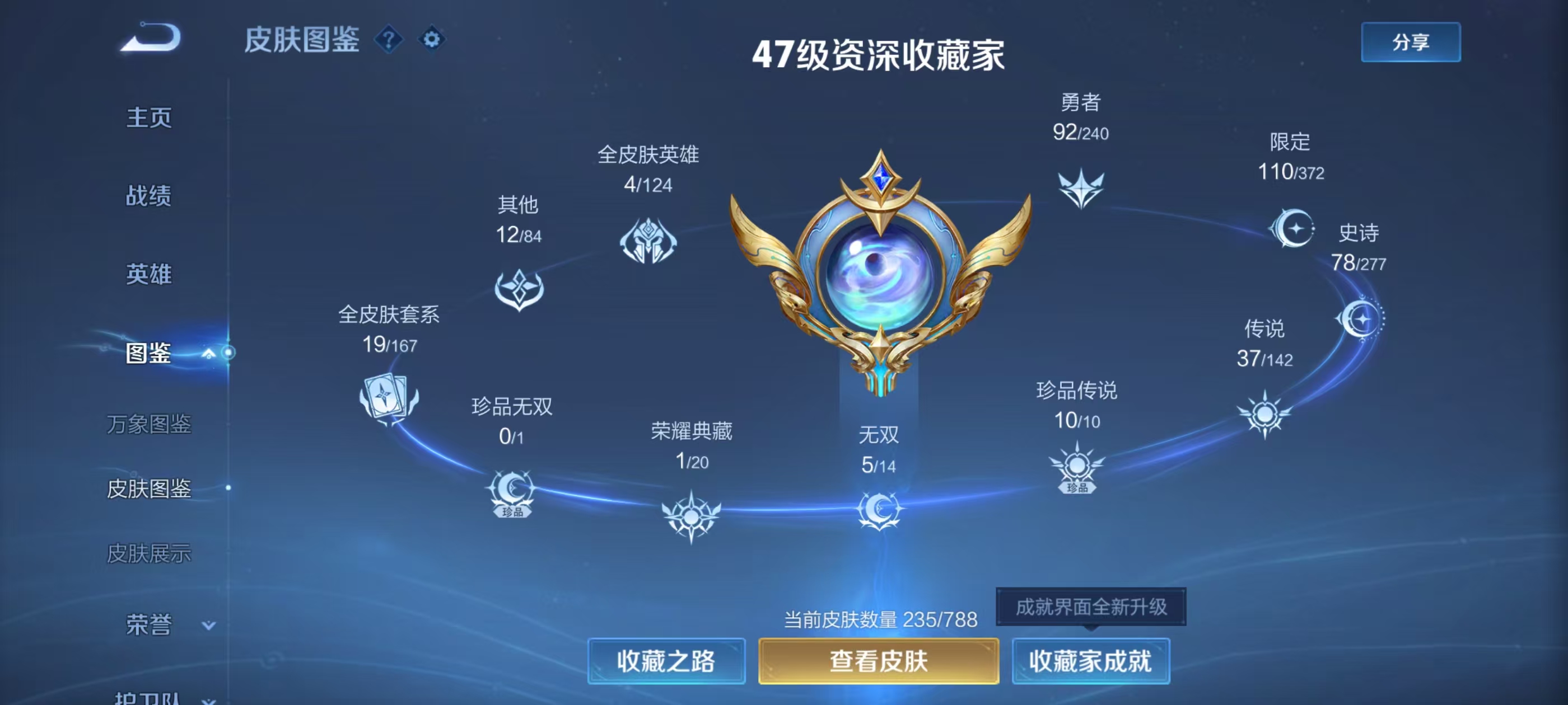 PX_2563458-Q/非凡王者/235皮肤/129英雄/1典藏/0珍品无双/5无双/10珍品传说/37传说/78史诗/9稀有英雄