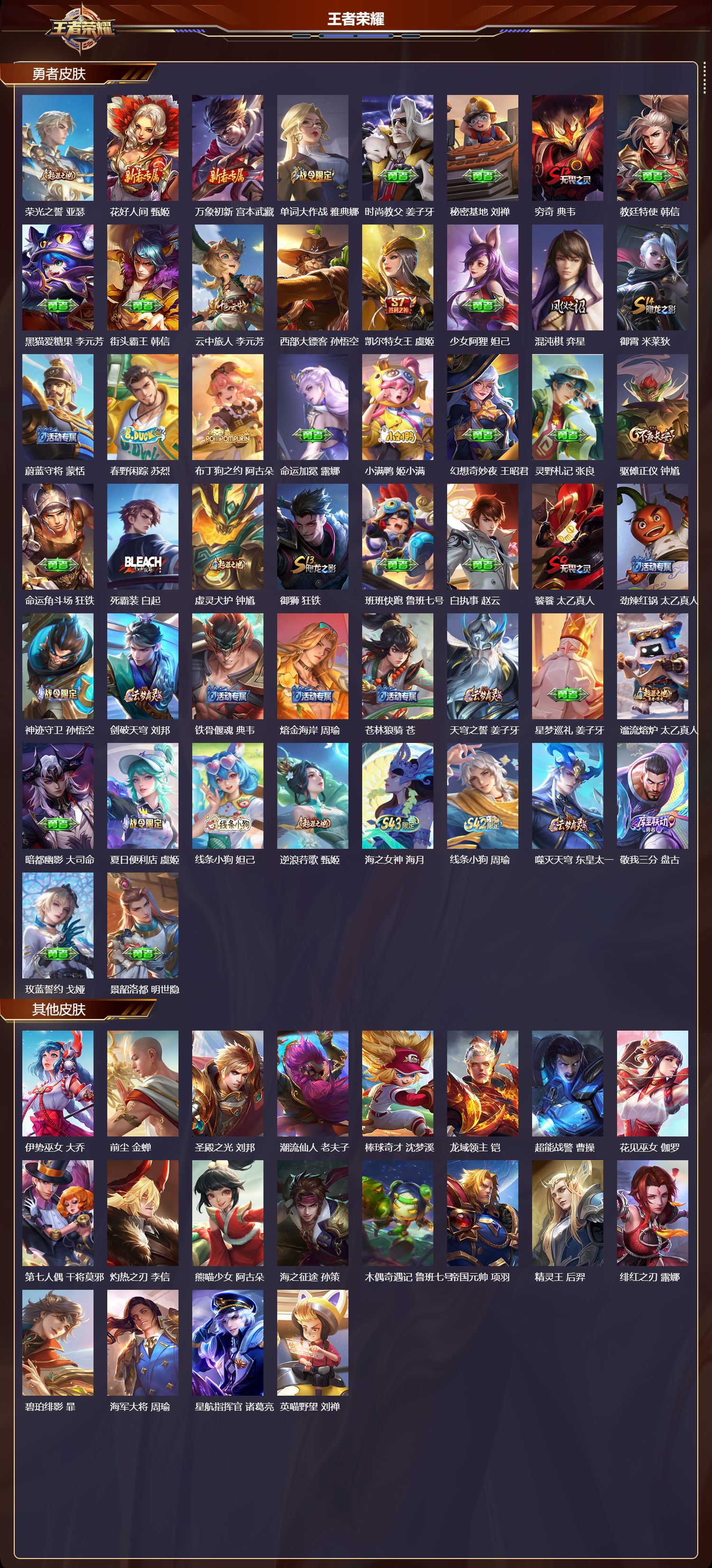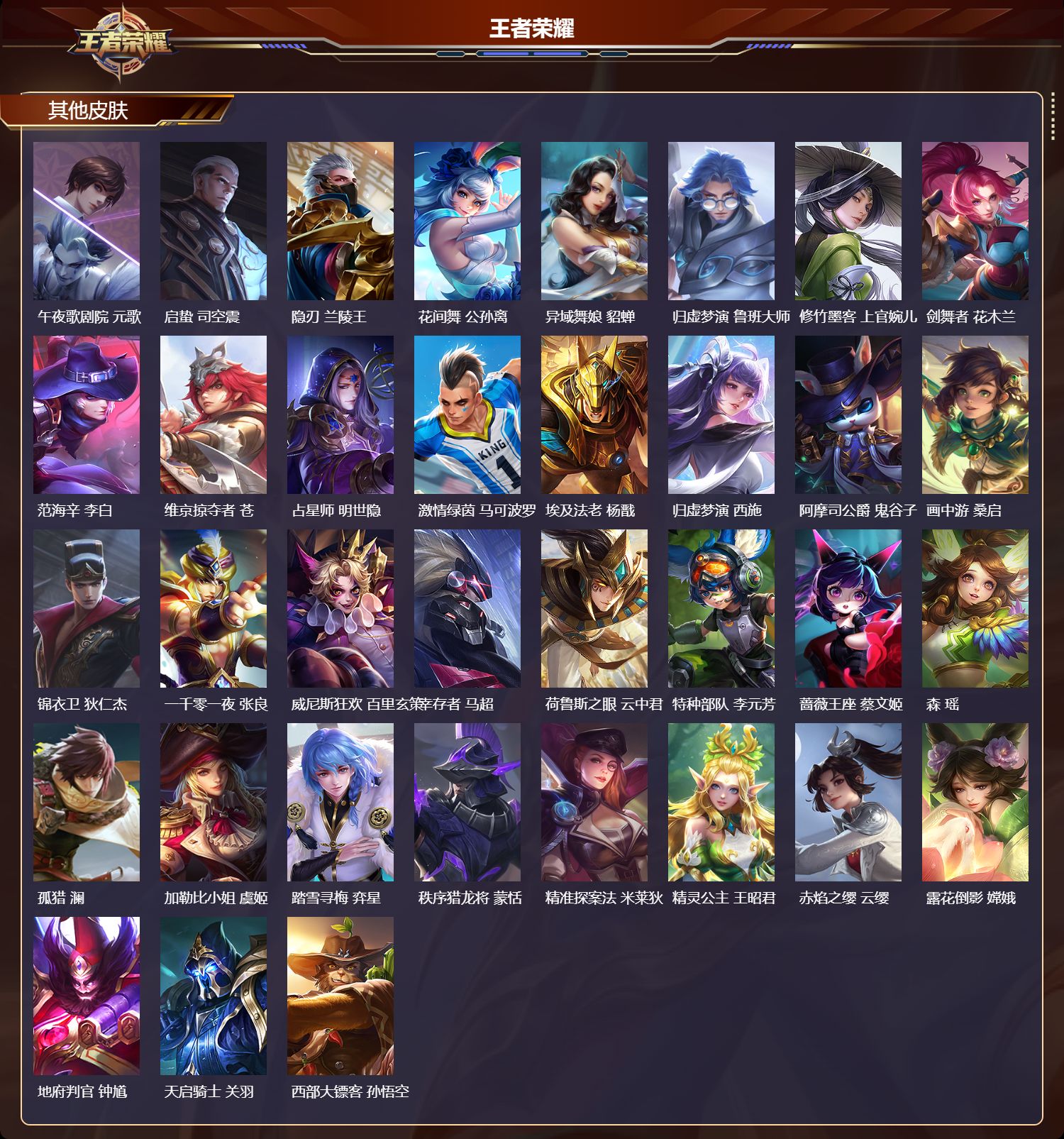 【55,其他皮肤】伊势巫女,大乔,前尘,金蝉,圣殿之光,刘邦,潮流仙人,老夫子,棒球奇才,沈梦溪,龙域领主,铠,超能战警,曹操,花见巫女,伽罗,第七人偶,干将莫邪,灼热之刃,李信,熊喵少女,阿古朵,海之征途,孙策,木偶奇遇记,鲁班七号,帝国元帅,项羽,精灵王,后羿,绯红之刃,露娜,碧珀绯影,暃,海军大将,周瑜,星航指挥官,诸葛亮,英喵野望,刘禅,午夜歌剧院,元歌,启蛰,司空震,隐刃,兰陵王,花间舞,公孙离,异域舞娘,貂蝉,归虚梦演,鲁班大师,修竹墨客,上官婉儿,剑舞者,花木兰,范海辛,李白,维京掠夺者,苍,占星师,明世隐,激情绿茵,马可波罗,埃及法老,杨戬,归虚梦演,西施,阿摩司公爵,鬼谷子,画中游,桑启,锦衣卫,狄仁杰,一千零一夜,张良,威尼斯狂欢,百里玄策,幸存者,马超,荷鲁斯之眼,云中君,特种部队,李元芳,蔷薇王座,蔡文姬,森,瑶,孤猎,澜,加勒比小姐,虞姬,踏雪寻梅,弈星,秩序猎龙将,蒙恬,精准探案法,米莱狄,精灵公主,王昭君,赤焰之缨,云缨,露花倒影,嫦娥,地府判官,钟馗,天启骑士,关羽,西部大镖客,孙悟空,