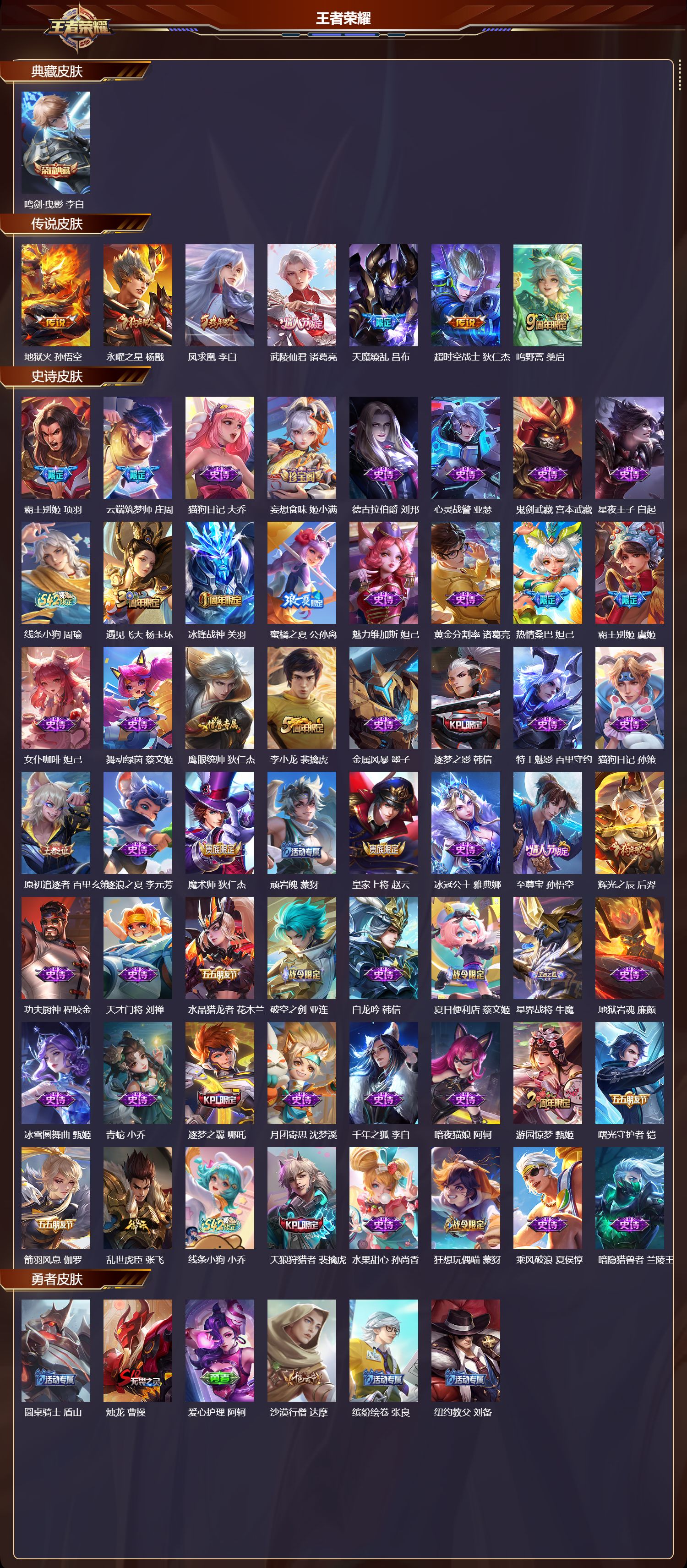 【56,史诗皮肤】霸王别姬,项羽,云端筑梦师,庄周,猫狗日记,大乔,妄想食味,姬小满,德古拉伯爵,刘邦,心灵战警,亚瑟,鬼剑武藏,宫本武藏,星夜王子,白起,线条小狗,周瑜,遇见飞天,杨玉环,冰锋战神,关羽,蜜橘之夏,公孙离,魅力维加斯,妲己,黄金分割率,诸葛亮,热情桑巴,妲己,霸王别姬,虞姬,女仆咖啡,妲己,舞动绿茵,蔡文姬,鹰眼统帅,狄仁杰,李小龙,裴擒虎,金属风暴,墨子,逐梦之影,韩信,特工魅影,百里守约,猫狗日记,孙策,原初追逐者,百里玄策,逐浪之夏,李元芳,魔术师,狄仁杰,顽岩魄,蒙犽,皇家上将,赵云,冰冠公主,雅典娜,至尊宝,孙悟空,辉光之辰,后羿,功夫厨神,程咬金,天才门将,刘禅,水晶猎龙者,花木兰,破空之剑,亚连,白龙吟,韩信,夏日便利店,蔡文姬,星界战将,牛魔,地狱岩魂,廉颇,冰雪圆舞曲,甄姬,青蛇,小乔,逐梦之翼,哪吒,月团寄思,沈梦溪,千年之狐,李白,暗夜猫娘,阿轲,游园惊梦,甄姬,曙光守护者,铠,箭羽风息,伽罗,乱世虎臣,张飞,线条小狗,小乔,天狼狩猎者,裴擒虎,水果甜心,孙尚香,狂想玩偶喵,蒙犽,乘风破浪,夏侯惇,暗隐猎兽者,兰陵王,