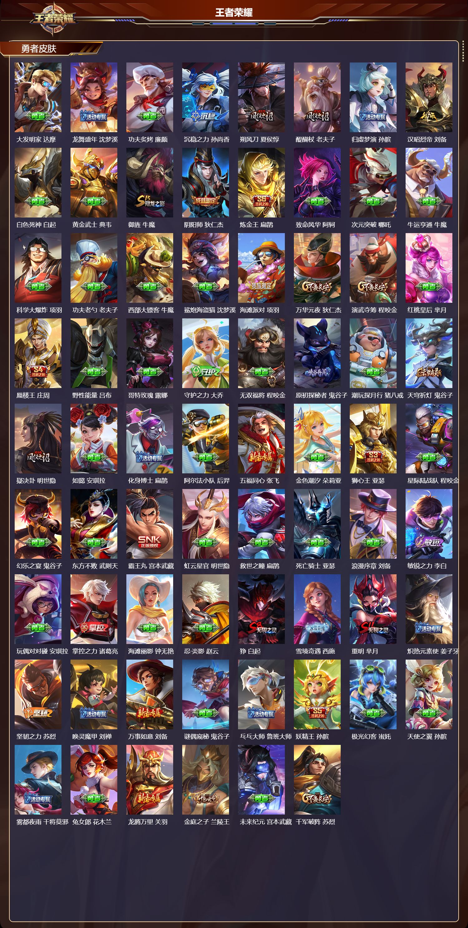 【126,勇者皮肤】圆桌骑士,盾山,烛龙,曹操,爱心护理,阿轲,沙漠行僧,达摩,缤纷绘卷,张良,纽约教父,刘备,大发明家,达摩,龙舞盛年,沈梦溪,功夫炙烤,廉颇,沉稳之力,孙尚香,朔风刀,夏侯惇,醍醐杖,老夫子,归虚梦演,孙膑,汉昭烈帝,刘备,白色死神,白起,黄金武士,典韦,御旌,牛魔,阴阳师,狄仁杰,炼金王,扁鹊,致命风华,阿轲,次元突破,哪吒,牛运亨通,牛魔,科学大爆炸,项羽,功夫老勺,老夫子,西部大镖客,牛魔,鲨炮海盗猫,沈梦溪,海滩派对,项羽,万华元夜,狄仁杰,演武夺筹,程咬金,红桃皇后,芈月,蜃楼王,庄周,野性能量,吕布,哥特玫瑰,露娜,守护之力,大乔,无双福将,程咬金,原初探秘者,鬼谷子,潮玩探月行,猪八戒,天穹祈灯,鬼谷子,疑决卦,明世隐,如懿,安琪拉,化身博士,扁鹊,阿尔法小队,后羿,五福同心,张飞,金色潮汐,朵莉亚,狮心王,亚瑟,星际陆战队,程咬金,幻乐之宴,鬼谷子,东方不败,武则天,霸王丸,宫本武藏,虹云星官,明世隐,救世之瞳,扁鹊,死亡骑士,亚瑟,浪漫序章,刘备,敏锐之力,李白,玩偶对对碰,安琪拉,掌控之力,诸葛亮,海滩丽影,钟无艳,忍·炎影,赵云,狰,白起,雪境奇遇,西施,重明,芈月,炽热元素使,姜子牙,坚韧之力,苏烈,唤灵魔甲,刘禅,万事如意,刘备,谜偶窥秘,鬼谷子,乓乓大师,鲁班大师,妖精王,孙膑,极光幻客,蚩奼,天使之翼,孙膑,雾都夜雨,干将莫邪,兔女郎,花木兰,龙腾万里,关羽,金庭之子,兰陵王,未来纪元,宫本武藏,千军破阵,苏烈,荣光之誓,亚瑟,花好人间,甄姬,万象初新,宫本武藏,单词大作战,雅典娜,时尚教父,姜子牙,秘密基地,刘禅,穷奇,典韦,教廷特使,韩信,黑猫爱糖果,李元芳,街头霸王,韩信,云中旅人,李元芳,西部大镖客,孙悟空,凯尔特女王,虞姬,少女阿狸,妲己,混沌棋,弈星,御霄,米莱狄,蔚蓝守将,蒙恬,春野闲踪,苏烈,布丁狗之约,阿古朵,命运加冕,露娜,小满鸭,姬小满,幻想奇妙夜,王昭君,灵野札记,张良,驱傩正仪,钟馗,命运角斗场,狂铁,死霸装,白起,虚灵犬护,钟馗,御狮,狂铁,班班快跑,鲁班七号,白执事,赵云,饕餮,太乙真人,劲辣红锅,太乙真人,神迹守卫,孙悟空,剑破天穹,刘邦,铁骨偃魂,典韦,熔金海岸,周瑜,苍林狼骑,苍,天穹之誓,姜子牙,星梦巡礼,姜子牙,谧流熔炉,太乙真人,暗都幽影,大司命,夏日便利店,虞姬,线条小狗,妲己,逆浪荇歌,甄姬,海之女神,海月,线条小狗,周瑜,噬灭天穹,东皇太一,敬我三分,盘古,玫蓝誓约,戈娅,景韶洛都,明世隐,