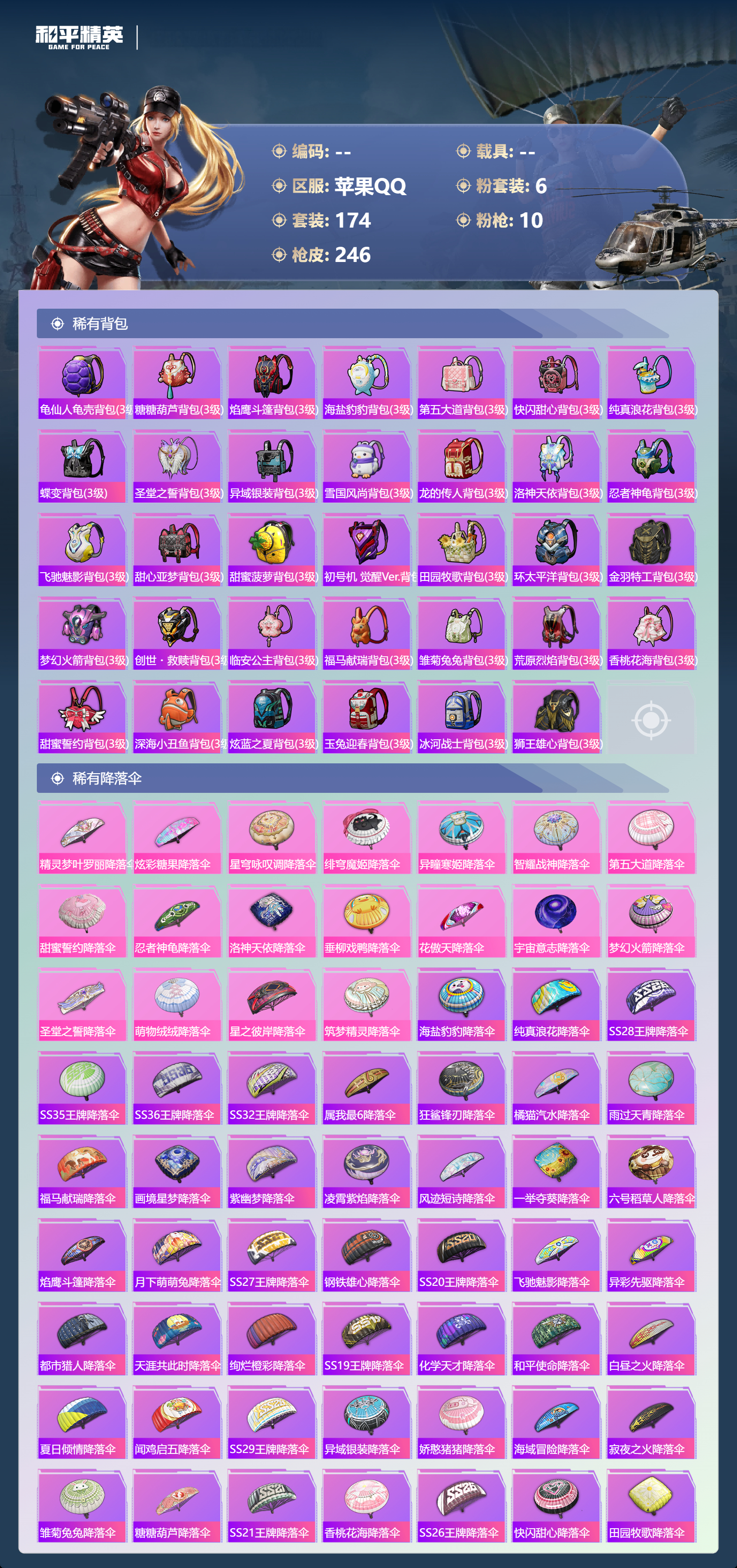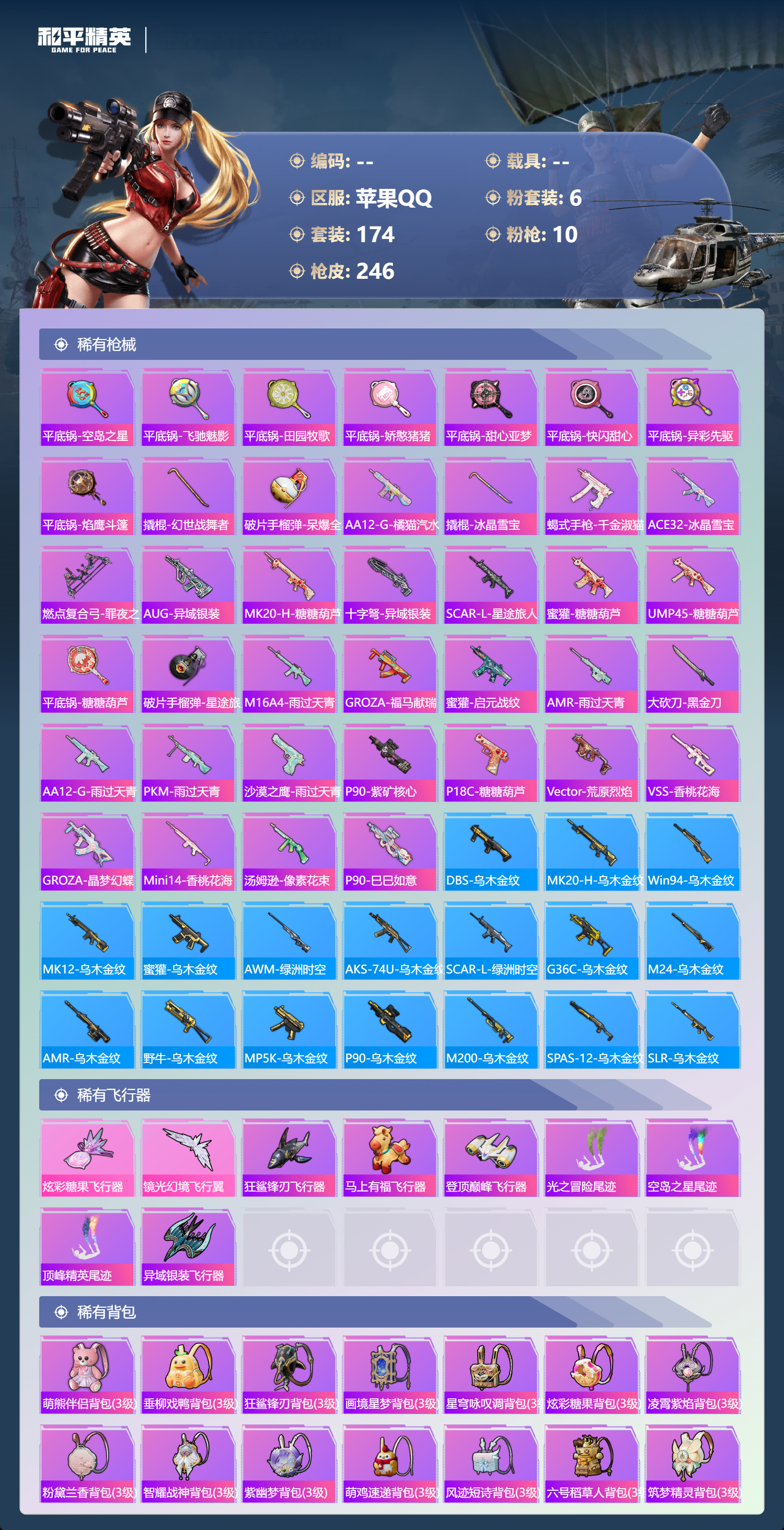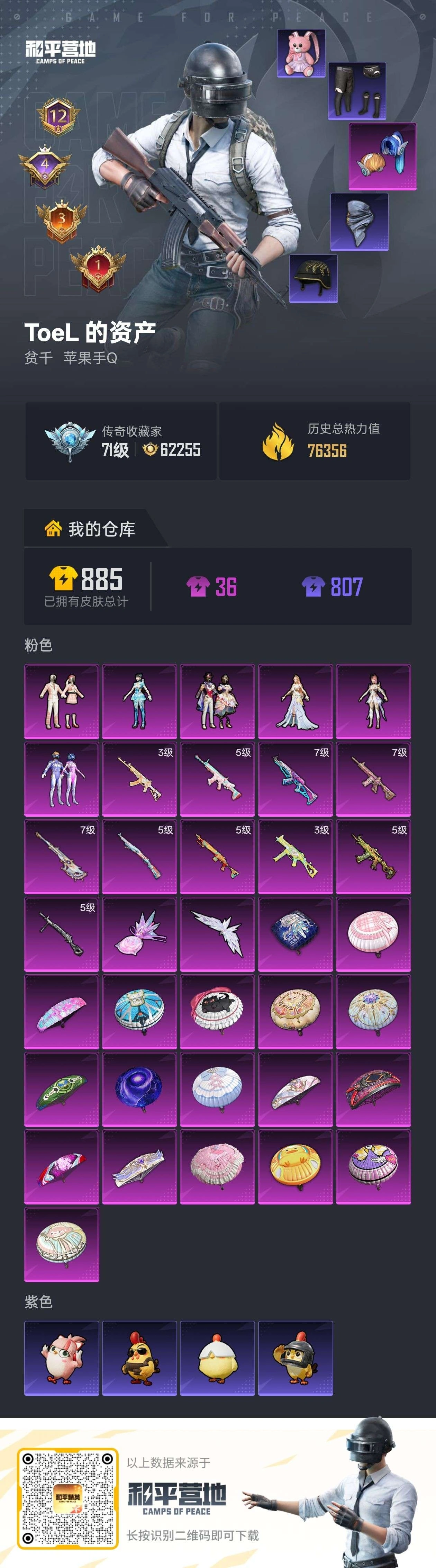 PX_2551352-,苹果手Q-12王牌印记-6粉装-10特效枪-76410热力值-174套装-246枪皮-4卓越印记-3传奇印记