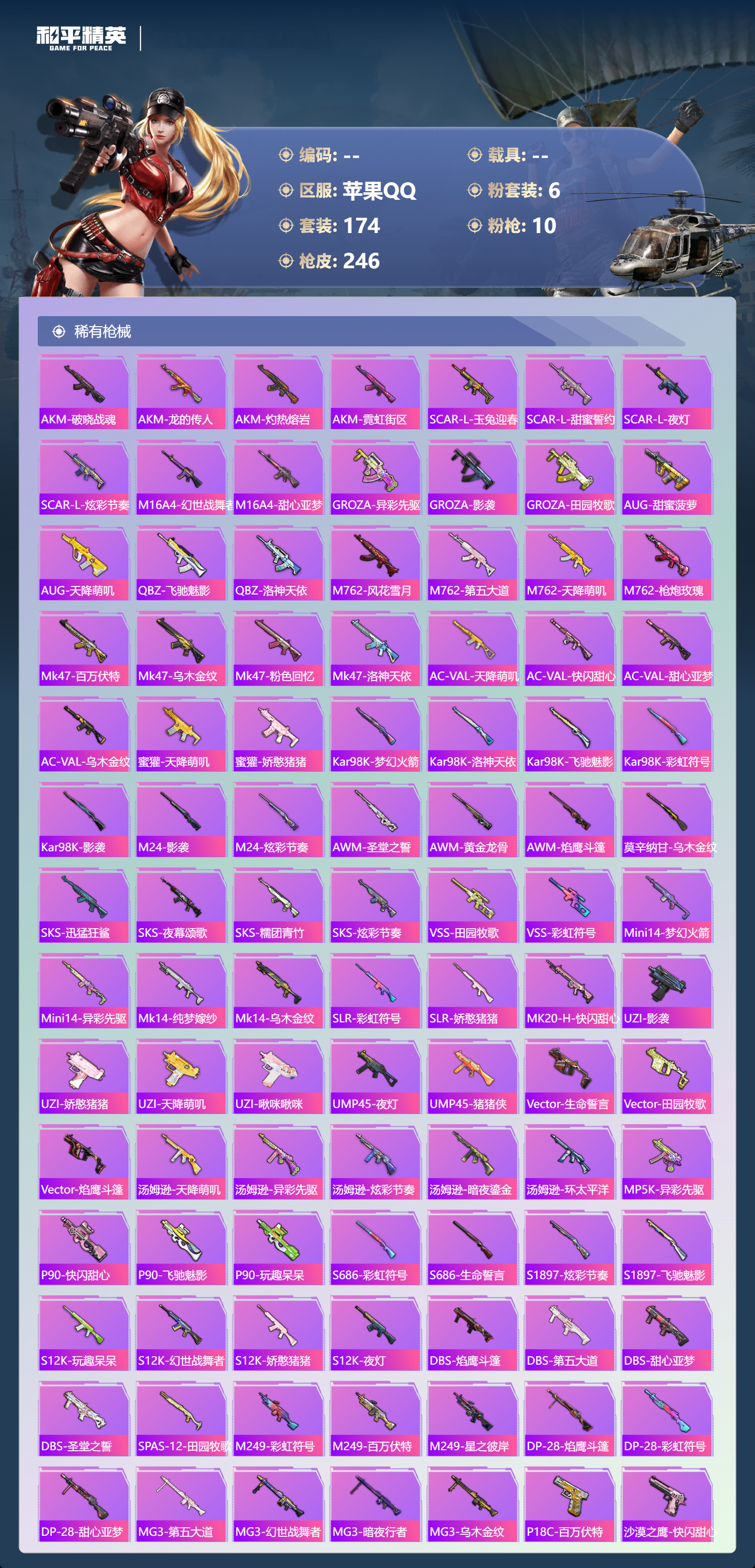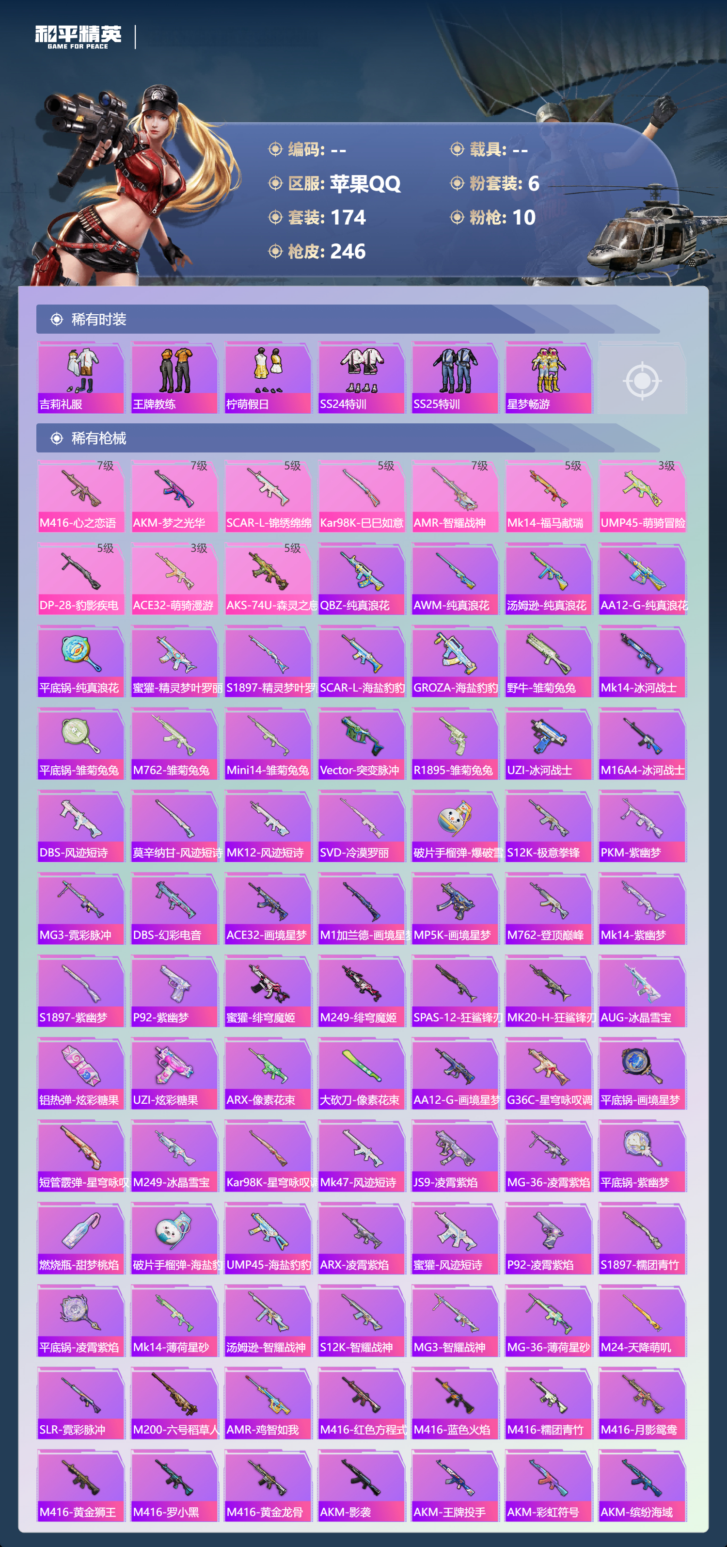 【245稀有枪械】M416-心之恋语/7级,AKM-梦之光华/7级,SCAR-L-锦绣绵绵/5级,Kar98K-巳巳如意/5级,AMR-智耀战神/7级,Mk14-福马献瑞/5级,UMP45-萌骑冒险/3级,DP-28-豹影疾电/5级,ACE32-萌骑漫游/3级,AKS-74U-森灵之息/5级,QBZ-纯真浪花,AWM-纯真浪花,汤姆逊-纯真浪花,DBS-乌木金纹,AA12-G-纯真浪花,平底锅-纯真浪花,蜜獾-精灵梦叶罗丽,S1897-精灵梦叶罗丽,SCAR-L-海盐豹豹,GROZA-海盐豹豹,野牛-雏菊兔兔,Mk14-冰河战士,平底锅-雏菊兔兔,M762-雏菊兔兔,Mini14-雏菊兔兔,Vector-突变脉冲,R1895-雏菊兔兔,UZI-冰河战士,M16A4-冰河战士,MK20-H-乌木金纹,DBS-风迹短诗,莫辛纳甘-风迹短诗,Win94-乌木金纹,MK12-风迹短诗,MK12-乌木金纹,SVD-冷漠罗丽,破片手榴弹-爆破雪人,S12K-极意拳锋,PKM-紫幽梦,MG3-霓彩脉冲,DBS-幻彩电音,ACE32-画境星梦,M1加兰德-画境星梦,MP5K-画境星梦,M762-登顶巅峰,Mk14-紫幽梦,蜜獾-乌木金纹,S1897-紫幽梦,P92-紫幽梦,蜜獾-绯穹魔姬,AWM-绿洲时空,M249-绯穹魔姬,SPAS-12-狂鲨锋刃,MK20-H-狂鲨锋刃,AUG-冰晶雪宝,铝热弹-炫彩糖果,UZI-炫彩糖果,ARX-像素花束,大砍刀-像素花束,AA12-G-画境星梦,G36C-星穹咏叹调,平底锅-画境星梦,短管霰弹-星穹咏叹调,M249-冰晶雪宝,Kar98K-星穹咏叹调,Mk47-风迹短诗,JS9-凌霄紫焰,MG-36-凌霄紫焰,平底锅-紫幽梦,燃烧瓶-甜梦桃焰,破片手榴弹-海盐豹豹,UMP45-海盐豹豹,ARX-凌霄紫焰,AKS-74U-乌木金纹,蜜獾-风迹短诗,P92-凌霄紫焰,S1897-糯团青竹,平底锅-凌霄紫焰,Mk14-薄荷星砂,汤姆逊-智耀战神,S12K-智耀战神,MG3-智耀战神,MG-36-薄荷星砂,SCAR-L-绿洲时空,M24-天降萌叽,SLR-霓彩脉冲,M200-六号稻草人,AMR-鸡智如我,M416-红色方程式,M416-蓝色火焰,M416-糯团青竹,M416-月影鸳鸯,M416-黄金狮王,M416-罗小黑,M416-黄金龙骨,AKM-影袭,AKM-王牌投手,AKM-彩虹符号,AKM-缤纷海域,AKM-破晓战魂,AKM-龙的传人,AKM-灼热熔岩,AKM-霓虹街区,SCAR-L-玉兔迎春,SCAR-L-甜蜜誓约,SCAR-L-夜灯,SCAR-L-炫彩节奏,M16A4-幻世战舞者,M16A4-甜心亚梦,GROZA-异彩先驱,GROZA-影袭,GROZA-田园牧歌,AUG-甜蜜菠萝,AUG-天降萌叽,QBZ-飞驰魅影,QBZ-洛神天依,M762-风花雪月,M762-第五大道,M762-天降萌叽,M762-枪炮玫瑰,Mk47-百万伏特,Mk47-乌木金纹,Mk47-粉色回忆,Mk47-洛神天依,G36C-乌木金纹,AC-VAL-天降萌叽,AC-VAL-快闪甜心,AC-VAL-甜心亚梦,AC-VAL-乌木金纹,蜜獾-天降萌叽,蜜獾-娇憨猪猪,Kar98K-梦幻火箭,Kar98K-洛神天依,Kar98K-飞驰魅影,Kar98K-彩虹符号,Kar98K-影袭,M24-乌木金纹,M24-影袭,M24-炫彩节奏,AWM-圣堂之誓,AWM-黄金龙骨,AWM-焰鹰斗篷,莫辛纳甘-乌木金纹,AMR-乌木金纹,SKS-迅猛狂鲨,SKS-夜幕颂歌,SKS-糯团青竹,SKS-炫彩节奏,VSS-田园牧歌,VSS-彩虹符号,Mini14-梦幻火箭,Mini14-异彩先驱,Mk14-纯梦嫁纱,Mk14-乌木金纹,SLR-彩虹符号,SLR-娇憨猪猪,MK20-H-快闪甜心,UZI-影袭,UZI-娇憨猪猪,UZI-天降萌叽,UZI-啾咪啾咪,UMP45-夜灯,UMP45-猪猪侠,Vector-生命誓言,Vector-田园牧歌,Vector-焰鹰斗篷,汤姆逊-天降萌叽,汤姆逊-异彩先驱,汤姆逊-炫彩节奏,汤姆逊-暗夜鎏金,汤姆逊-环太平洋,野牛-乌木金纹,MP5K-异彩先驱,MP5K-乌木金纹,P90-乌木金纹,P90-快闪甜心,P90-飞驰魅影,P90-玩趣呆呆,S686-彩虹符号,S686-生命誓言,S1897-炫彩节奏,S1897-飞驰魅影,S12K-玩趣呆呆,S12K-幻世战舞者,S12K-娇憨猪猪,S12K-夜灯,DBS-焰鹰斗篷,DBS-第五大道,DBS-甜心亚梦,DBS-圣堂之誓,SPAS-12-田园牧歌,M249-彩虹符号,M249-百万伏特,M249-星之彼岸,DP-28-焰鹰斗篷,DP-28-彩虹符号,DP-28-甜心亚梦,MG3-第五大道,MG3-幻世战舞者,MG3-暗夜行者,MG3-乌木金纹,P18C-百万伏特,沙漠之鹰-快闪甜心,平底锅-空岛之星,平底锅-飞驰魅影,平底锅-田园牧歌,平底锅-娇憨猪猪,平底锅-甜心亚梦,平底锅-快闪甜心,平底锅-异彩先驱,平底锅-焰鹰斗篷,撬棍-幻世战舞者,破片手榴弹-呆爆全场,AA12-G-橘猫汽水,撬棍-冰晶雪宝,蝎式手枪-千金淑猫,ACE32-冰晶雪宝,燃点复合弓-罪夜之冕,AUG-异域银装,MK20-H-糖糖葫芦,M200-乌木金纹,十字弩-异域银装,SCAR-L-星途旅人,蜜獾-糖糖葫芦,UMP45-糖糖葫芦,SPAS-12-乌木金纹,平底锅-糖糖葫芦,破片手榴弹-星途旅人,M16A4-雨过天青,GROZA-福马献瑞,蜜獾-启元战纹,AMR-雨过天青,SLR-乌木金纹,大砍刀-黑金刀,AA12-G-雨过天青,PKM-雨过天青,沙漠之鹰-雨过天青,P90-紫矿核心,P18C-糖糖葫芦,Vector-荒原烈焰,VSS-香桃花海,GROZA-晶梦幻蝶,Mini14-香桃花海,汤姆逊-像素花束,P90-巳巳如意