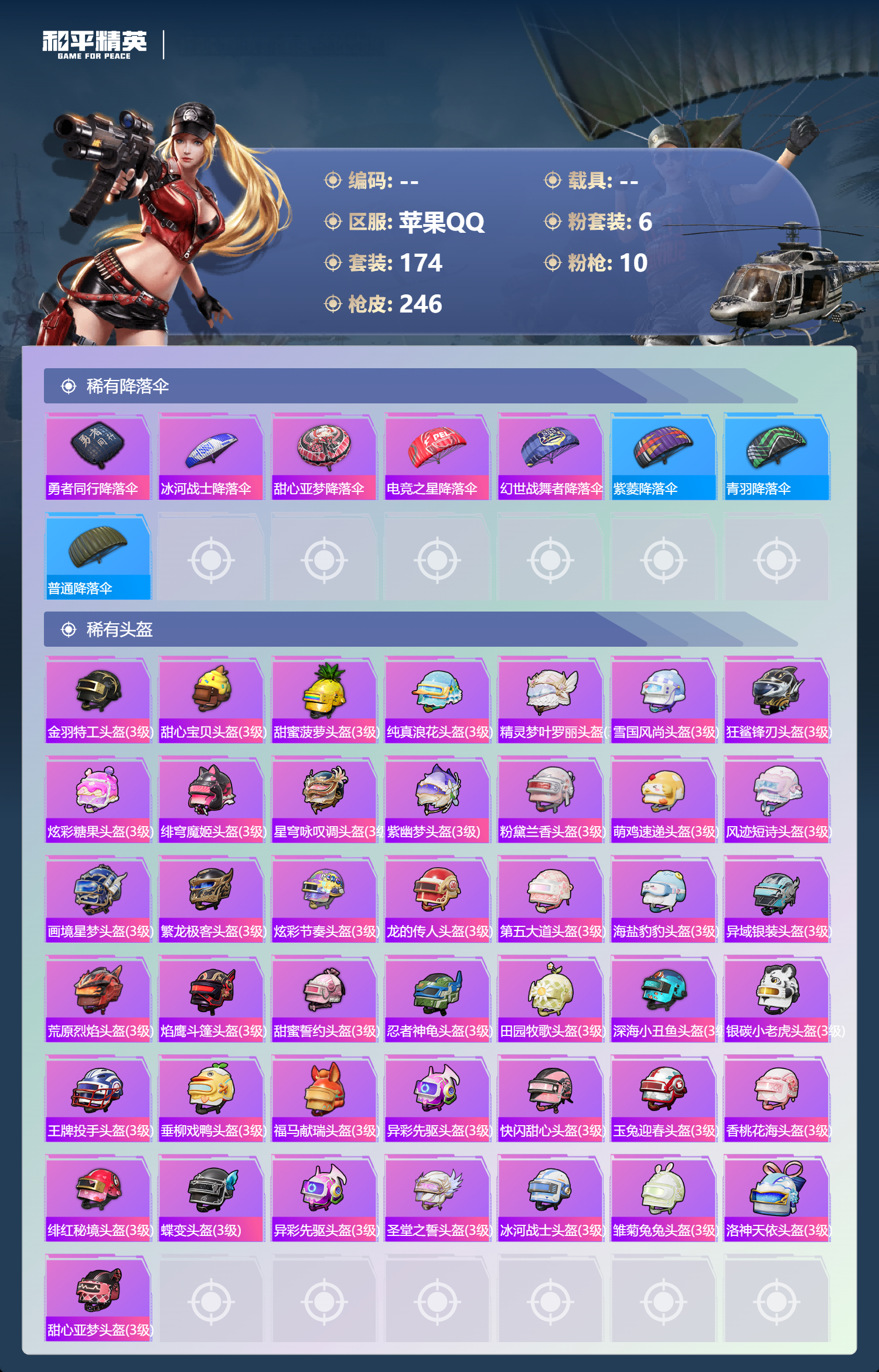 【43稀有头盔】金羽特工头盔(3级),甜心宝贝头盔(3级),甜蜜菠萝头盔(3级),纯真浪花头盔(3级),精灵梦叶罗丽头盔(3级),雪国风尚头盔(3级),狂鲨锋刃头盔(3级),炫彩糖果头盔(3级),绯穹魔姬头盔(3级),星穹咏叹调头盔(3级),紫幽梦头盔(3级),粉黛兰香头盔(3级),萌鸡速递头盔(3级),风迹短诗头盔(3级),画境星梦头盔(3级),繁龙极客头盔(3级),炫彩节奏头盔(3级),龙的传人头盔(3级),第五大道头盔(3级),海盐豹豹头盔(3级),异域银装头盔(3级),荒原烈焰头盔(3级),焰鹰斗篷头盔(3级),甜蜜誓约头盔(3级),忍者神龟头盔(3级),田园牧歌头盔(3级),深海小丑鱼头盔(3级),银碳小老虎头盔(3级),王牌投手头盔(3级),垂柳戏鸭头盔(3级),福马献瑞头盔(3级),异彩先驱头盔(3级),快闪甜心头盔(3级),玉兔迎春头盔(3级),香桃花海头盔(3级),绯红秘境头盔(3级),蝶变头盔(3级),异彩先驱头盔(3级),圣堂之誓头盔(3级),冰河战士头盔(3级),雏菊兔兔头盔(3级),洛神天依头盔(3级),甜心亚梦头盔(3级)