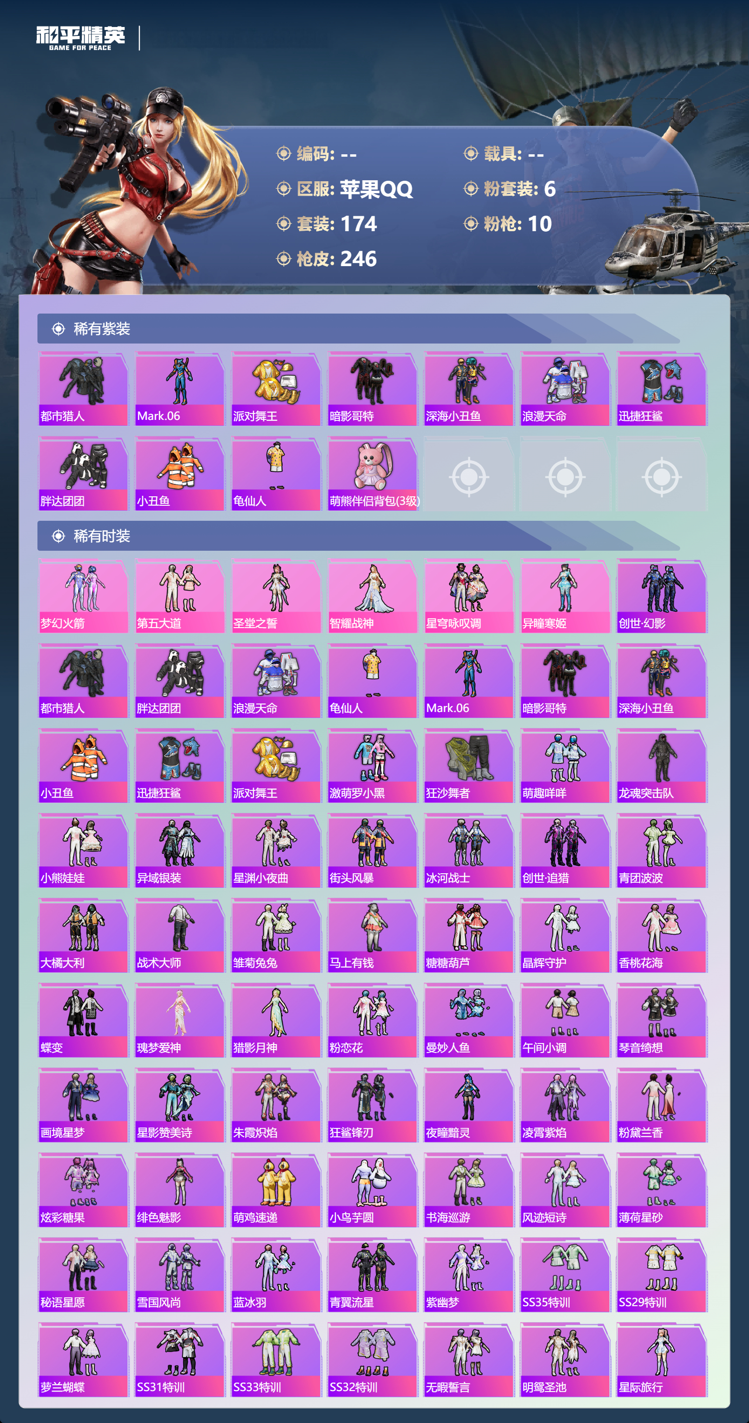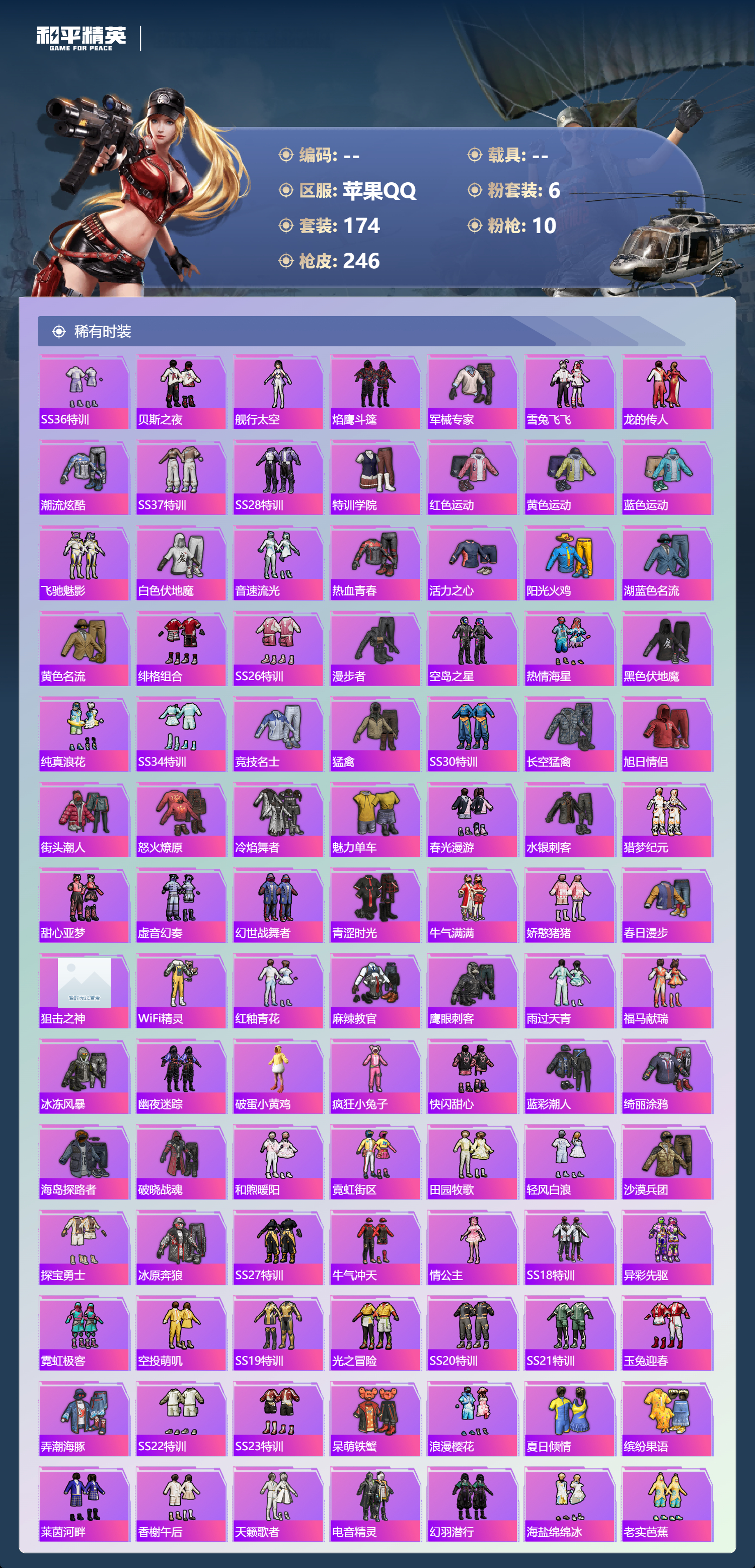 【174稀有时装】梦幻火箭,第五大道,圣堂之誓,智耀战神,创世·幻影,星穹咏叹调,异瞳寒姬,都市猎人,胖达团团,浪漫天命,龟仙人,Mark.06,暗影哥特,深海小丑鱼,小丑鱼,迅捷狂鲨,派对舞王,激萌罗小黑,狂沙舞者,萌趣咩咩,龙魂突击队,小熊娃娃,异域银装,星渊小夜曲,街头风暴,冰河战士,创世·追猎,青团波波,大橘大利,战术大师,雏菊兔兔,马上有钱,糖糖葫芦,晶辉守护,香桃花海,蝶变,瑰梦爱神,猎影月神,粉恋花,曼妙人鱼,午间小调,琴音绮想,画境星梦,星影赞美诗,朱霞炽焰,狂鲨锋刃,夜瞳黯灵,凌霄紫焰,粉黛兰香,炫彩糖果,绯色魅影,萌鸡速递,小鸟芋圆,书海巡游,风迹短诗,薄荷星砂,秘语星愿,雪国风尚,蓝冰羽,青翼流星,紫幽梦,SS35特训,SS29特训,萝兰蝴蝶,SS31特训,SS33特训,SS32特训,无暇誓言,明鸳圣池,星际旅行,SS36特训,贝斯之夜,舰行太空,焰鹰斗篷,军械专家,雪兔飞飞,龙的传人,潮流炫酷,SS37特训,SS28特训,特训学院,红色运动,黄色运动,蓝色运动,飞驰魅影,白色伏地魔,音速流光,热血青春,活力之心,阳光火鸡,湖蓝色名流,黄色名流,绯格组合,SS26特训,漫步者,空岛之星,热情海星,黑色伏地魔,纯真浪花,SS34特训,竞技名士,猛禽,SS30特训,长空猛禽,旭日情侣,街头潮人,怒火燎原,冷焰舞者,魅力单车,春光漫游,水银刺客,猎梦纪元,甜心亚梦,虚音幻奏,幻世战舞者,青涩时光,牛气满满,娇憨猪猪,春日漫步,狙击之神,WiFi精灵,红釉青花,麻辣教官,鹰眼刺客,雨过天青,福马献瑞,冰冻风暴,幽夜迷踪,破蛋小黄鸡,疯狂小兔子,快闪甜心,蓝彩潮人,绮丽涂鸦,海岛探路者,破晓战魂,和煦暖阳,霓虹街区,田园牧歌,轻风白浪,沙漠兵团,探宝勇士,冰原奔狼,SS27特训,牛气冲天,情公主,SS18特训,异彩先驱,霓虹极客,空投萌叽,SS19特训,光之冒险,SS20特训,SS21特训,玉兔迎春,弄潮海豚,SS22特训,SS23特训,呆萌铁蟹,浪漫樱花,夏日倾情,缤纷果语,莱茵河畔,香榭午后,天籁歌者,电音精灵,幻羽潜行,海盐绵绵冰,老实芭蕉,吉莉礼服,王牌教练,柠萌假日,SS24特训,SS25特训,星梦畅游