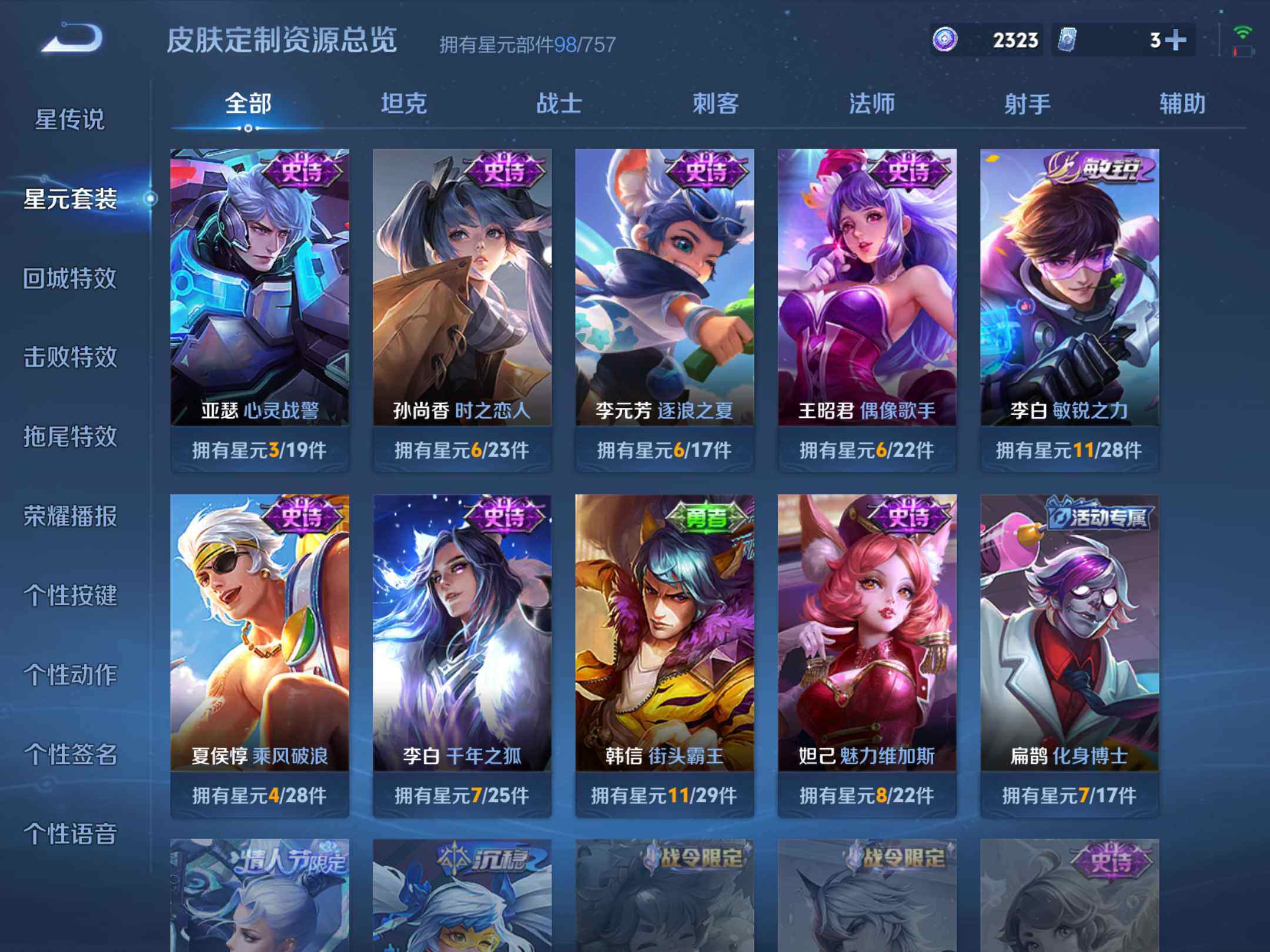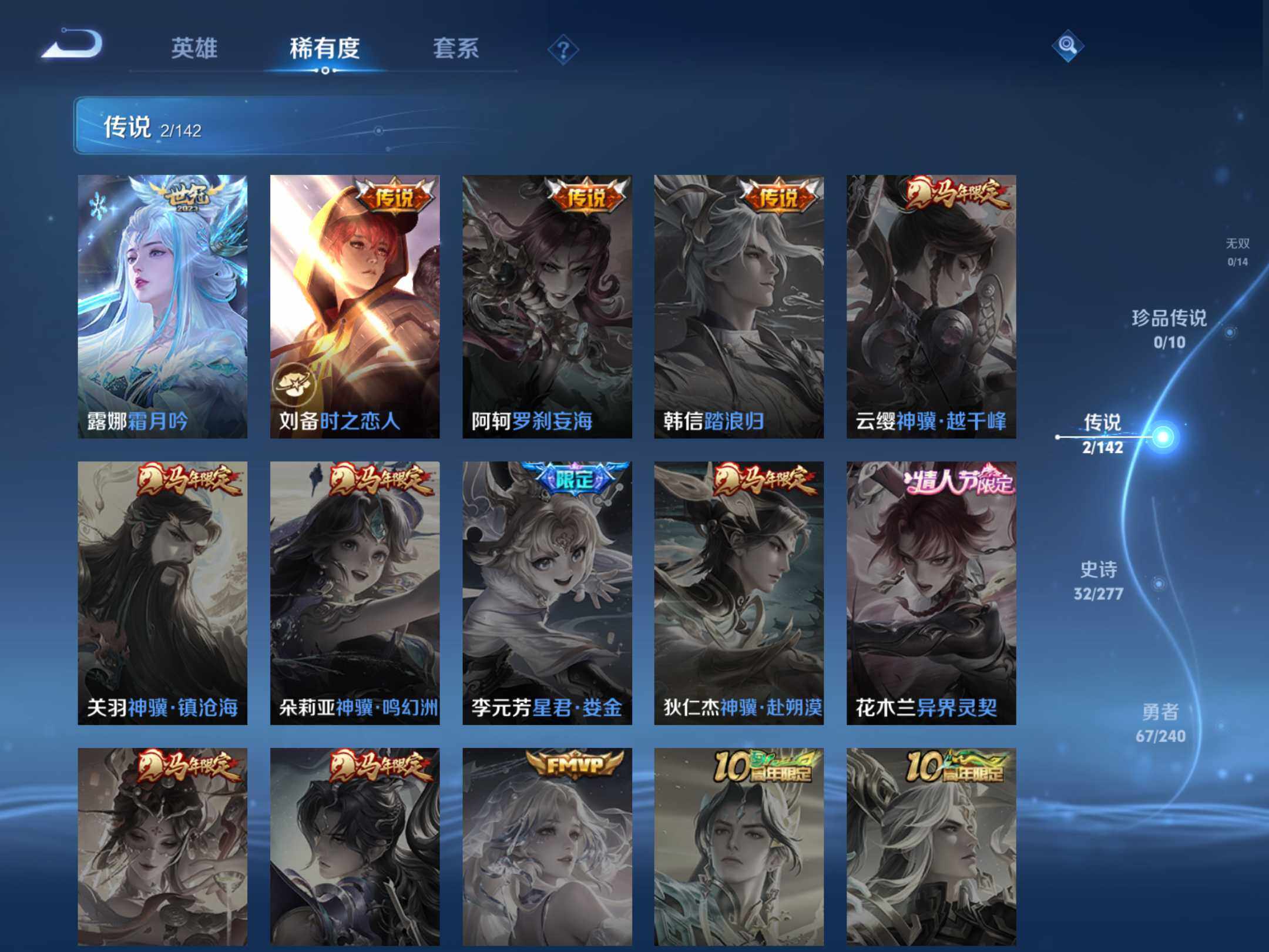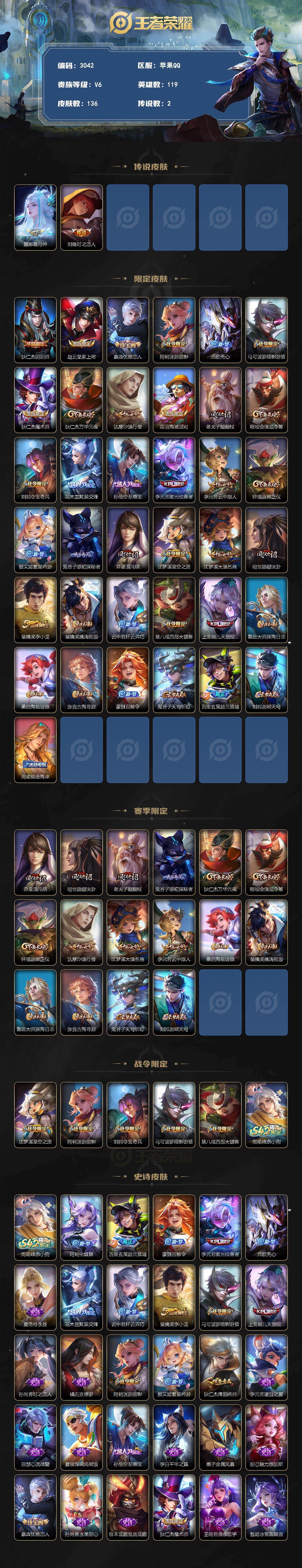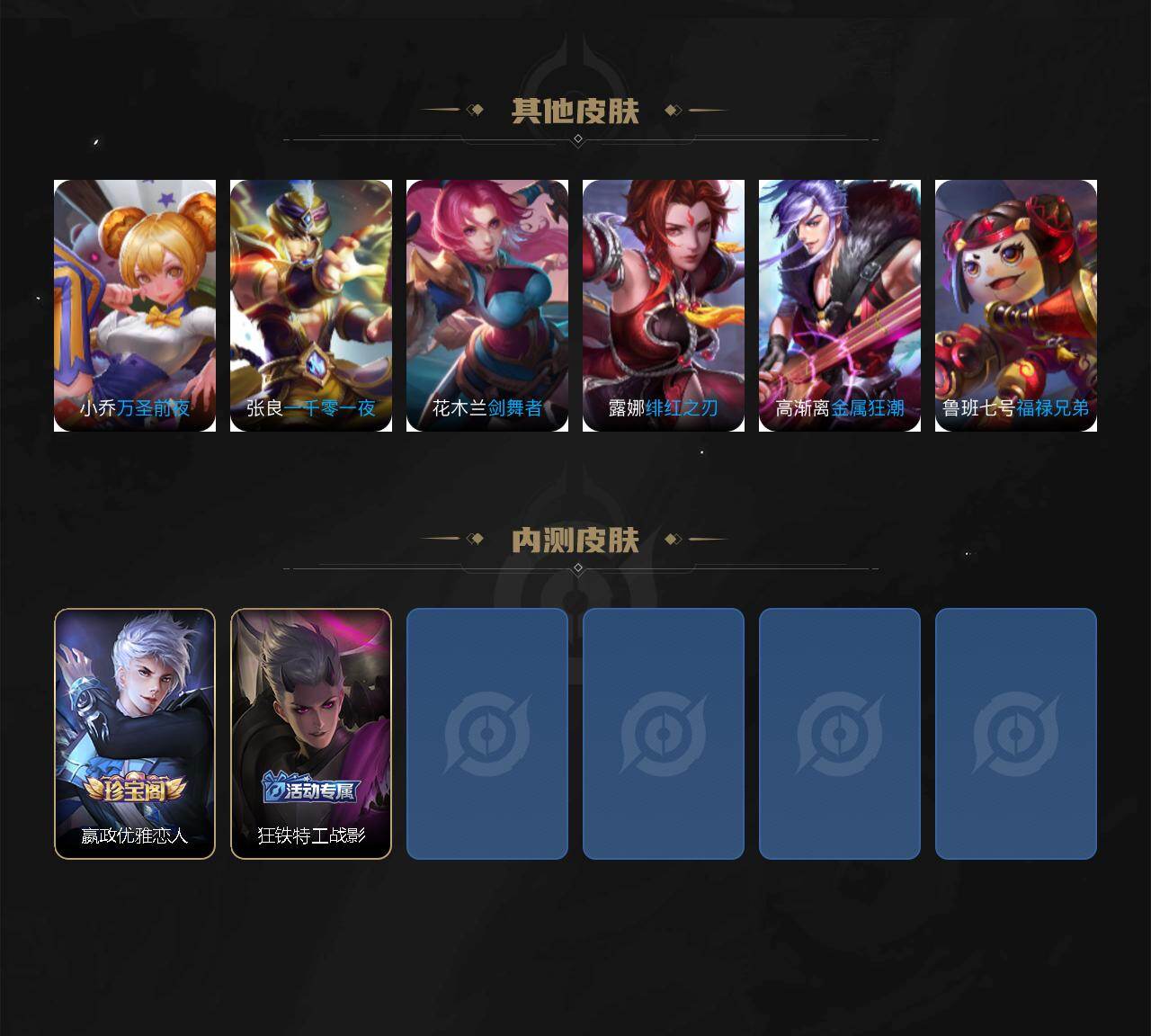 【限定皮肤】:狄仁杰阴阳师,赵云皇家上将,嬴政优雅恋人,阿轲迷踪丽影,元歌无心,马可波罗暗影游猎,狄仁杰魔术师,狄仁杰万华元夜,达摩沙漠行僧,项羽海滩派对,老夫子醍醐杖,程咬金演武夺筹,刘邦夺宝奇兵,花木兰默契交锋,孙悟空至尊宝,李元芳匿光侦查者,李元芳云中旅人,钟馗驱傩正仪,蔡文姬繁星吟游,鬼谷子原初探秘者,弈星混沌棋,沈梦溪星空之诺,沈梦溪大漠名商,明世隐疑决卦,裴擒虎李小龙,裴擒虎擒涛扼浪,云中君纤云弄巧,猪八戒西部大镖客,上官婉儿天狼绘梦者,鲁班大师探海日志,桑启海盐诗旅,张良古海寻踪,蒙犽百解令,鬼谷子天穹祈灯,百里玄策超元猎域,刘邦剑破天穹,周瑜熔金海岸