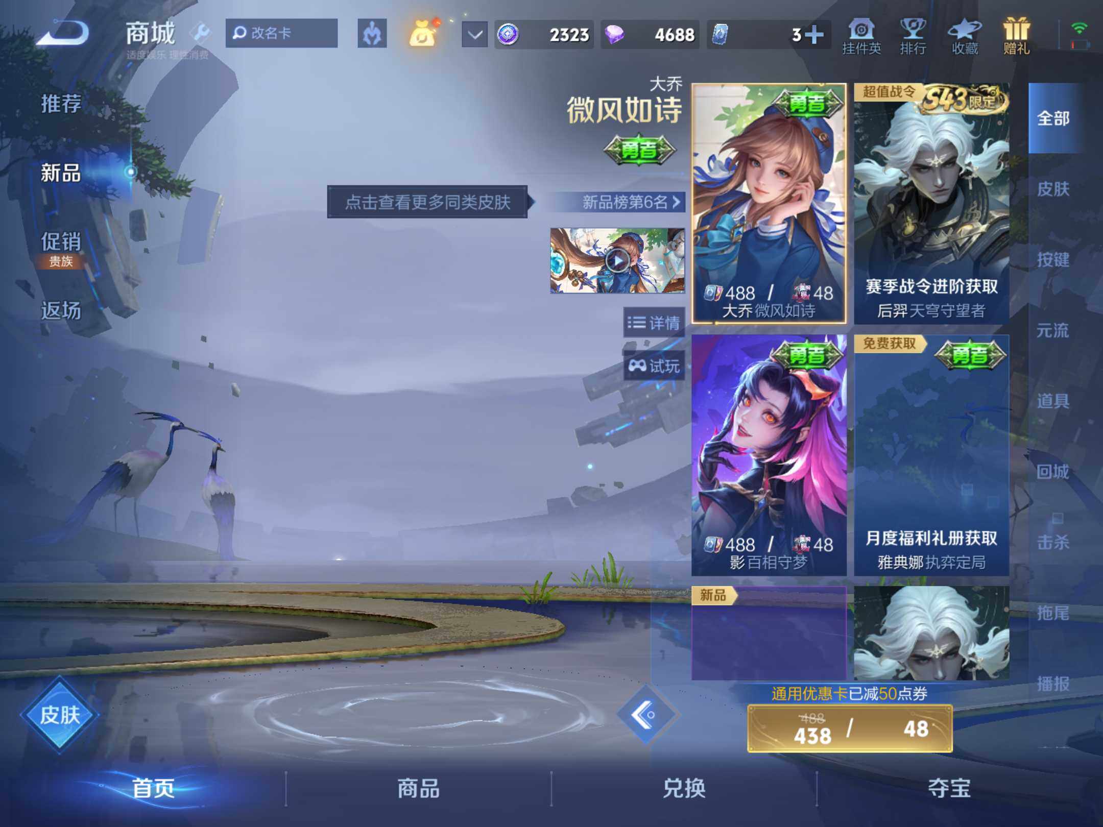 【其他皮肤】:吕布逐霄战戟,干将莫邪雾都夜雨,周瑜熔金海岸,大司命暗都幽影,刘邦剑破天穹,亚瑟鸿运当头,朵莉亚金色潮汐,海诺时空谍影,鬼谷子天穹祈灯,后羿完美运算,兰陵王幻夜行动,亚连破局者,海月王牌新星,钟无艳聚星闪耀,张良古海寻踪,鲁班大师探海日志,裴擒虎擒涛扼浪,赵怀真太极少年,白起乐园追猎者,猪八戒潮玩探月行,桑启海盐诗旅,李元芳云中旅人,沈梦溪大漠名商,达摩沙漠行僧,鲁班大师乓乓大师,钟馗驱傩正仪,张良缤纷
