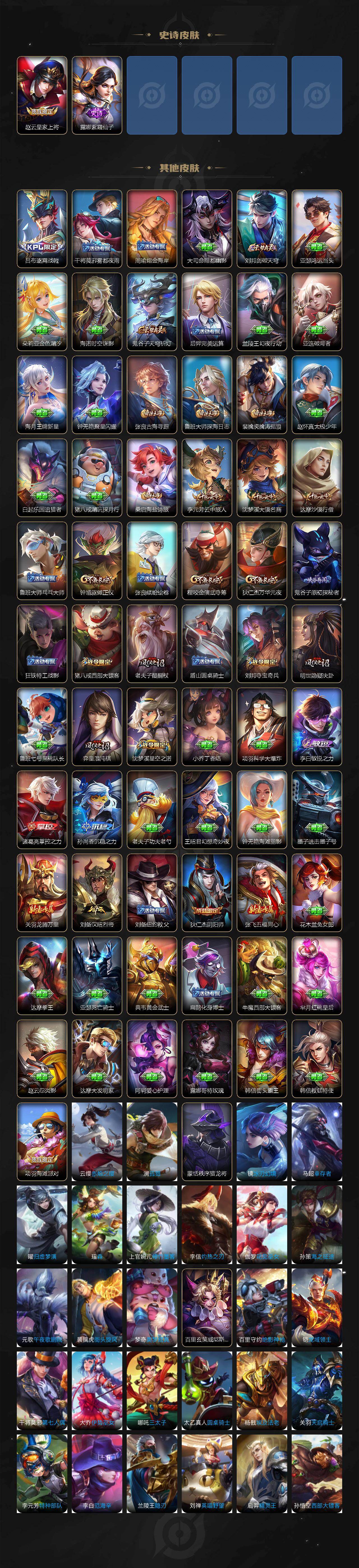 【史诗皮肤】:周瑜线条小狗,阿轲化蝶舞,百里玄策超元猎域,蒙犽百解令,李元芳匿光侦查者,元歌无心,夏洛特永昼,花木兰默契交锋,云中君纤云弄巧,裴擒虎李小龙,马可波罗暗影游猎,上官婉儿天狼绘梦者,孙尚香时之恋人,橘右京修罗,阿轲迷踪丽影,蔡文姬繁星吟游,狄仁杰鹰眼统帅,李元芳逐浪之夏,亚瑟心灵战警,夏侯惇乘风破浪,孙悟空至尊宝,李白千年之狐,墨子金属风暴,妲己魅力维加斯,嬴政优雅恋人,孙尚香水果甜心,宫本武藏鬼剑武藏,狄仁杰魔术师,王昭君偶像歌手,甄姬冰雪圆舞曲,赵云皇家上将,露娜紫霞仙子