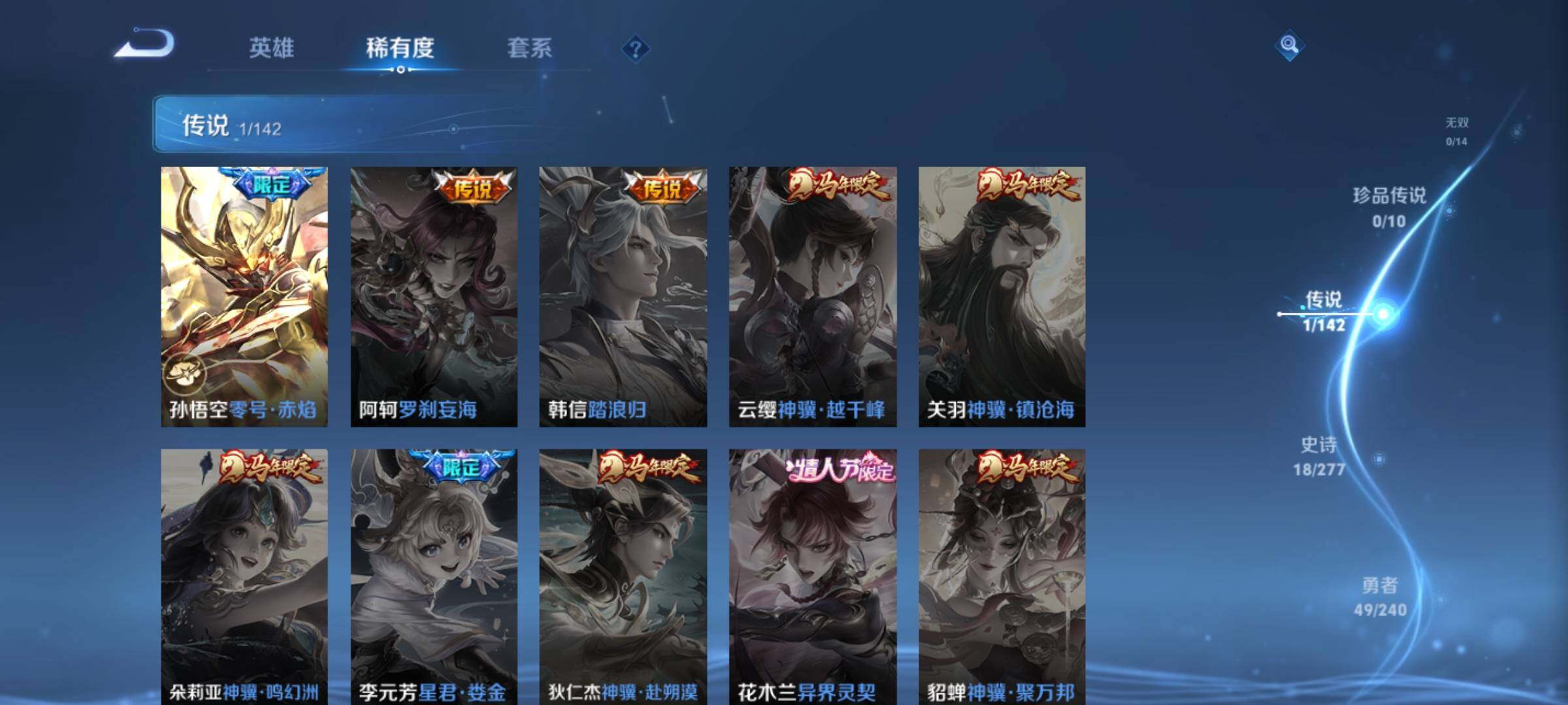 【限定皮肤】:狄仁杰阴阳师,赵云皇家上将,元歌云间偶戏,狄仁杰万华元夜,达摩沙漠行僧,项羽海滩派对,老夫子醍醐杖,程咬金演武夺筹,亚瑟潮玩骑士王,孙悟空零号赤焰,李元芳云中旅人,钟馗驱傩正仪,雅典娜单词大作战,蔡文姬繁星吟游,鬼谷子原初探秘者,苏烈千军破阵,沈梦溪大漠名商,裴擒虎李小龙,裴擒虎擒涛扼浪,狂铁御狮,云中君纤云弄巧,盾山御銮,嫦娥拒霜思,蒙犽狂想玩偶喵,鲁班大师探海日志,桑启海盐诗旅,张良古海寻踪,蒙犽百解令,鬼谷子天穹祈灯