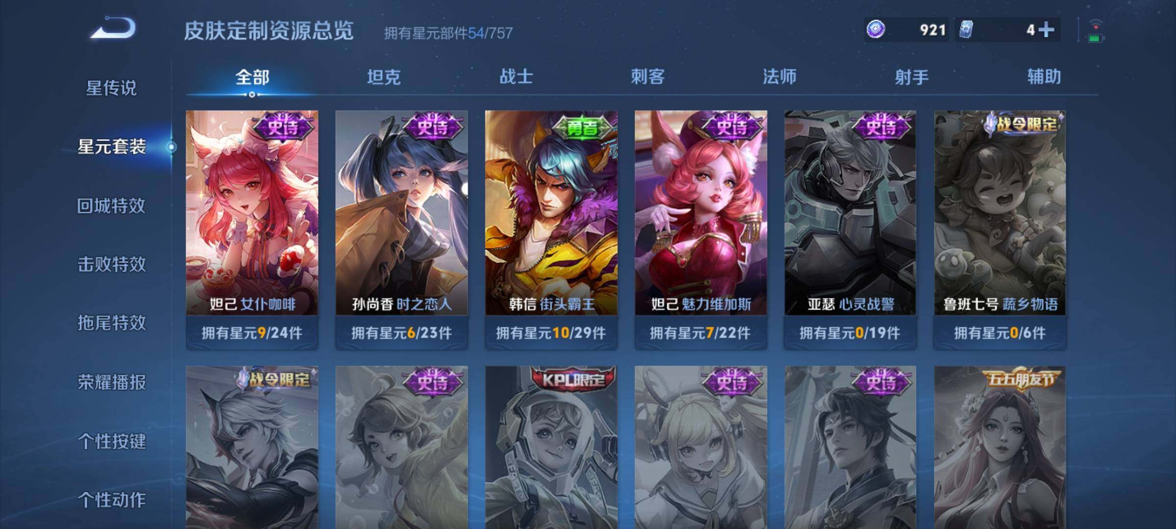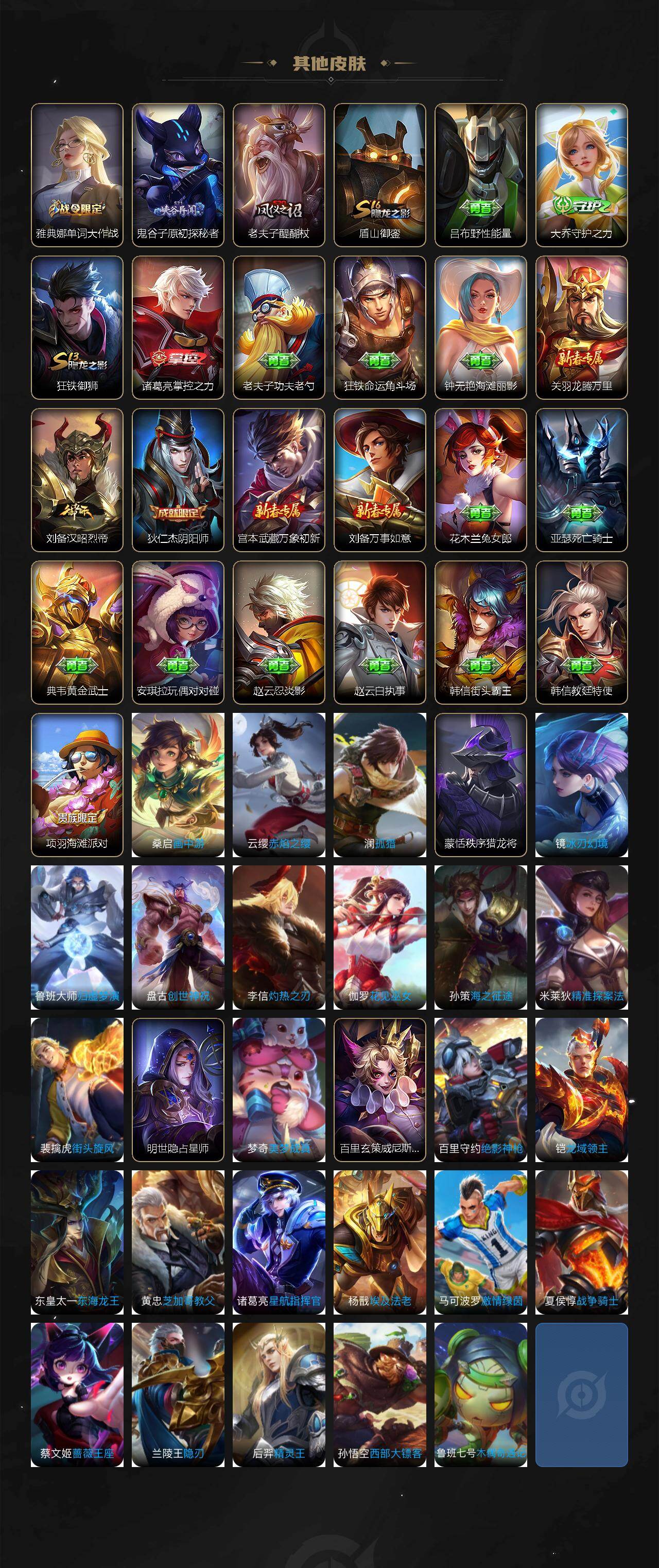 【其他皮肤】:露娜命运加冕,阿古朵布丁狗之约,张良灵野札记,苏烈春野闲踪,钟馗虚灵犬护,戈娅玫蓝誓约,大司命暗都幽影,鬼谷子天穹祈灯,亚连破局者,张良古海寻踪,鲁班大师探海日志,裴擒虎擒涛扼浪,猪八戒潮玩探月行,桑启海盐诗旅,李元芳云中旅人,沈梦溪大漠名商,达摩沙漠行僧,马可波罗潮玩牛仔,苏烈千军破阵,钟馗驱傩正仪,张良缤纷绘卷,程咬金演武夺筹,亚瑟潮玩骑士王,狄仁杰万华元夜,雅典娜单词大作战,鬼谷子原初探秘者,老夫子醍醐杖,盾山御銮,吕布野性能量,大乔守护之力,狂铁御狮,诸葛亮掌控之力,老夫子功夫老勺,狂铁命运角斗场,钟无艳海滩丽影,关羽龙腾万里,刘备汉昭烈帝,狄仁杰阴阳师,宫本武藏万象初新,刘备万事如意,花木兰兔女郎,亚瑟死亡骑士,典韦黄金武士,安琪拉玩偶对对碰,赵云忍炎影,赵云白执事,韩信街头霸王,韩信教廷特使,项羽海滩派对,桑启画中游,云缨赤焰之缨,澜孤猎,蒙恬秩序猎龙将,镜冰刃幻境,鲁班大师归虚梦演