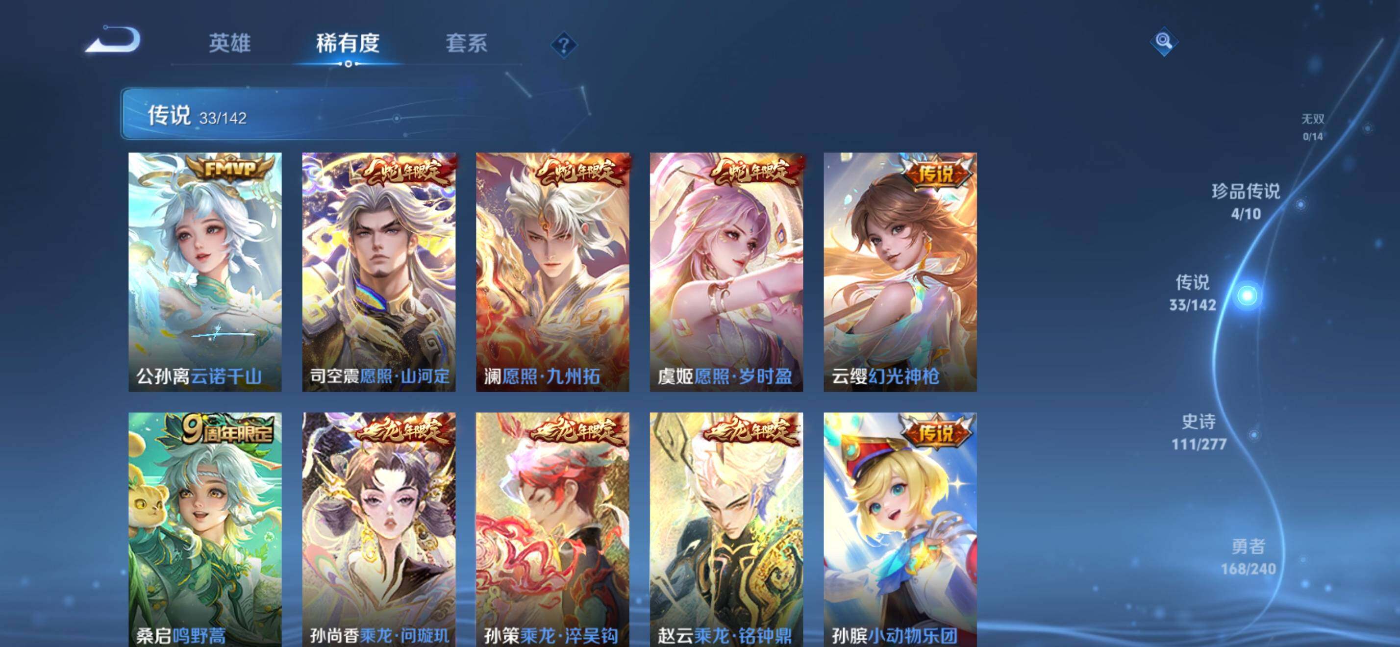 【传说皮肤】:公孙离云诺千山,司空震愿照山河定,澜愿照九州拓,虞姬愿照岁时盈,云缨幻光神枪,桑启鸣野蒿,孙尚香乘龙问璇玑,孙策乘龙淬吴钩,赵云乘龙铭钟鼎,孙膑小动物乐团,狄仁杰夜礼服假面,马可波罗妄想实况,公孙离记忆之芯,夏洛特浮生妄,伽罗炽翼辉光,吕布怒海麟威,狄仁杰神器狴犴令,马可波罗深海之息,鲁班七号寅虎瑞焰,孙尚香异界灵契,西施游龙清影,小乔音你心动,李元芳飞鸢探春,公孙离祈雪灵祝,铠绛天战甲,虞姬启明星使,曜云鹰飞将,百里玄策白虎志,梦奇胖达荣荣,貂蝉仲夏夜之梦,孙尚香末日机甲,宫本武藏地狱之眼,狄仁杰超时空战士