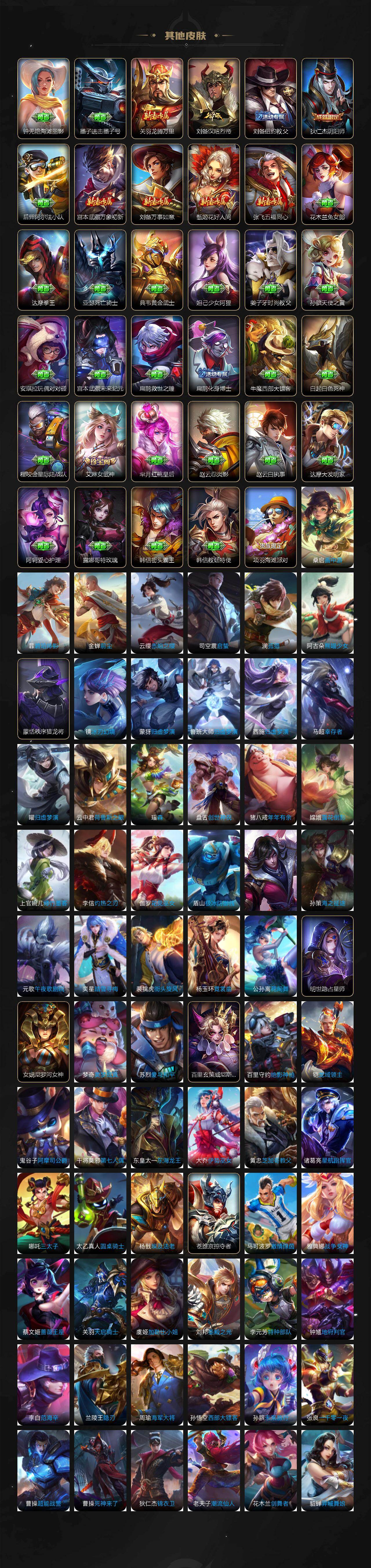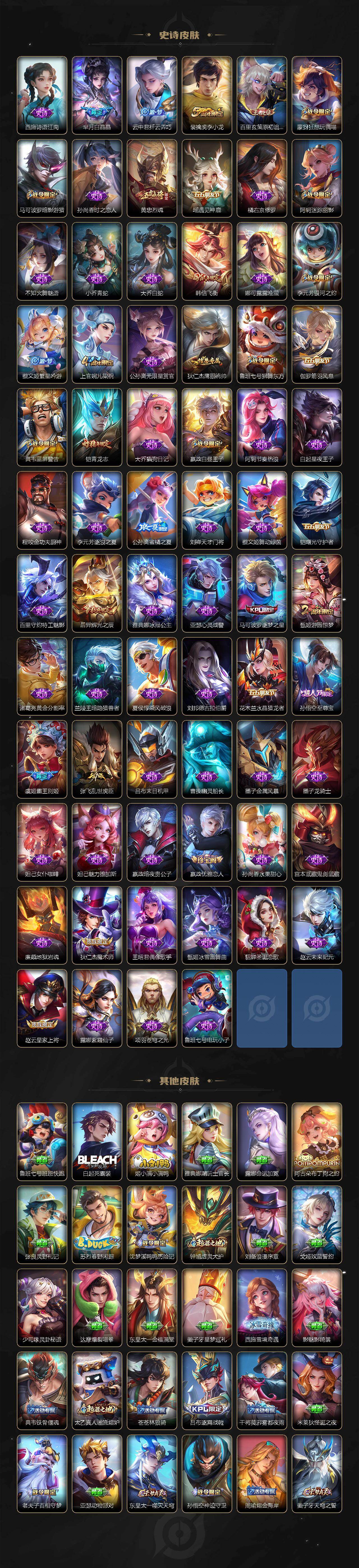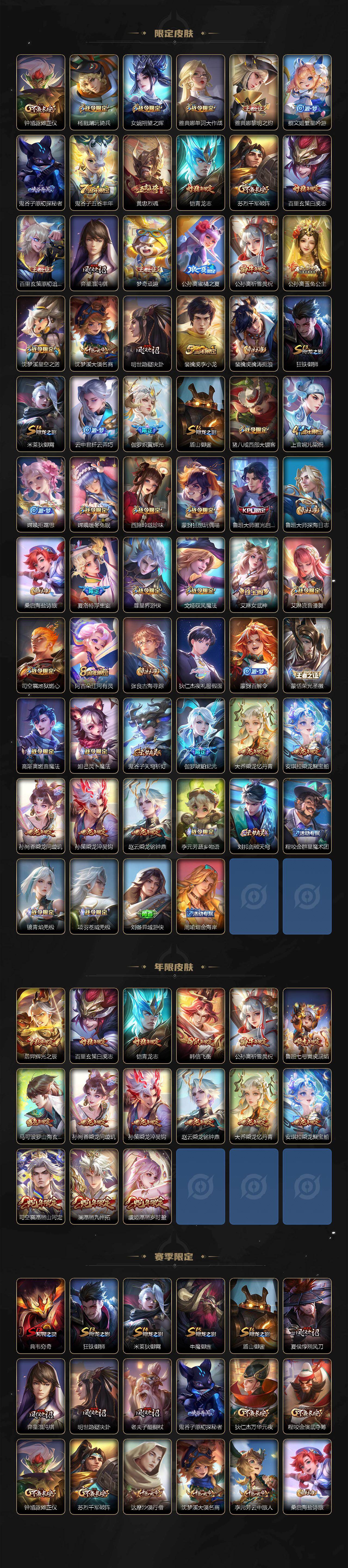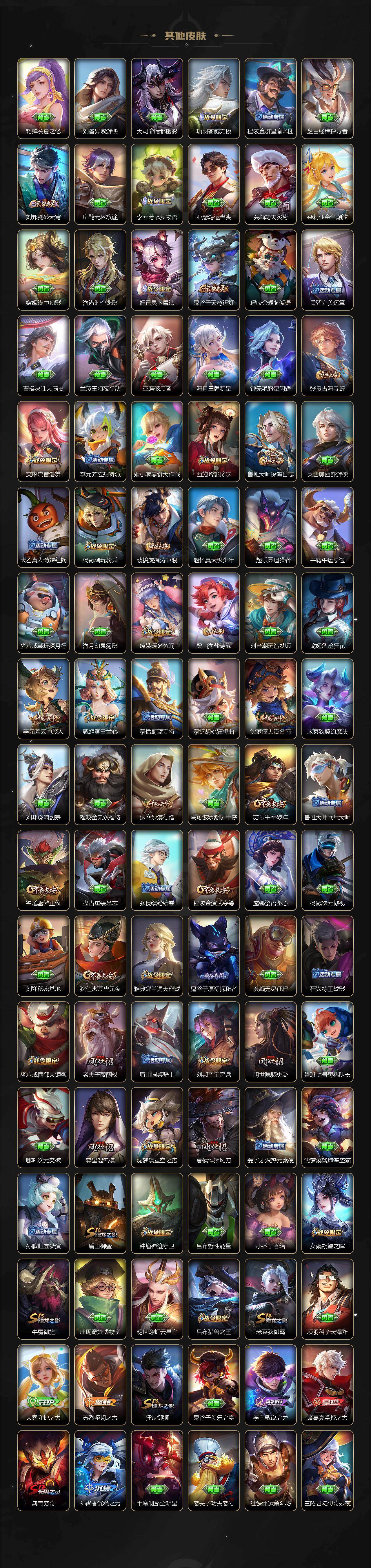【限定皮肤】:姜子牙天穹之誓,狄仁杰阴阳师,赵云皇家上将,嬴政优雅恋人,嬴政白昼王子,孙尚香异界灵契,鲁班七号狮舞东方,鲁班七号寅虎瑞焰,阿轲迷踪丽影,钟无艳超时空战士,扁鹊奇幻香踪,芈月白晶晶,吕布猎兽之王,元歌无心,夏侯惇朔风刀,甄姬游园惊梦,甄姬落雪兰心,典韦穷奇,典韦蓝屏警告,马可波罗逐梦之星,马可波罗暗影游猎,马可波罗深海之息,马可波罗山海玄木吟,马可波罗妄想实况,狄仁杰魔术师,狄仁杰万华元夜,狄仁杰神器狴犴令,达摩沙漠行僧,项羽海滩派对,老夫子醍醐杖,老夫子航海奇遇记,程咬金演武夺筹,刘邦夺宝奇兵,韩信飞衡,孙悟空至尊宝,牛魔御旌,后羿辉光之辰,李元芳银河之约,李元芳云中旅人,虞姬霸王别姬,虞姬启明星使,钟馗神迹守卫,钟馗驱傩正仪,杨戬潮玩骑兵,女娲朔望之晖,雅典娜单词大作战,雅典娜黎明之约,蔡文姬繁星吟游,鬼谷子原初探秘者,鬼谷子五谷丰年,黄忠烈魂,铠青龙志,苏烈千军破阵,百里玄策白虎志,百里玄策原初追逐者,弈星混沌棋,梦奇顽趣,公孙离蜜橘之夏,公孙离祈雪灵祝,公孙离玉兔公主,沈梦溪星空之诺,沈梦溪大漠名商,明世隐疑决卦,裴擒虎李小龙,裴擒虎擒涛扼浪,狂铁御狮,米莱狄御霄,云中君纤云弄巧,伽罗