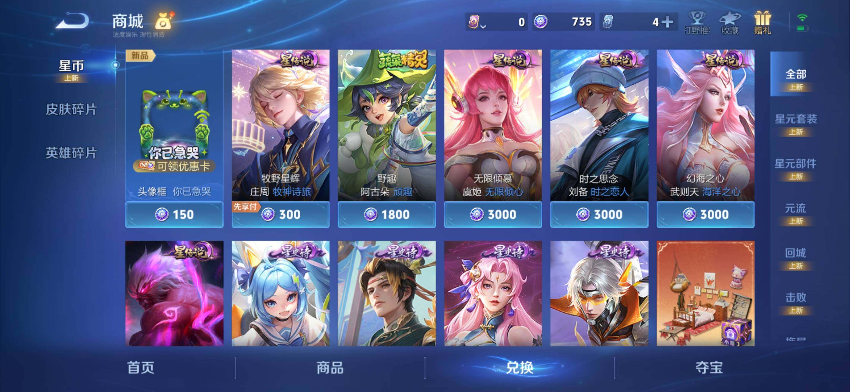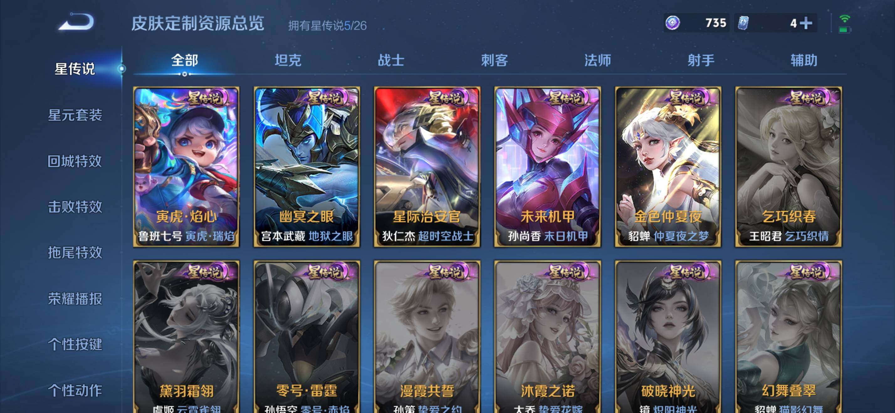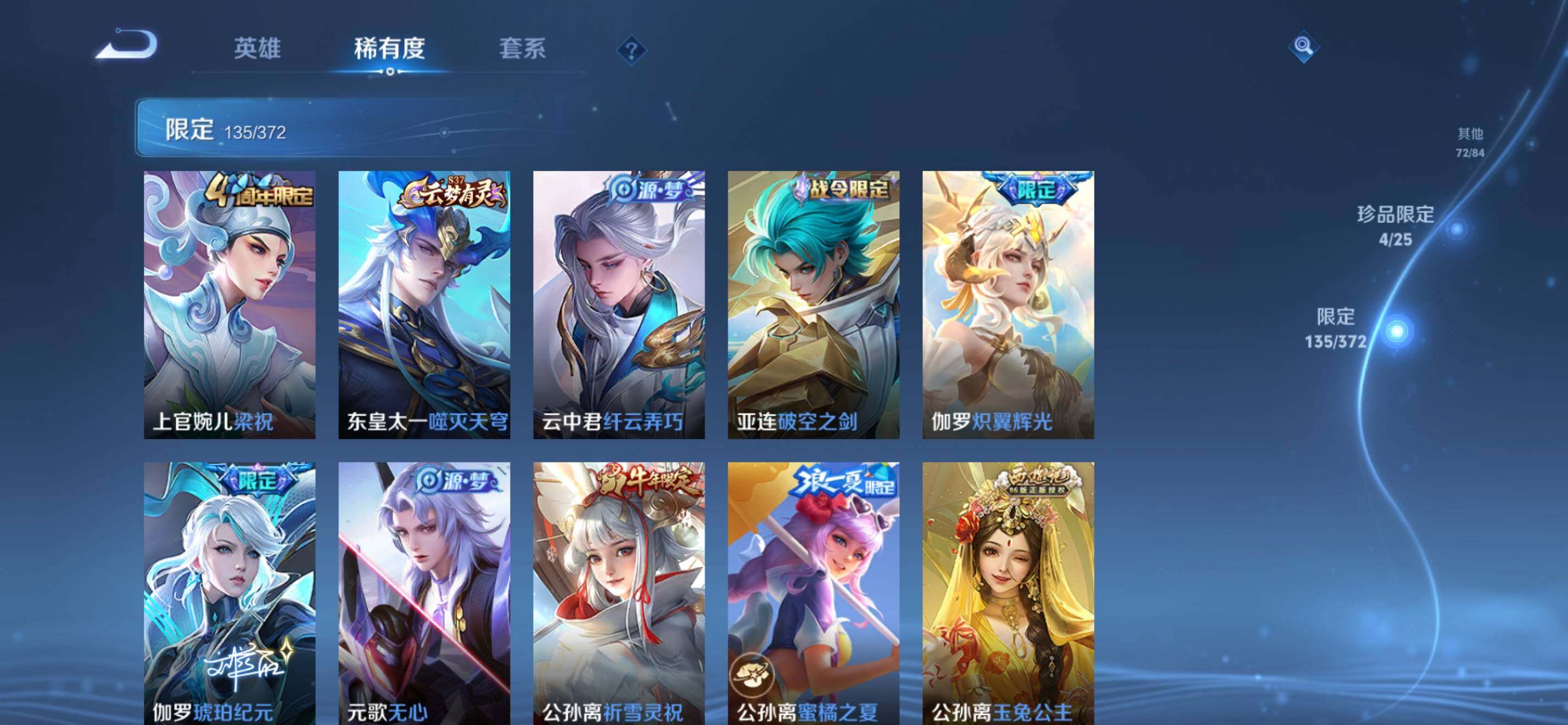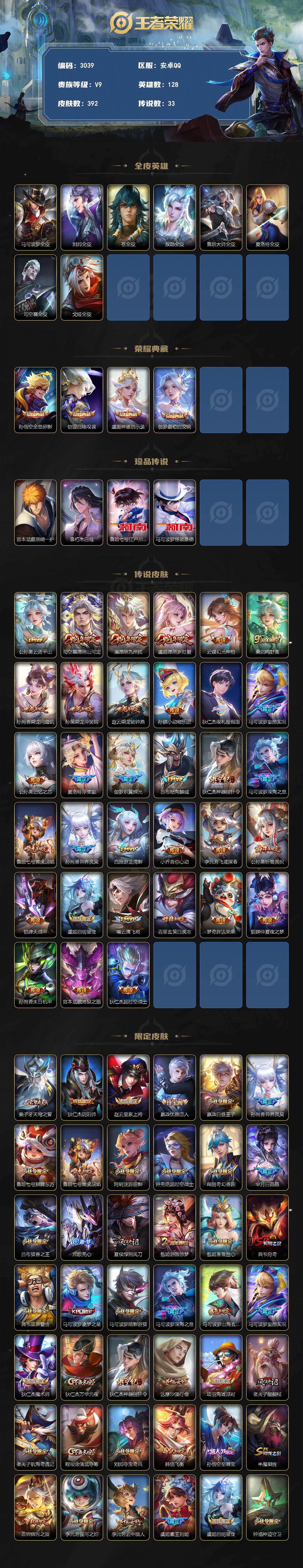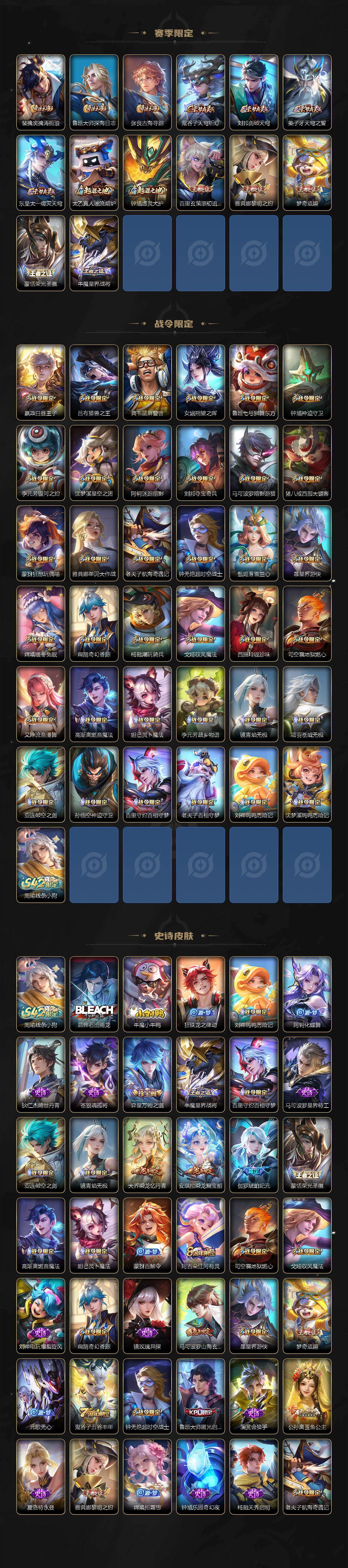 【限定皮肤】:姜子牙天穹之誓,狄仁杰阴阳师,赵云皇家上将,嬴政优雅恋人,嬴政白昼王子,孙尚香异界灵契,鲁班七号狮舞东方,鲁班七号寅虎瑞焰,阿轲迷踪丽影,钟无艳超时空战士,扁鹊奇幻香踪,芈月白晶晶,吕布猎兽之王,元歌无心,夏侯惇朔风刀,甄姬游园惊梦,甄姬落雪兰心,典韦穷奇,典韦蓝屏警告,马可波罗逐梦之星,马可波罗暗影游猎,马可波罗深海之息,马可波罗山海玄木吟,马可波罗妄想实况,狄仁杰魔术师,狄仁杰万华元夜,狄仁杰神器狴犴令,达摩沙漠行僧,项羽海滩派对,老夫子醍醐杖,老夫子航海奇遇记,程咬金演武夺筹,刘邦夺宝奇兵,韩信飞衡,孙悟空至尊宝,牛魔御旌,后羿辉光之辰,李元芳银河之约,李元芳云中旅人,虞姬霸王别姬,虞姬启明星使,钟馗神迹守卫,钟馗驱傩正仪,杨戬潮玩骑兵,女娲朔望之晖,雅典娜单词大作战,雅典娜黎明之约,蔡文姬繁星吟游,鬼谷子原初探秘者,鬼谷子五谷丰年,黄忠烈魂,铠青龙志,苏烈千军破阵,百里玄策白虎志,百里玄策原初追逐者,弈星混沌棋,梦奇顽趣,公孙离蜜橘之夏,公孙离祈雪灵祝,公孙离玉兔公主,沈梦溪星空之诺,沈梦溪大漠名商,明世隐疑决卦,裴擒虎李小龙,裴擒虎擒涛扼浪,狂铁御狮,米莱狄御霄,云中君纤云弄巧,伽罗