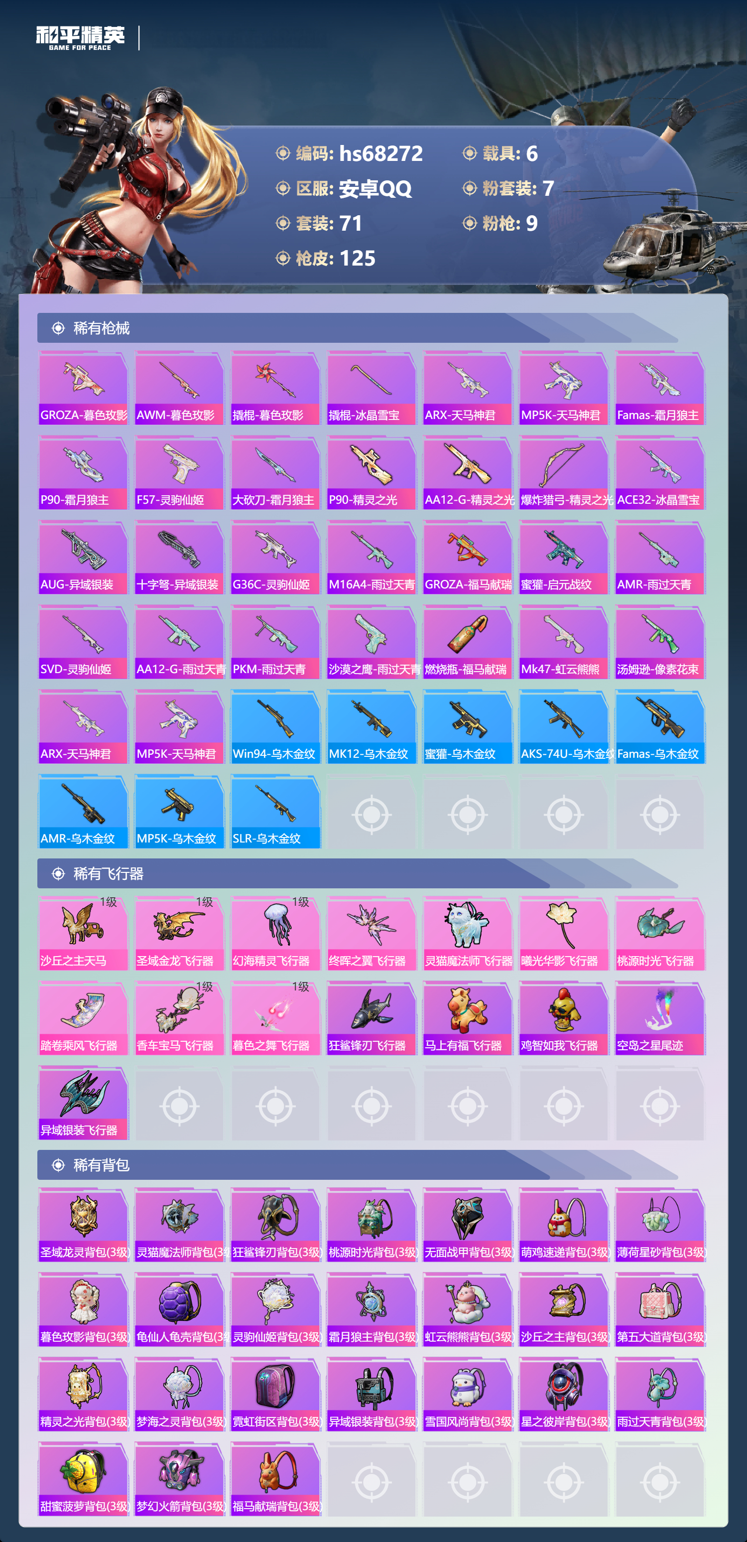 【115稀有枪械】AKM-暮色玫影/3级,SCAR-L-灵驹仙姬/1级,P90-沙丘之主/2级,M200-梦海之灵/1级,Mk14-福马献瑞/1级,DP-28-豹影疾电/5级,M417-第五大道/3级,燃烧瓶-天降桃花/7级,MG3-梦海之灵,MK20-H-圣域龙灵,GROZA-无面战甲,Win94-乌木金纹,MK12-乌木金纹,蜜獾-乌木金纹,SPAS-12-狂鲨锋刃,MK20-H-狂鲨锋刃,ARX-像素花束,大砍刀-像素花束,M249-冰晶雪宝,UMP45-海盐豹豹,P92-桃源时光,AKS-74U-乌木金纹,AKM-涂鸦街区,电击枪-喜羊羊与灰太狼,UZI-桃源时光,AMR-喜羊羊与灰太狼,Famas-乌木金纹,Famas-霓彩脉冲,M249-无面战甲,破片手榴弹-拽到爆炸,Mk14-薄荷星砂,AKS-74U-鸡智如我,烟雾弹-冰氧夏日,Mk14-紫晶流影,MG-36-薄荷星砂,SVD-霓彩脉冲,SLR-霓彩脉冲,SCAR-L-彩虹符号,P1911-无面战甲,S12K-霓彩脉冲,野牛-最终圣卫者,AKM-霓彩脉冲,SKS-圣域龙灵,M416-红色方程式,AKM-星之彼岸,AKM-破晓战魂,AKM-霓虹街区,SCAR-L-玉兔迎春,SCAR-L-炫彩节奏,M16A4-蓝色火焰,AUG-耀粉歌者,AUG-甜蜜菠萝,M762-彩虹符号,M762-第五大道,M762-天降萌叽,蜜獾-天降萌叽,Kar98K-梦幻火箭,Kar98K-红色方程式,Kar98K-彩虹符号,AWM-天降萌叽,AMR-乌木金纹,SKS-炫彩节奏,VSS-星之彼岸,Mini14-耀粉歌者,UZI-红色方程式,UZI-天降萌叽,UZI-啾咪啾咪,UMP45-生命誓言,Vector-彩虹符号,汤姆逊-耀粉歌者,野牛-沙丘之主,MP5K-乌木金纹,P90-玩趣呆呆,S686-生命誓言,S12K-破晓战魂,DBS-第五大道,M249-沙丘之主,M249-星之彼岸,MG3-第五大道,MG3-幻世战舞者,平底锅-空岛之星,撬棍-沙丘之主权杖,破片手榴弹-呆爆全场,GROZA-暮色玫影,AWM-暮色玫影,撬棍-暮色玫影,撬棍-冰晶雪宝,ARX-天马神君,MP5K-天马神君,Famas-霜月狼主,UMP45-霜月狼主/1级,P90-霜月狼主,F57-灵驹仙姬,大砍刀-霜月狼主,P90-精灵之光,AA12-G-精灵之光,爆炸猎弓-精灵之光,ACE32-冰晶雪宝,AUG-异域银装,十字弩-异域银装,G36C-灵驹仙姬,M16A4-雨过天青,GROZA-福马献瑞,蜜獾-启元战纹,AMR-雨过天青,SLR-乌木金纹,SVD-灵驹仙姬,AA12-G-雨过天青,PKM-雨过天青,沙漠之鹰-雨过天青,燃烧瓶-福马献瑞,Mk47-虹云熊熊,汤姆逊-像素花束,ARX-天马神君,MP5K-天马神君