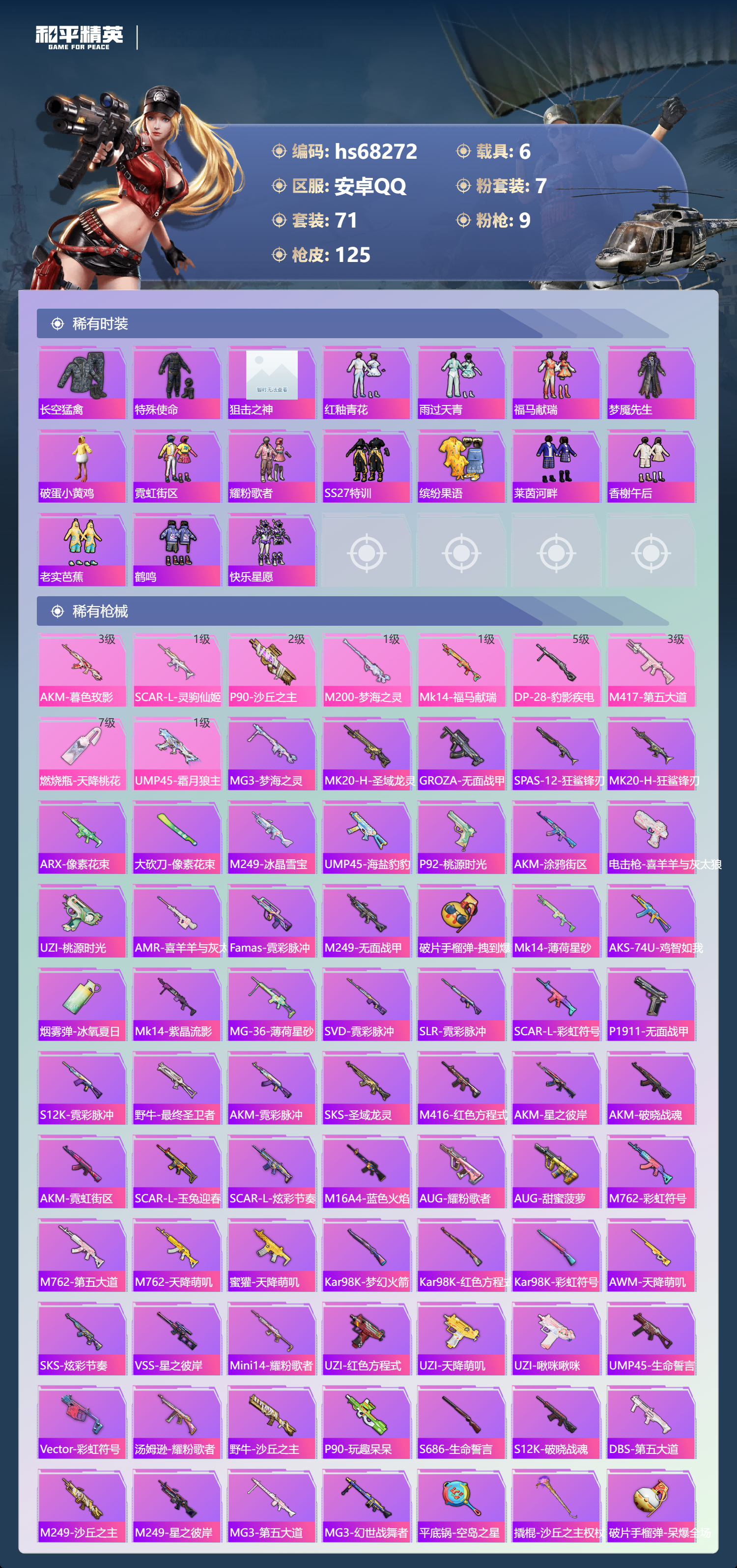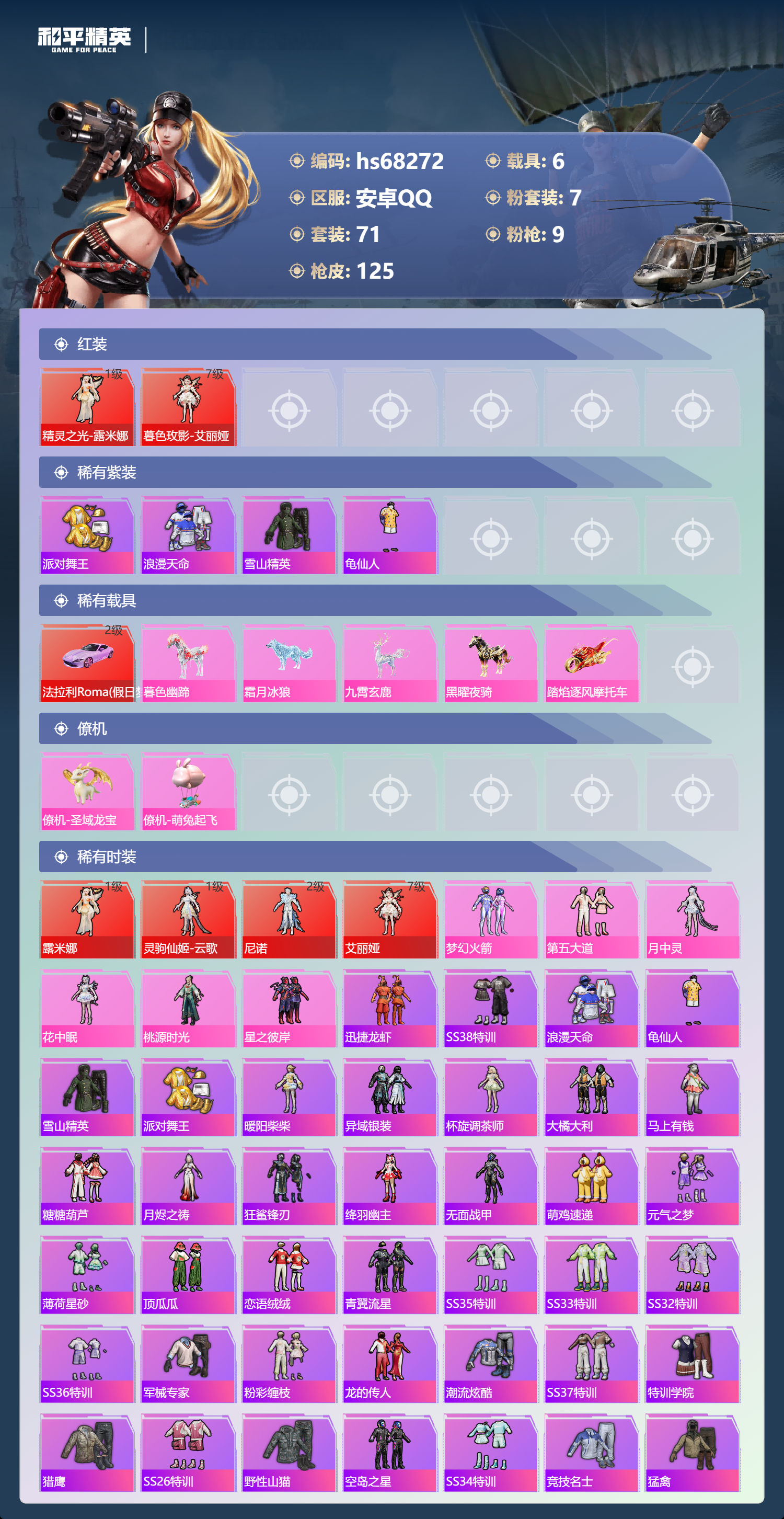 PX_2551851-,安卓手Q-6王牌印记-4红装-7粉装-9特效枪-6载具-72806热力值-71套装-125枪皮-3卓越印记-2传奇印记
