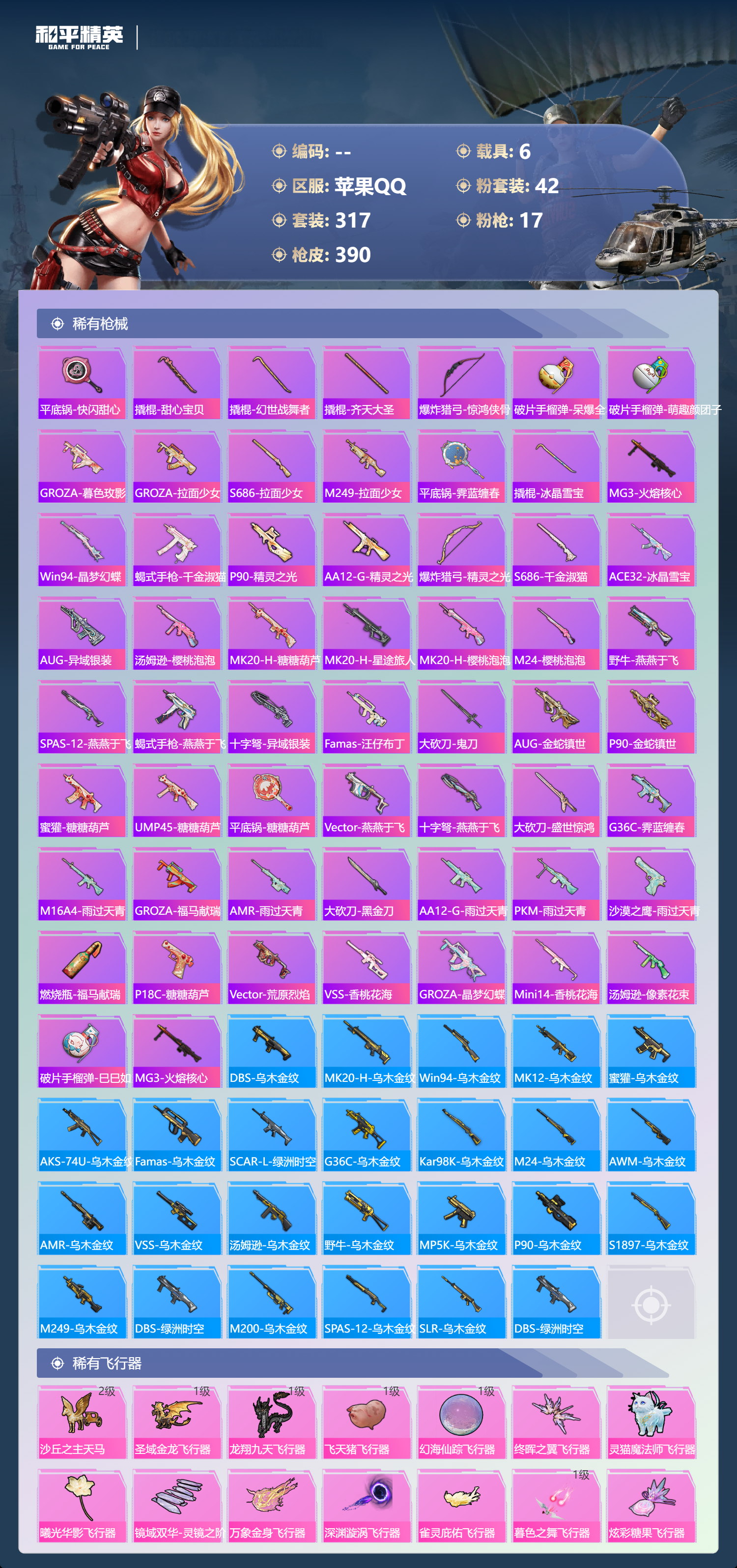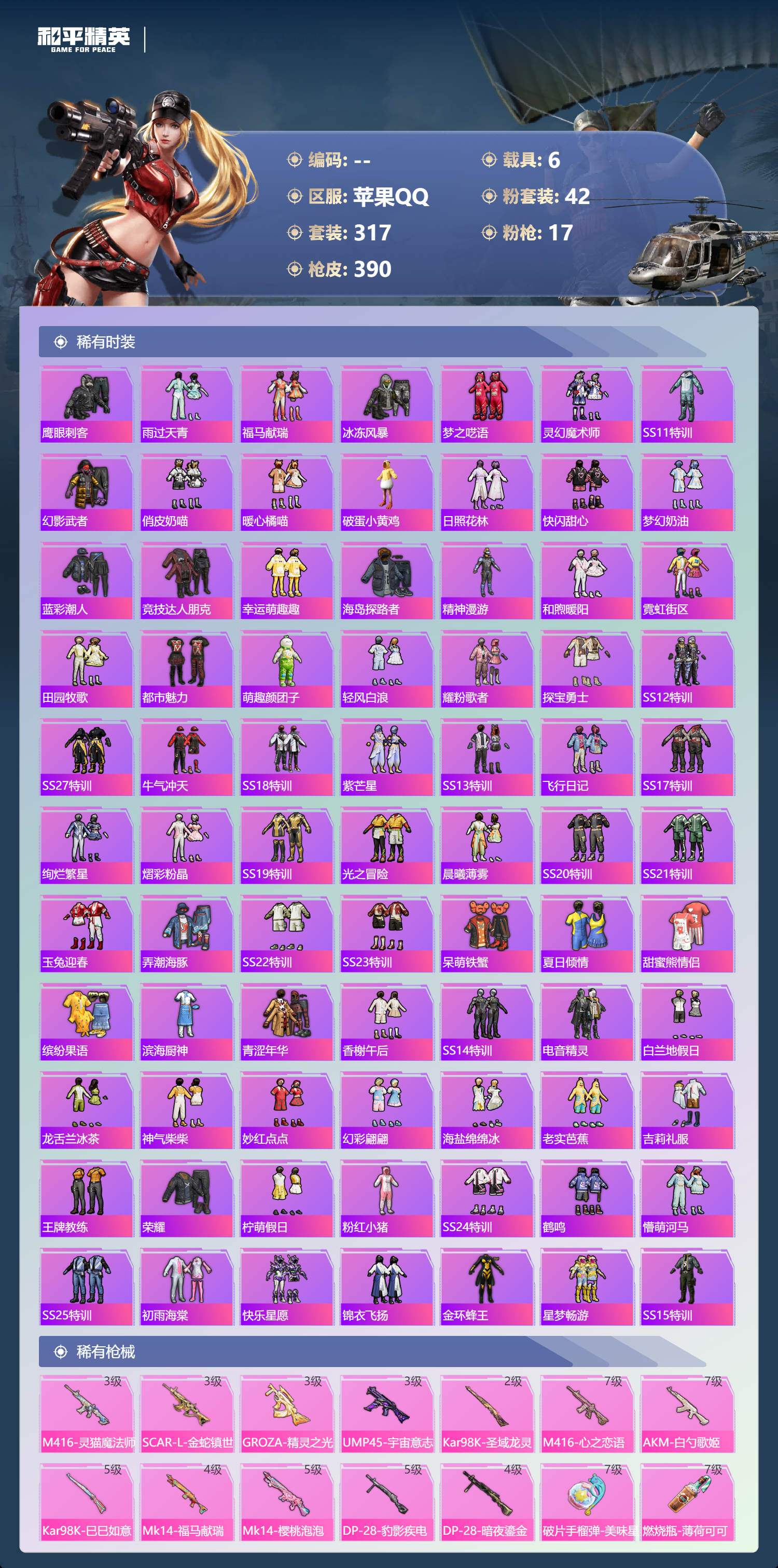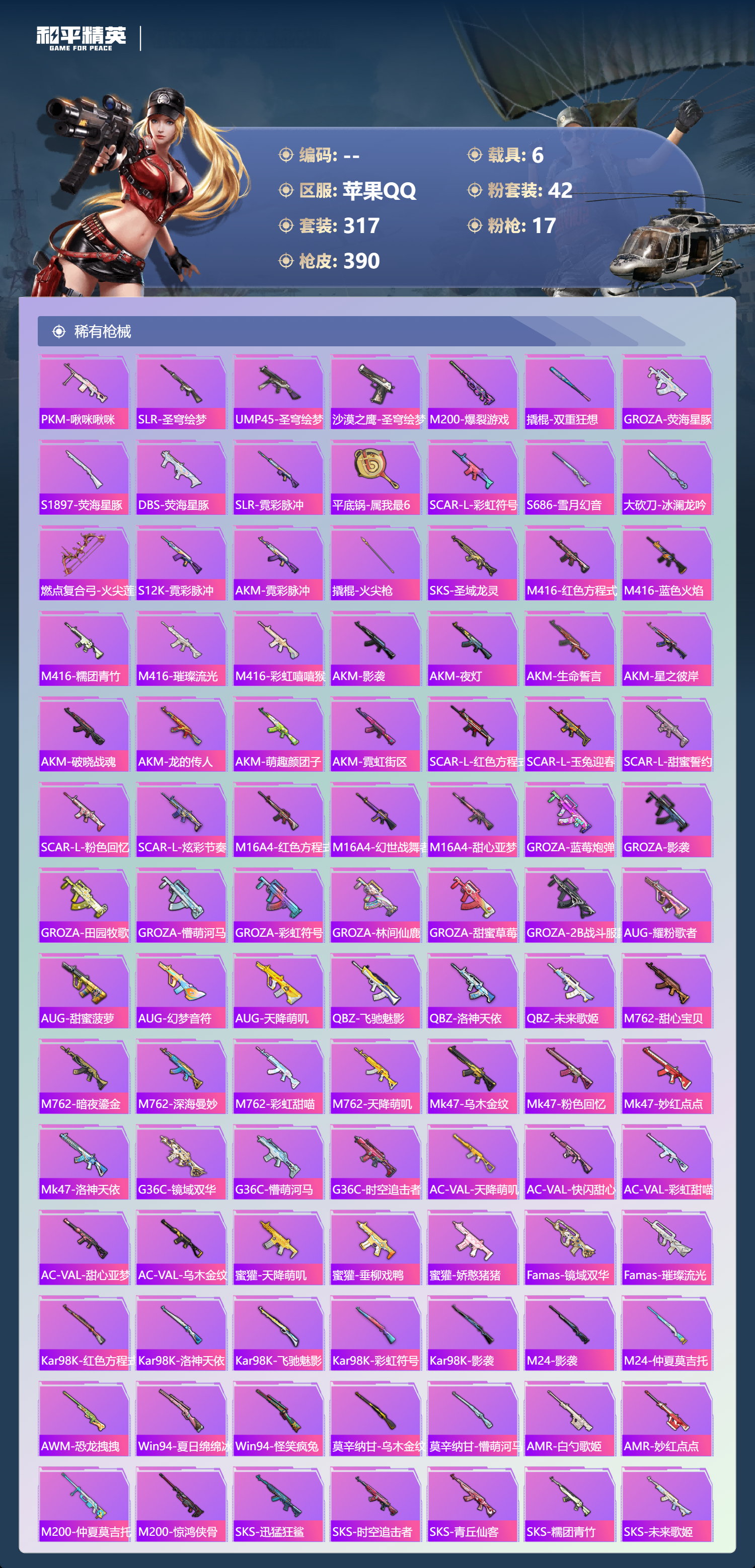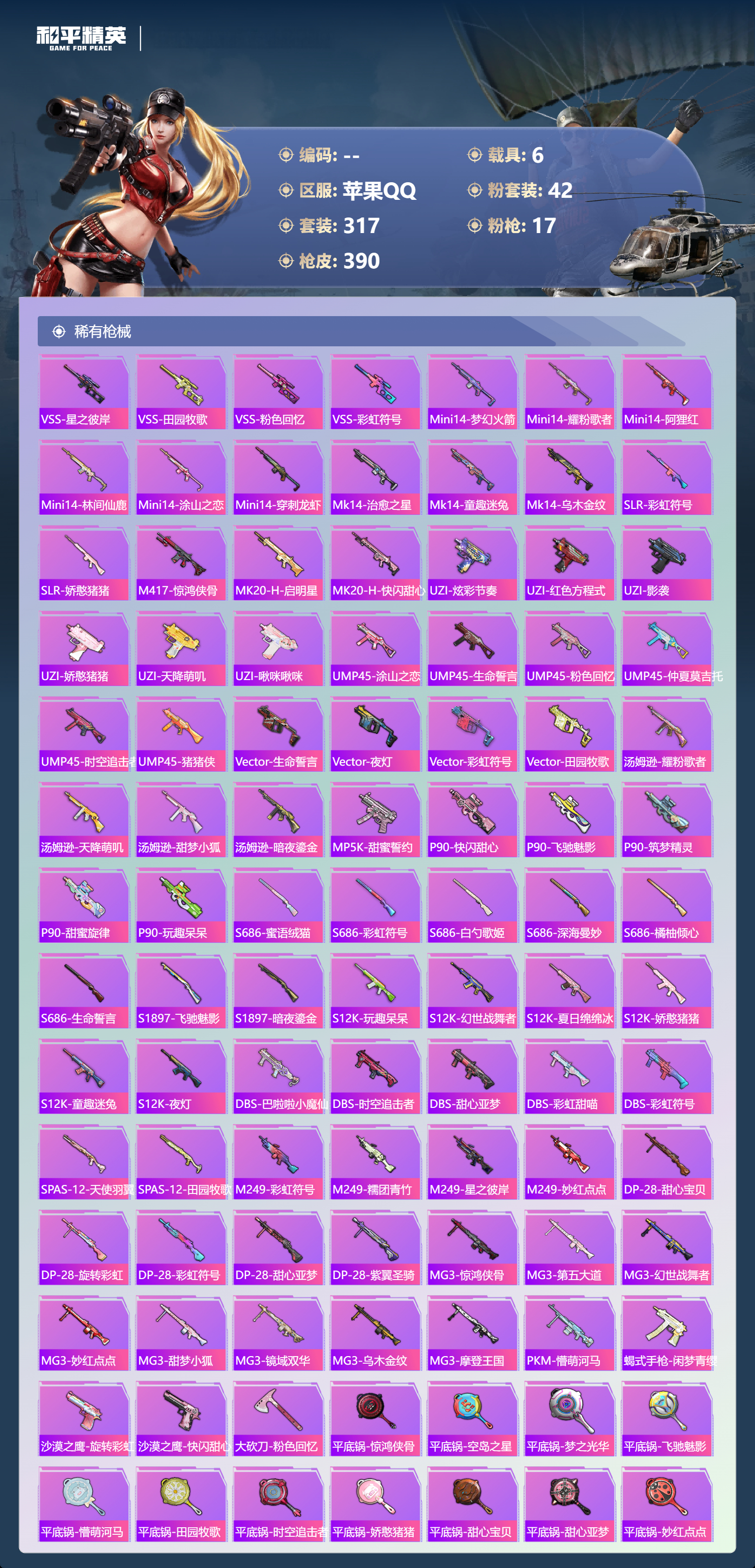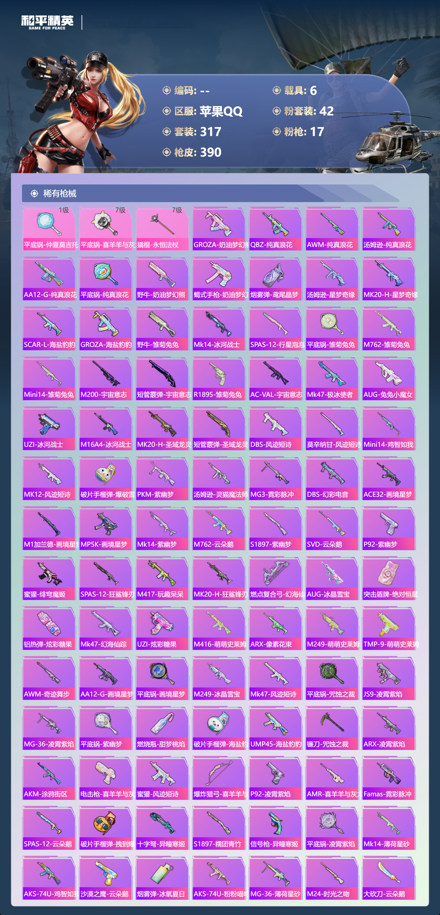【391稀有枪械】M416-灵猫魔法师/3级,SCAR-L-金蛇镇世/3级,GROZA-精灵之光/3级,UMP45-宇宙意志/3级,Kar98K-圣域龙灵/2级,M416-心之恋语/7级,AKM-白勺歌姬/7级,Kar98K-巳巳如意/5级,Mk14-福马献瑞/4级,Mk14-樱桃泡泡/5级,DP-28-豹影疾电/5级,DP-28-暗夜鎏金/4级,破片手榴弹-美味星星糖/7级,燃烧瓶-薄荷可可/7级,平底锅-仲夏莫吉托/1级,平底锅-喜羊羊与灰太狼/7级,撬棍-永恒法杖/7级,GROZA-奶油梦幻熊,QBZ-纯真浪花,AWM-纯真浪花,汤姆逊-纯真浪花,DBS-乌木金纹,AA12-G-纯真浪花,平底锅-纯真浪花,野牛-奶油梦幻熊,蝎式手枪-奶油梦幻熊,烟雾弹-鸢尾晶梦,汤姆逊-星梦奇缘,MK20-H-星梦奇缘,SCAR-L-海盐豹豹,GROZA-海盐豹豹,野牛-雏菊兔兔,Mk14-冰河战士,SPAS-12-行星泡泡,平底锅-雏菊兔兔,M762-雏菊兔兔,Mini14-雏菊兔兔,M200-宇宙意志,短管霰弹-宇宙意志,R1895-雏菊兔兔,AC-VAL-宇宙意志,Mk47-极冰使者,AUG-兔兔小魔女,UZI-冰河战士,M16A4-冰河战士,MK20-H-乌木金纹,MK20-H-圣域龙灵,短管霰弹-圣域龙灵,DBS-风迹短诗,莫辛纳甘-风迹短诗,Mini14-鸡智如我,Win94-乌木金纹,MK12-风迹短诗,MK12-乌木金纹,破片手榴弹-爆破雪人,PKM-紫幽梦,汤姆逊-灵猫魔法师,MG3-霓彩脉冲,DBS-幻彩电音,ACE32-画境星梦,M1加兰德-画境星梦,MP5K-画境星梦,Mk14-紫幽梦,蜜獾-乌木金纹,M762-云朵鹅,S1897-紫幽梦,SVD-云朵鹅,P92-紫幽梦,蜜獾-绯穹魔姬,SPAS-12-狂鲨锋刃,M417-玩趣呆呆,MK20-H-狂鲨锋刃,燃点复合弓-幻海仙踪,AUG-冰晶雪宝,突击盾牌-绝对恒星,铝热弹-炫彩糖果,Mk47-幻海仙踪,UZI-炫彩糖果,M416-萌萌史莱姆,ARX-像素花束,M249-萌萌史莱姆,TMP-9-萌萌史莱姆,AWM-奇迹舞步,AA12-G-画境星梦,平底锅-画境星梦,M249-冰晶雪宝,Mk47-风迹短诗,平底锅-咒蚀之裁,JS9-凌霄紫焰,MG-36-凌霄紫焰,平底锅-紫幽梦,燃烧瓶-甜梦桃焰,破片手榴弹-海盐豹豹,UMP45-海盐豹豹,镰刀-咒蚀之裁,ARX-凌霄紫焰,AKS-74U-乌木金纹,AKM-涂鸦街区,电击枪-喜羊羊与灰太狼,蜜獾-风迹短诗,爆炸猎弓-喜羊羊与灰太狼,P92-凌霄紫焰,AMR-喜羊羊与灰太狼,Famas-乌木金纹,Famas-霓彩脉冲,SPAS-12-云朵鹅,破片手榴弹-拽到爆炸,十字弩-异瞳寒姬,S1897-糯团青竹,信号枪-异瞳寒姬,平底锅-凌霄紫焰,Mk14-薄荷星砂,AKS-74U-鸡智如我,沙漠之鹰-云朵鹅,烟雾弹-冰氧夏日,AKS-74U-粉粉喵呜,MG-36-薄荷星砂,SCAR-L-绿洲时空,M24-时光之吻,大砍刀-云朵鹅,PKM-啾咪啾咪,SLR-圣穹绘梦,UMP45-圣穹绘梦,沙漠之鹰-圣穹绘梦,M200-爆裂游戏,撬棍-双重狂想,GROZA-荧海星豚,S1897-荧海星豚,DBS-荧海星豚,SLR-霓彩脉冲,平底锅-属我最6,SCAR-L-彩虹符号,S686-雪月幻音,大砍刀-冰澜龙吟,燃点复合弓-火尖莲影,S12K-霓彩脉冲,AKM-霓彩脉冲,撬棍-火尖枪,SKS-圣域龙灵,M416-红色方程式,M416-蓝色火焰,M416-糯团青竹,M416-璀璨流光,M416-彩虹嘻嘻猴,AKM-影袭,AKM-夜灯,AKM-生命誓言,AKM-星之彼岸,AKM-破晓战魂,AKM-龙的传人,AKM-萌趣颜团子,AKM-霓虹街区,SCAR-L-红色方程式,SCAR-L-玉兔迎春,SCAR-L-甜蜜誓约,SCAR-L-粉色回忆,SCAR-L-炫彩节奏,M16A4-红色方程式,M16A4-幻世战舞者,M16A4-甜心亚梦,GROZA-蓝莓炮弹,GROZA-影袭,GROZA-田园牧歌,GROZA-懵萌河马,GROZA-彩虹符号,GROZA-林间仙鹿,GROZA-甜蜜草莓,GROZA-2B战斗服款,AUG-耀粉歌者,AUG-甜蜜菠萝,AUG-幻梦音符,AUG-天降萌叽,QBZ-飞驰魅影,QBZ-洛神天依,QBZ-未来歌姬,M762-甜心宝贝,M762-暗夜鎏金,M762-深海曼妙,M762-彩虹甜喵,M762-天降萌叽,Mk47-乌木金纹,Mk47-粉色回忆,Mk47-妙红点点,Mk47-洛神天依,G36C-镜域双华,G36C-乌木金纹,G36C-懵萌河马,G36C-时空追击者,AC-VAL-天降萌叽,AC-VAL-快闪甜心,AC-VAL-彩虹甜喵,AC-VAL-甜心亚梦,AC-VAL-乌木金纹,蜜獾-天降萌叽,蜜獾-垂柳戏鸭,蜜獾-娇憨猪猪,Famas-镜域双华,Famas-璀璨流光,Kar98K-乌木金纹,Kar98K-红色方程式,Kar98K-洛神天依,Kar98K-飞驰魅影,Kar98K-彩虹符号,Kar98K-影袭,M24-乌木金纹,M24-影袭,M24-仲夏莫吉托,AWM-乌木金纹,AWM-恐龙拽拽,Win94-夏日绵绵冰,Win94-怪笑疯兔,莫辛纳甘-乌木金纹,莫辛纳甘-懵萌河马,AMR-乌木金纹,AMR-白勺歌姬,AMR-妙红点点,M200-仲夏莫吉托,M200-惊鸿侠骨,SKS-迅猛狂鲨,SKS-时空追击者,SKS-青丘仙客,SKS-糯团青竹,SKS-未来歌姬,VSS-星之彼岸,VSS-乌木金纹,VSS-田园牧歌,VSS-粉色回忆,VSS-彩虹符号,Mini14-梦幻火箭,Mini14-耀粉歌者,Mini14-阿狸红,Mini14-林间仙鹿,Mini14-涂山之恋,Mini14-穿刺龙虾,Mk14-治愈之星,Mk14-童趣迷兔,Mk14-乌木金纹,SLR-彩虹符号,SLR-娇憨猪猪,M417-惊鸿侠骨,MK20-H-启明星,MK20-H-快闪甜心,UZI-炫彩节奏,UZI-红色方程式,UZI-影袭,UZI-娇憨猪猪,UZI-天降萌叽,UZI-啾咪啾咪,UMP45-涂山之恋,UMP45-生命誓言,UMP45-粉色回忆,UMP45-仲夏莫吉托,UMP45-时空追击者,UMP45-猪猪侠,Vector-生命誓言,Vector-夜灯,Vector-彩虹符号,Vector-田园牧歌,汤姆逊-耀粉歌者,汤姆逊-天降萌叽,汤姆逊-乌木金纹,汤姆逊-甜梦小狐,汤姆逊-暗夜鎏金,野牛-乌木金纹,MP5K-甜蜜誓约,MP5K-乌木金纹,P90-乌木金纹,P90-快闪甜心,P90-飞驰魅影,P90-筑梦精灵,P90-甜蜜旋律,P90-玩趣呆呆,S686-蜜语绒猫,S686-彩虹符号,S686-白勺歌姬,S686-深海曼妙,S686-橘柚倾心,S686-生命誓言,S1897-乌木金纹,S1897-飞驰魅影,S1897-暗夜鎏金,S12K-玩趣呆呆,S12K-幻世战舞者,S12K-夏日绵绵冰,S12K-娇憨猪猪,S12K-童趣迷兔,S12K-夜灯,DBS-巴啦啦小魔仙,DBS-时空追击者,DBS-甜心亚梦,DBS-彩虹甜喵,DBS-彩虹符号,SPAS-12-天使羽翼,SPAS-12-田园牧歌,M249-彩虹符号,M249-糯团青竹,M249-乌木金纹,M249-星之彼岸,M249-妙红点点,DP-28-甜心宝贝,DP-28-旋转彩虹,DP-28-彩虹符号,DP-28-甜心亚梦,DP-28-