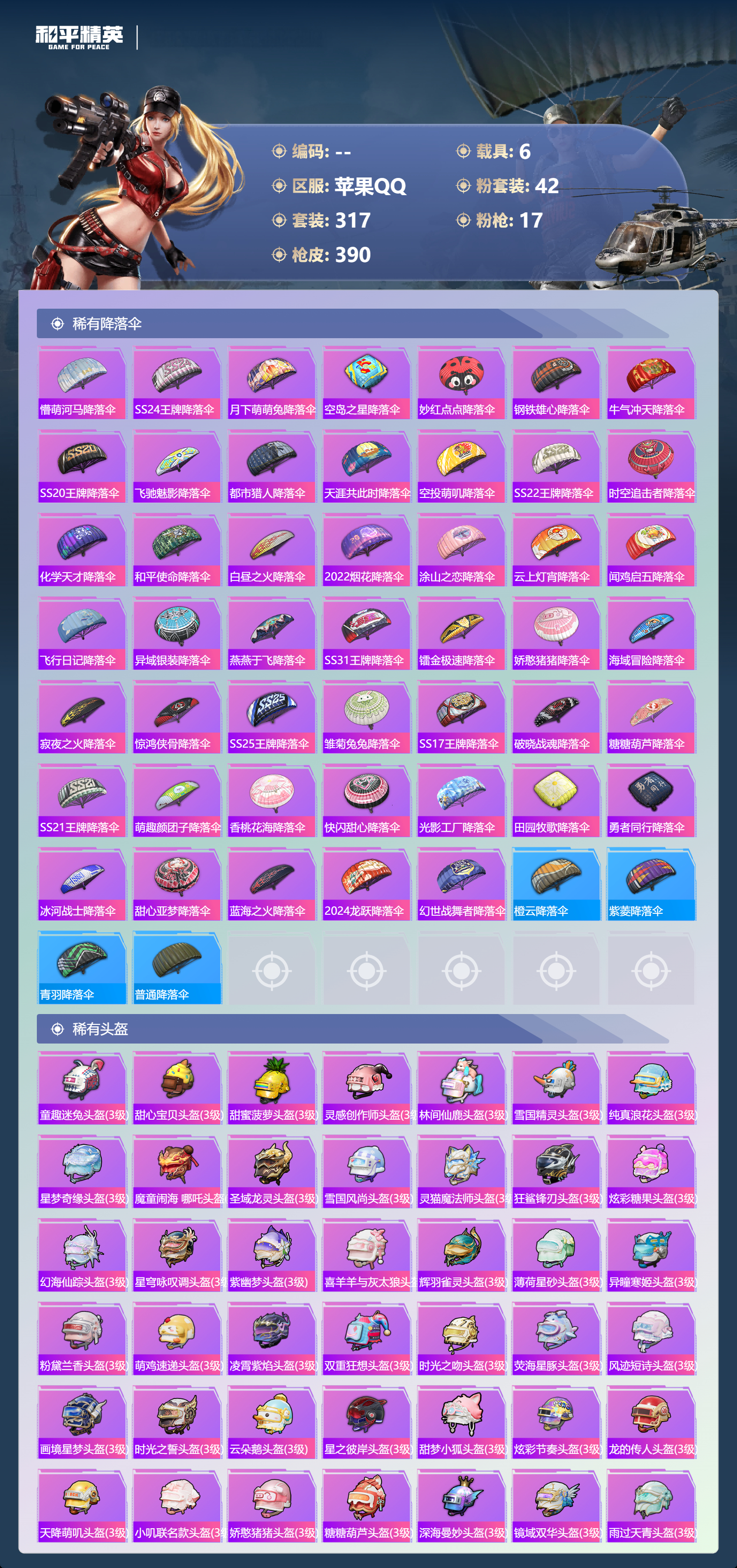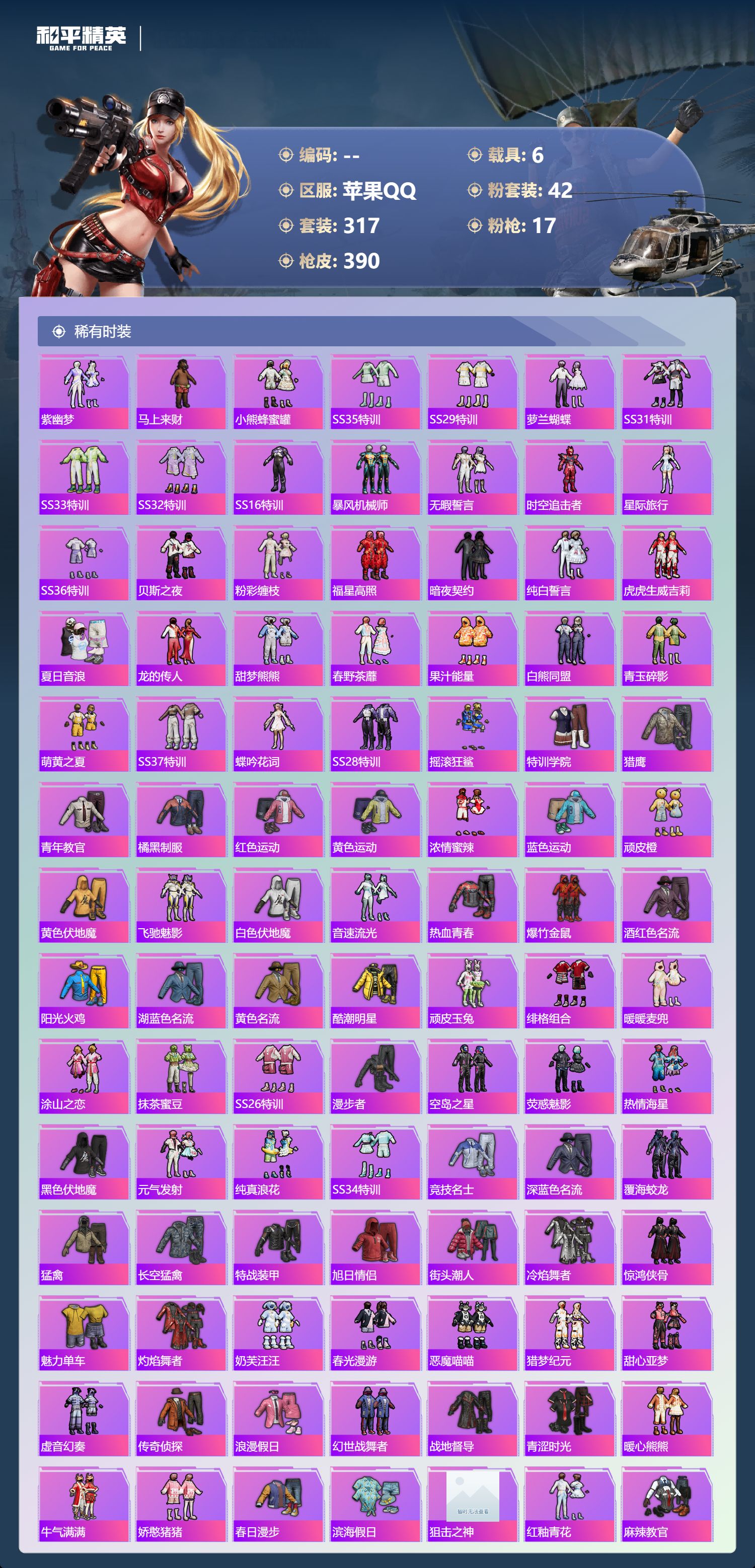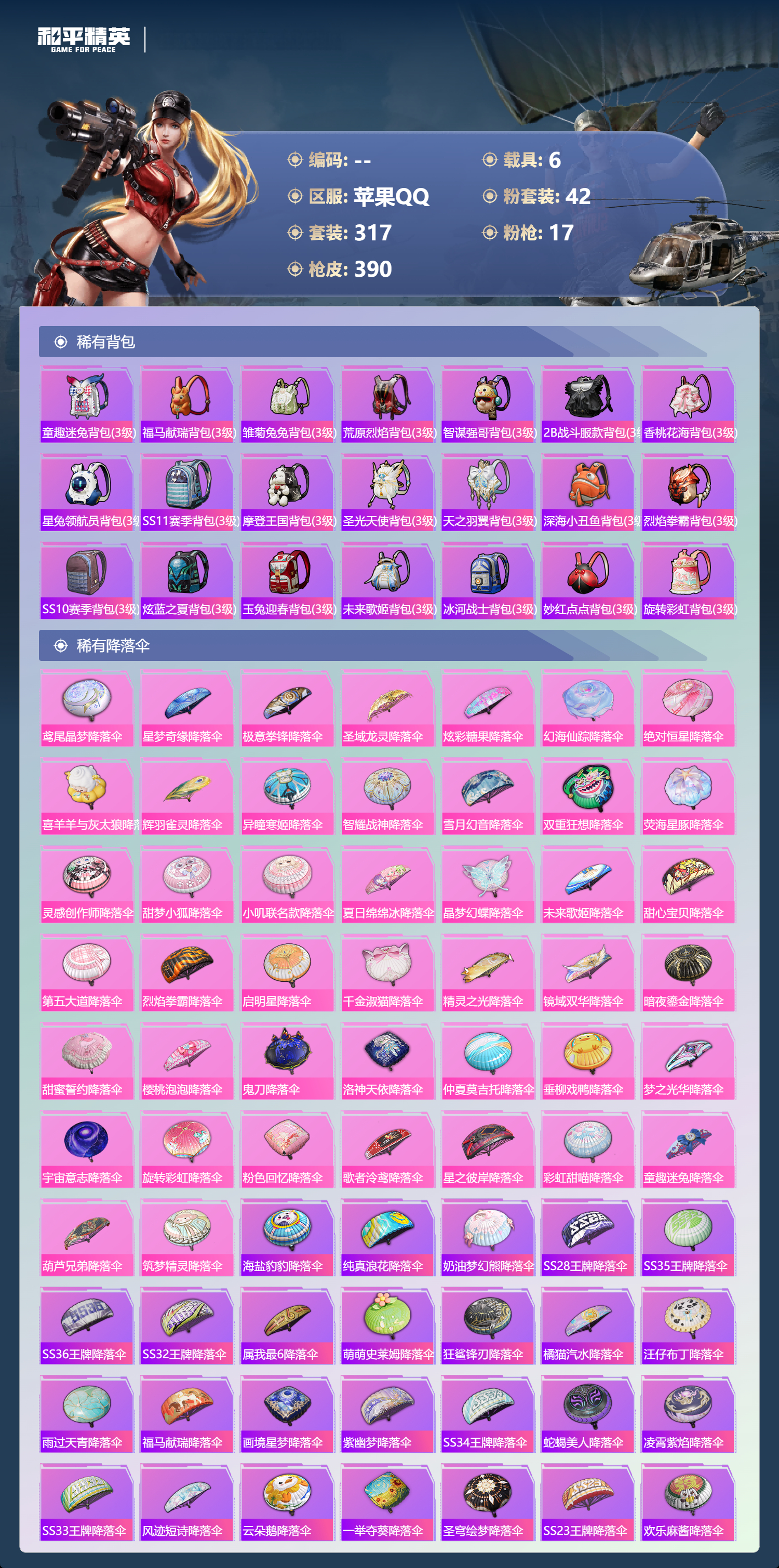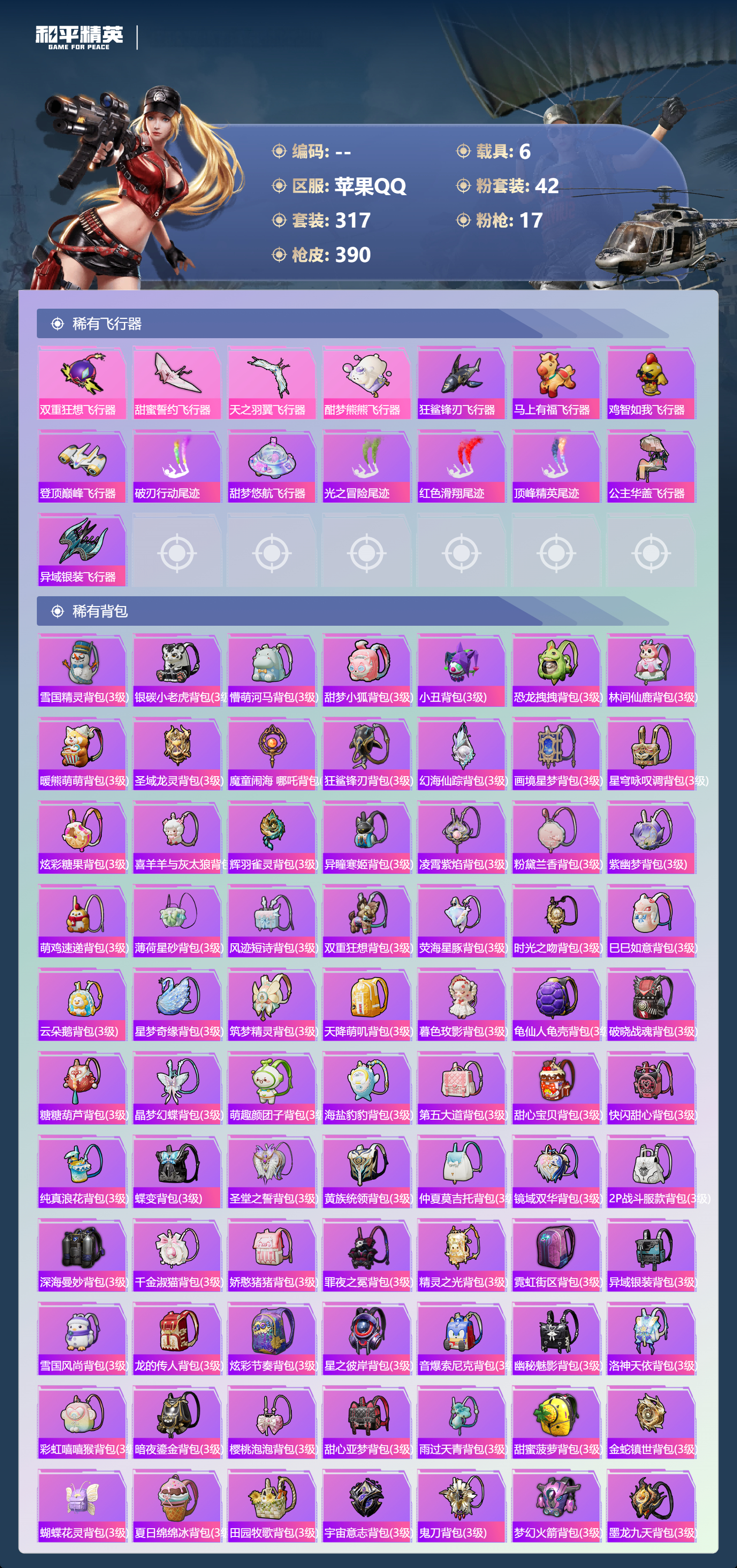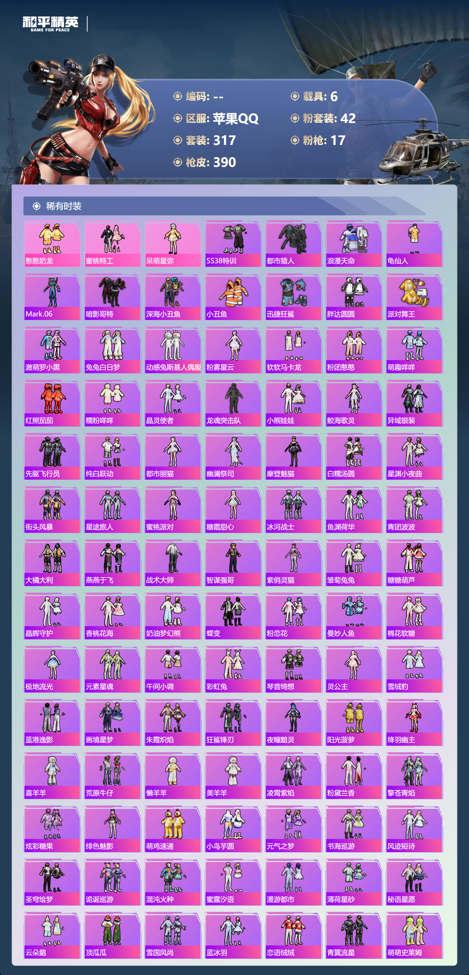 【391稀有枪械】M416-灵猫魔法师/3级,SCAR-L-金蛇镇世/3级,GROZA-精灵之光/3级,UMP45-宇宙意志/3级,Kar98K-圣域龙灵/2级,M416-心之恋语/7级,AKM-白勺歌姬/7级,Kar98K-巳巳如意/5级,Mk14-福马献瑞/4级,Mk14-樱桃泡泡/5级,DP-28-豹影疾电/5级,DP-28-暗夜鎏金/4级,破片手榴弹-美味星星糖/7级,燃烧瓶-薄荷可可/7级,平底锅-仲夏莫吉托/1级,平底锅-喜羊羊与灰太狼/7级,撬棍-永恒法杖/7级,GROZA-奶油梦幻熊,QBZ-纯真浪花,AWM-纯真浪花,汤姆逊-纯真浪花,DBS-乌木金纹,AA12-G-纯真浪花,平底锅-纯真浪花,野牛-奶油梦幻熊,蝎式手枪-奶油梦幻熊,烟雾弹-鸢尾晶梦,汤姆逊-星梦奇缘,MK20-H-星梦奇缘,SCAR-L-海盐豹豹,GROZA-海盐豹豹,野牛-雏菊兔兔,Mk14-冰河战士,SPAS-12-行星泡泡,平底锅-雏菊兔兔,M762-雏菊兔兔,Mini14-雏菊兔兔,M200-宇宙意志,短管霰弹-宇宙意志,R1895-雏菊兔兔,AC-VAL-宇宙意志,Mk47-极冰使者,AUG-兔兔小魔女,UZI-冰河战士,M16A4-冰河战士,MK20-H-乌木金纹,MK20-H-圣域龙灵,短管霰弹-圣域龙灵,DBS-风迹短诗,莫辛纳甘-风迹短诗,Mini14-鸡智如我,Win94-乌木金纹,MK12-风迹短诗,MK12-乌木金纹,破片手榴弹-爆破雪人,PKM-紫幽梦,汤姆逊-灵猫魔法师,MG3-霓彩脉冲,DBS-幻彩电音,ACE32-画境星梦,M1加兰德-画境星梦,MP5K-画境星梦,Mk14-紫幽梦,蜜獾-乌木金纹,M762-云朵鹅,S1897-紫幽梦,SVD-云朵鹅,P92-紫幽梦,蜜獾-绯穹魔姬,SPAS-12-狂鲨锋刃,M417-玩趣呆呆,MK20-H-狂鲨锋刃,燃点复合弓-幻海仙踪,AUG-冰晶雪宝,突击盾牌-绝对恒星,铝热弹-炫彩糖果,Mk47-幻海仙踪,UZI-炫彩糖果,M416-萌萌史莱姆,ARX-像素花束,M249-萌萌史莱姆,TMP-9-萌萌史莱姆,AWM-奇迹舞步,AA12-G-画境星梦,平底锅-画境星梦,M249-冰晶雪宝,Mk47-风迹短诗,平底锅-咒蚀之裁,JS9-凌霄紫焰,MG-36-凌霄紫焰,平底锅-紫幽梦,燃烧瓶-甜梦桃焰,破片手榴弹-海盐豹豹,UMP45-海盐豹豹,镰刀-咒蚀之裁,ARX-凌霄紫焰,AKS-74U-乌木金纹,AKM-涂鸦街区,电击枪-喜羊羊与灰太狼,蜜獾-风迹短诗,爆炸猎弓-喜羊羊与灰太狼,P92-凌霄紫焰,AMR-喜羊羊与灰太狼,Famas-乌木金纹,Famas-霓彩脉冲,SPAS-12-云朵鹅,破片手榴弹-拽到爆炸,十字弩-异瞳寒姬,S1897-糯团青竹,信号枪-异瞳寒姬,平底锅-凌霄紫焰,Mk14-薄荷星砂,AKS-74U-鸡智如我,沙漠之鹰-云朵鹅,烟雾弹-冰氧夏日,AKS-74U-粉粉喵呜,MG-36-薄荷星砂,SCAR-L-绿洲时空,M24-时光之吻,大砍刀-云朵鹅,PKM-啾咪啾咪,SLR-圣穹绘梦,UMP45-圣穹绘梦,沙漠之鹰-圣穹绘梦,M200-爆裂游戏,撬棍-双重狂想,GROZA-荧海星豚,S1897-荧海星豚,DBS-荧海星豚,SLR-霓彩脉冲,平底锅-属我最6,SCAR-L-彩虹符号,S686-雪月幻音,大砍刀-冰澜龙吟,燃点复合弓-火尖莲影,S12K-霓彩脉冲,AKM-霓彩脉冲,撬棍-火尖枪,SKS-圣域龙灵,M416-红色方程式,M416-蓝色火焰,M416-糯团青竹,M416-璀璨流光,M416-彩虹嘻嘻猴,AKM-影袭,AKM-夜灯,AKM-生命誓言,AKM-星之彼岸,AKM-破晓战魂,AKM-龙的传人,AKM-萌趣颜团子,AKM-霓虹街区,SCAR-L-红色方程式,SCAR-L-玉兔迎春,SCAR-L-甜蜜誓约,SCAR-L-粉色回忆,SCAR-L-炫彩节奏,M16A4-红色方程式,M16A4-幻世战舞者,M16A4-甜心亚梦,GROZA-蓝莓炮弹,GROZA-影袭,GROZA-田园牧歌,GROZA-懵萌河马,GROZA-彩虹符号,GROZA-林间仙鹿,GROZA-甜蜜草莓,GROZA-2B战斗服款,AUG-耀粉歌者,AUG-甜蜜菠萝,AUG-幻梦音符,AUG-天降萌叽,QBZ-飞驰魅影,QBZ-洛神天依,QBZ-未来歌姬,M762-甜心宝贝,M762-暗夜鎏金,M762-深海曼妙,M762-彩虹甜喵,M762-天降萌叽,Mk47-乌木金纹,Mk47-粉色回忆,Mk47-妙红点点,Mk47-洛神天依,G36C-镜域双华,G36C-乌木金纹,G36C-懵萌河马,G36C-时空追击者,AC-VAL-天降萌叽,AC-VAL-快闪甜心,AC-VAL-彩虹甜喵,AC-VAL-甜心亚梦,AC-VAL-乌木金纹,蜜獾-天降萌叽,蜜獾-垂柳戏鸭,蜜獾-娇憨猪猪,Famas-镜域双华,Famas-璀璨流光,Kar98K-乌木金纹,Kar98K-红色方程式,Kar98K-洛神天依,Kar98K-飞驰魅影,Kar98K-彩虹符号,Kar98K-影袭,M24-乌木金纹,M24-影袭,M24-仲夏莫吉托,AWM-乌木金纹,AWM-恐龙拽拽,Win94-夏日绵绵冰,Win94-怪笑疯兔,莫辛纳甘-乌木金纹,莫辛纳甘-懵萌河马,AMR-乌木金纹,AMR-白勺歌姬,AMR-妙红点点,M200-仲夏莫吉托,M200-惊鸿侠骨,SKS-迅猛狂鲨,SKS-时空追击者,SKS-青丘仙客,SKS-糯团青竹,SKS-未来歌姬,VSS-星之彼岸,VSS-乌木金纹,VSS-田园牧歌,VSS-粉色回忆,VSS-彩虹符号,Mini14-梦幻火箭,Mini14-耀粉歌者,Mini14-阿狸红,Mini14-林间仙鹿,Mini14-涂山之恋,Mini14-穿刺龙虾,Mk14-治愈之星,Mk14-童趣迷兔,Mk14-乌木金纹,SLR-彩虹符号,SLR-娇憨猪猪,M417-惊鸿侠骨,MK20-H-启明星,MK20-H-快闪甜心,UZI-炫彩节奏,UZI-红色方程式,UZI-影袭,UZI-娇憨猪猪,UZI-天降萌叽,UZI-啾咪啾咪,UMP45-涂山之恋,UMP45-生命誓言,UMP45-粉色回忆,UMP45-仲夏莫吉托,UMP45-时空追击者,UMP45-猪猪侠,Vector-生命誓言,Vector-夜灯,Vector-彩虹符号,Vector-田园牧歌,汤姆逊-耀粉歌者,汤姆逊-天降萌叽,汤姆逊-乌木金纹,汤姆逊-甜梦小狐,汤姆逊-暗夜鎏金,野牛-乌木金纹,MP5K-甜蜜誓约,MP5K-乌木金纹,P90-乌木金纹,P90-快闪甜心,P90-飞驰魅影,P90-筑梦精灵,P90-甜蜜旋律,P90-玩趣呆呆,S686-蜜语绒猫,S686-彩虹符号,S686-白勺歌姬,S686-深海曼妙,S686-橘柚倾心,S686-生命誓言,S1897-乌木金纹,S1897-飞驰魅影,S1897-暗夜鎏金,S12K-玩趣呆呆,S12K-幻世战舞者,S12K-夏日绵绵冰,S12K-娇憨猪猪,S12K-童趣迷兔,S12K-夜灯,DBS-巴啦啦小魔仙,DBS-时空追击者,DBS-甜心亚梦,DBS-彩虹甜喵,DBS-彩虹符号,SPAS-12-天使羽翼,SPAS-12-田园牧歌,M249-彩虹符号,M249-糯团青竹,M249-乌木金纹,M249-星之彼岸,M249-妙红点点,DP-28-甜心宝贝,DP-28-旋转彩虹,DP-28-彩虹符号,DP-28-甜心亚梦,DP-28-