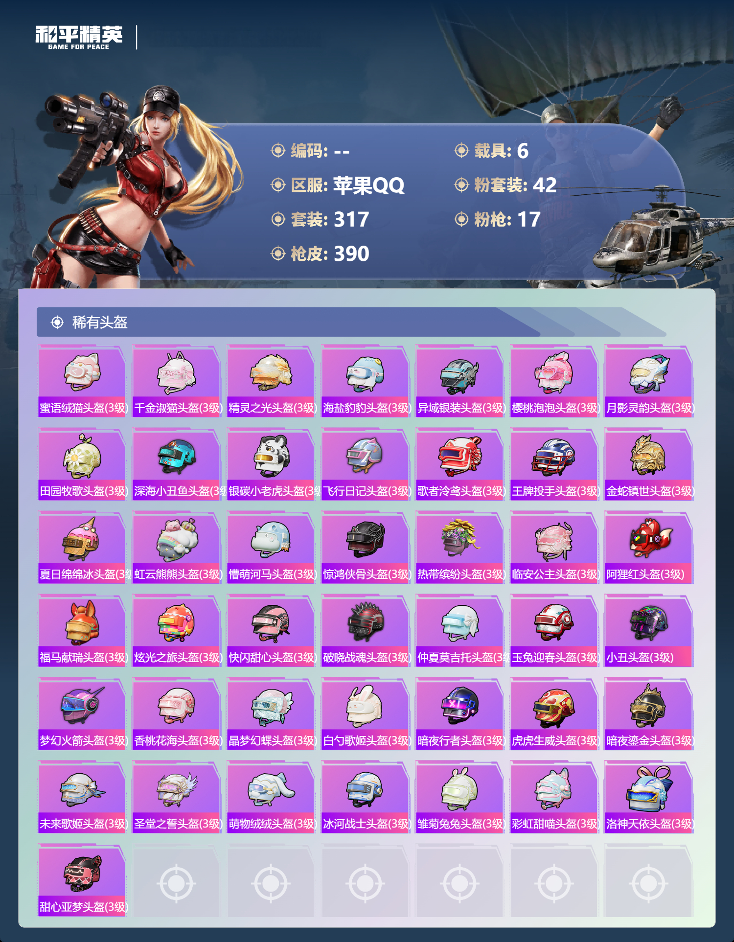 【85稀有头盔】童趣迷兔头盔(3级),甜心宝贝头盔(3级),甜蜜菠萝头盔(3级),灵感创作师头盔(3级),林间仙鹿头盔(3级),雪国精灵头盔(3级),纯真浪花头盔(3级),星梦奇缘头盔(3级),魔童闹海,哪吒头盔(3级),圣域龙灵头盔(3级),雪国风尚头盔(3级),灵猫魔法师头盔(3级),狂鲨锋刃头盔(3级),炫彩糖果头盔(3级),幻海仙踪头盔(3级),星穹咏叹调头盔(3级),紫幽梦头盔(3级),喜羊羊与灰太狼头盔(3级),辉羽雀灵头盔(3级),薄荷星砂头盔(3级),异瞳寒姬头盔(3级),粉黛兰香头盔(3级),萌鸡速递头盔(3级),凌霄紫焰头盔(3级),双重狂想头盔(3级),时光之吻头盔(3级),荧海星豚头盔(3级),风迹短诗头盔(3级),画境星梦头盔(3级),时光之誓头盔(3级),云朵鹅头盔(3级),星之彼岸头盔(3级),甜梦小狐头盔(3级),炫彩节奏头盔(3级),龙的传人头盔(3级),天降萌叽头盔(3级),小叽联名款头盔(3级),娇憨猪猪头盔(3级),糖糖葫芦头盔(3级),深海曼妙头盔(3级),镜域双华头盔(3级),雨过天青头盔(3级),蜜语绒猫头盔(3级),千金淑猫头盔(3级),精灵之光头盔(3级),海盐豹豹头盔(3级),异域银装头盔(3级),樱桃泡泡头盔(3级),月影灵韵头盔(3级),田园牧歌头盔(3级),深海小丑鱼头盔(3级),银碳小老虎头盔(3级),飞行日记头盔(3级),歌者泠鸢头盔(3级),王牌投手头盔(3级),金蛇镇世头盔(3级),夏日绵绵冰头盔(3级),虹云熊熊头盔(3级),懵萌河马头盔(3级),惊鸿侠骨头盔(3级),热带缤纷头盔(3级),临安公主头盔(3级),阿狸红头盔(3级),福马献瑞头盔(3级),炫光之旅头盔(3级),快闪甜心头盔(3级),破晓战魂头盔(3级),仲夏莫吉托头盔(3级),玉兔迎春头盔(3级),小丑头盔(3级),梦幻火箭头盔(3级),香桃花海头盔(3级),晶梦幻蝶头盔(3级),白勺歌姬头盔(3级),暗夜行者头盔(3级),虎虎生威头盔(3级),暗夜鎏金头盔(3级),未来歌姬头盔(3级),圣堂之誓头盔(3级),萌物绒绒头盔(3级),冰河战士头盔(3级),雏菊兔兔头盔(3级),彩虹甜喵头盔(3级),洛神天依头盔(3级),甜心亚梦头盔(3级)