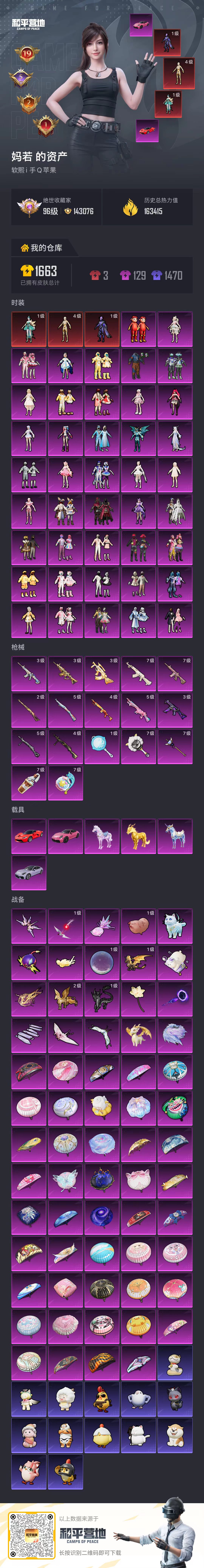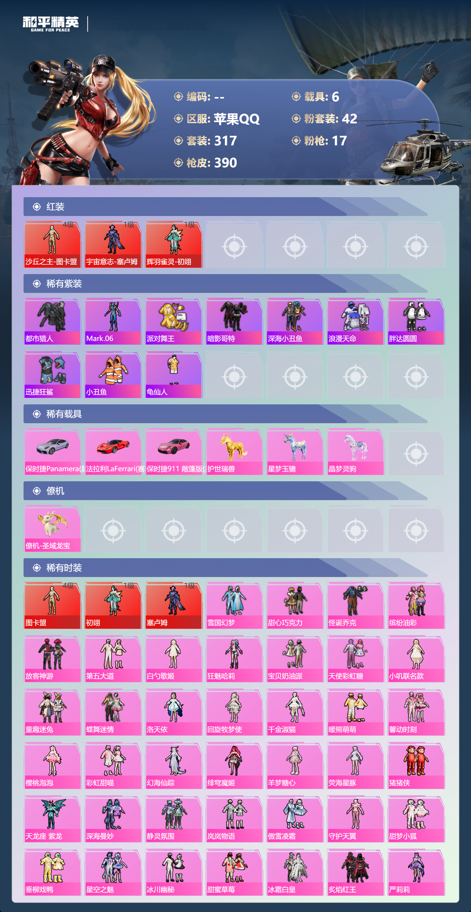 PX_2551205-,苹果手Q-19王牌印记-有战神框-3红装-42粉装-17特效枪-6载具-热力值-317套装-390枪皮-5卓越印记-2传奇印记