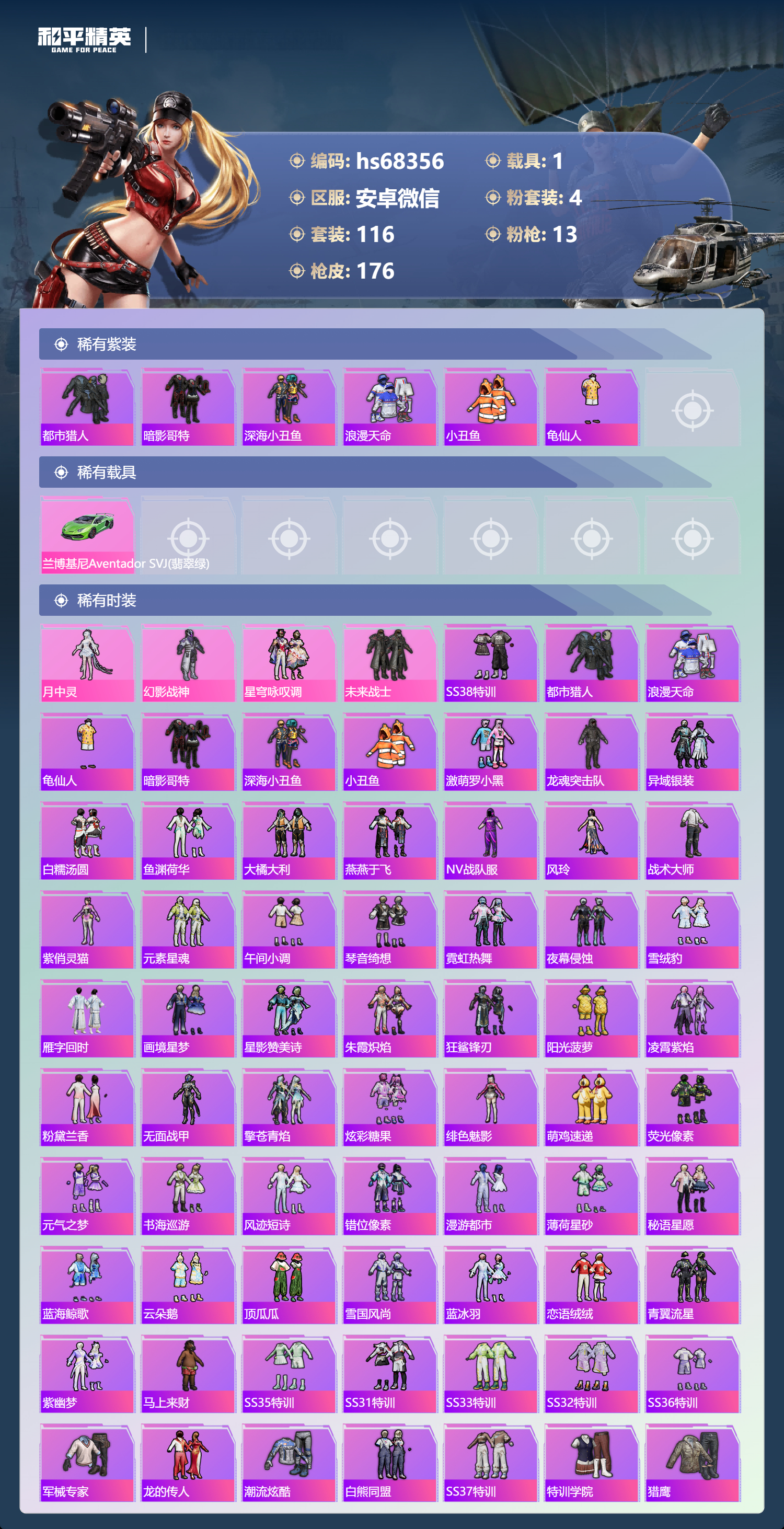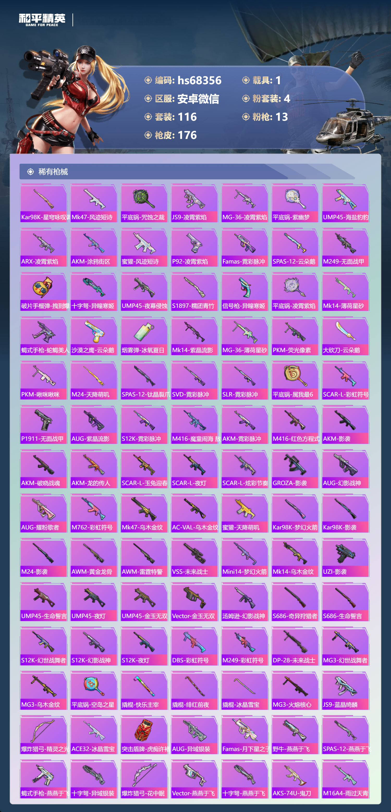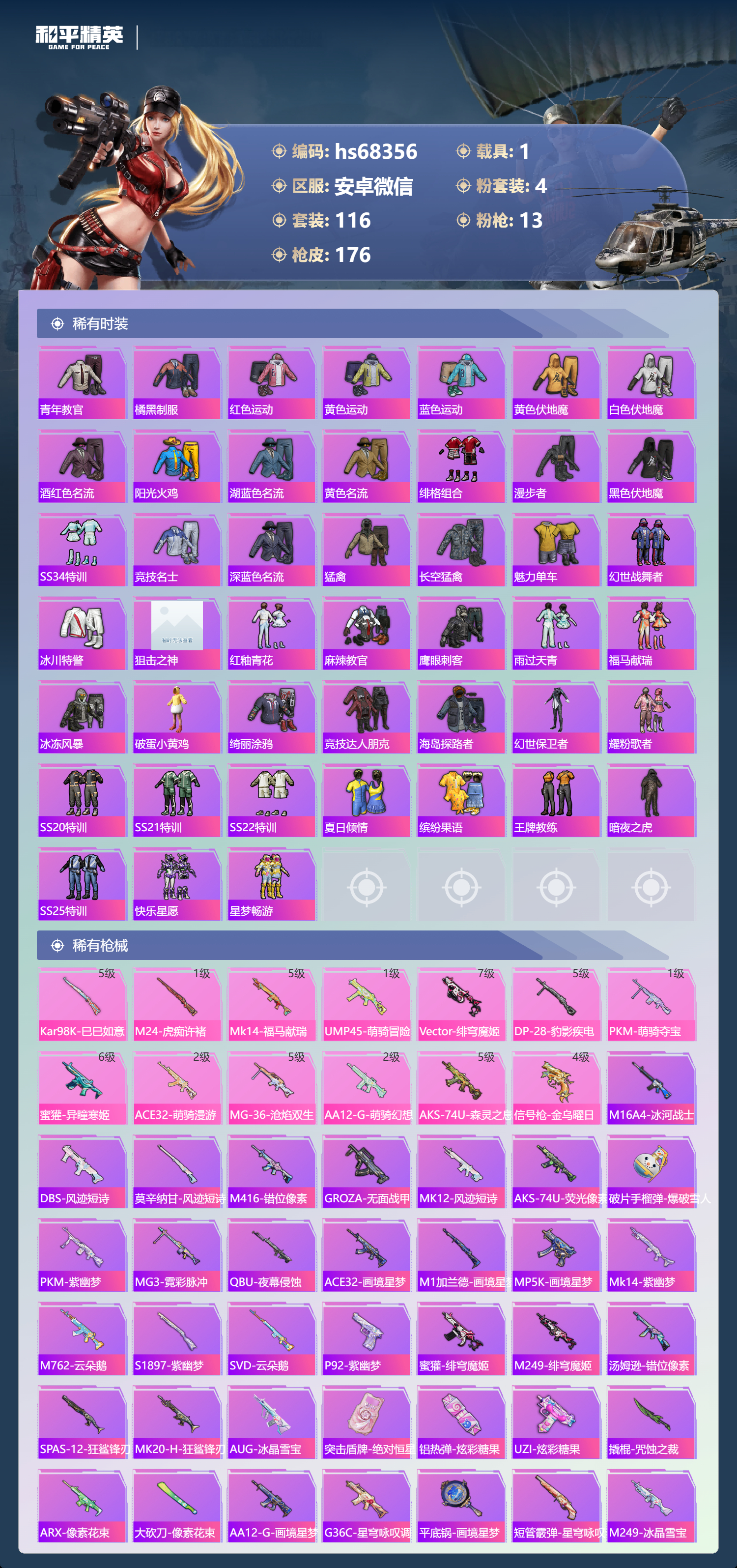 PX_2543293-,安卓微信-7王牌印记-4粉装-13特效枪-1载具-49530热力值-116套装-176枪皮-2卓越印记