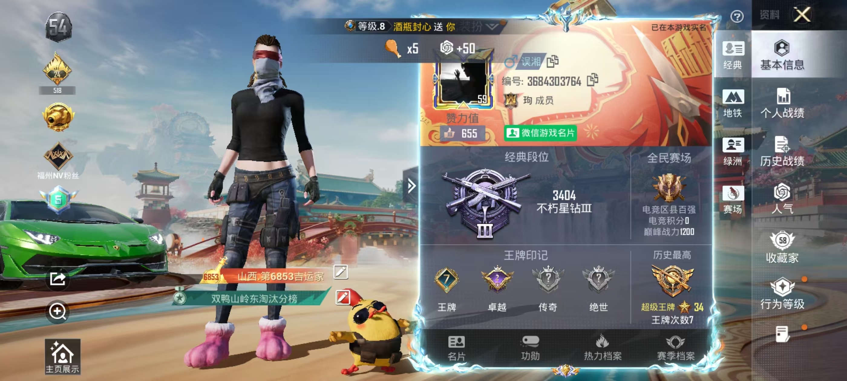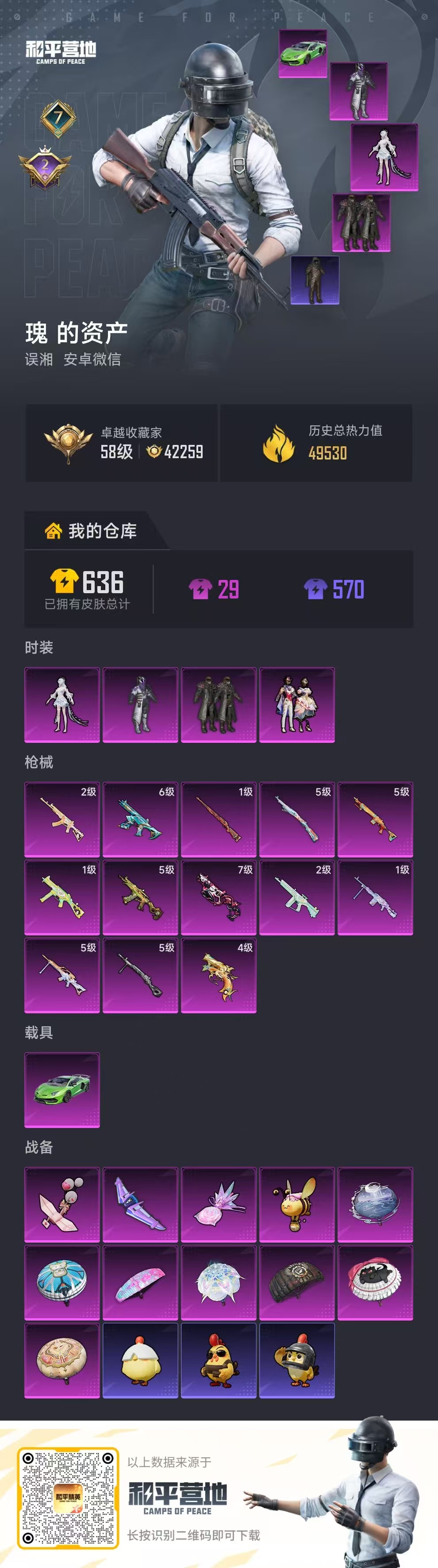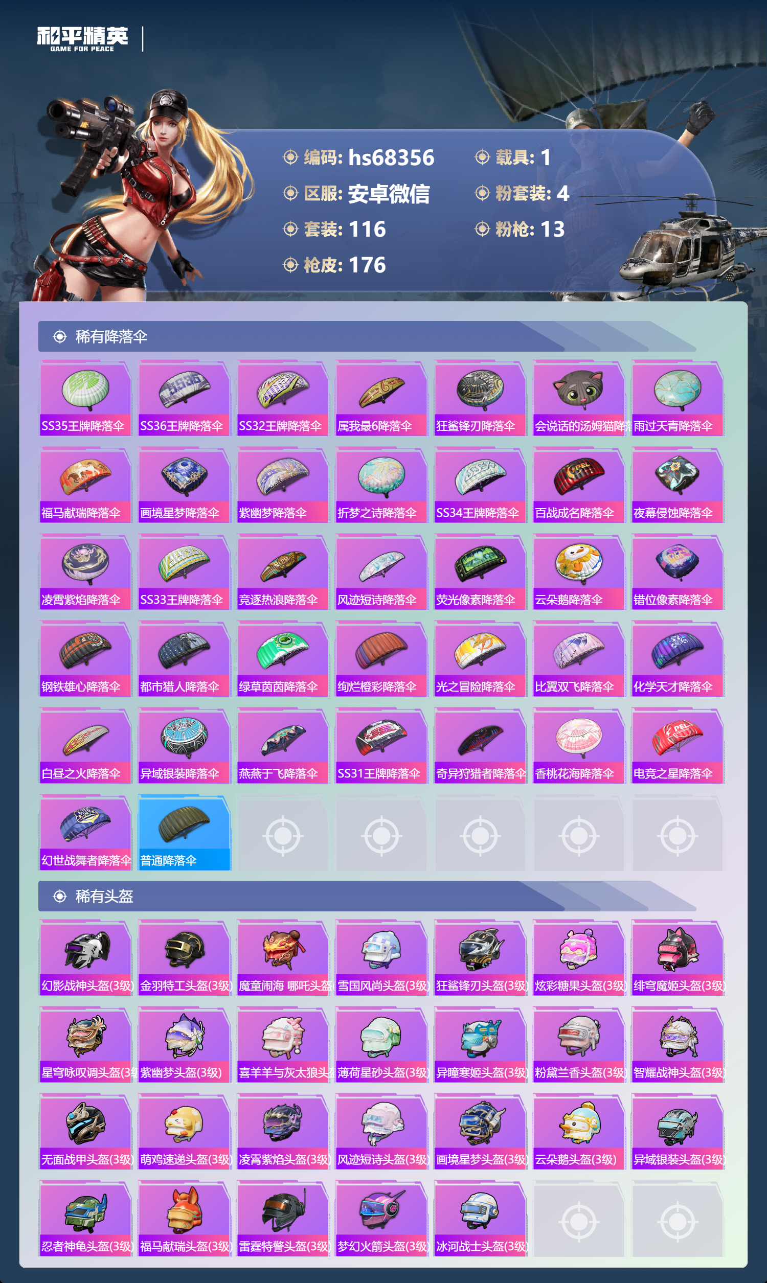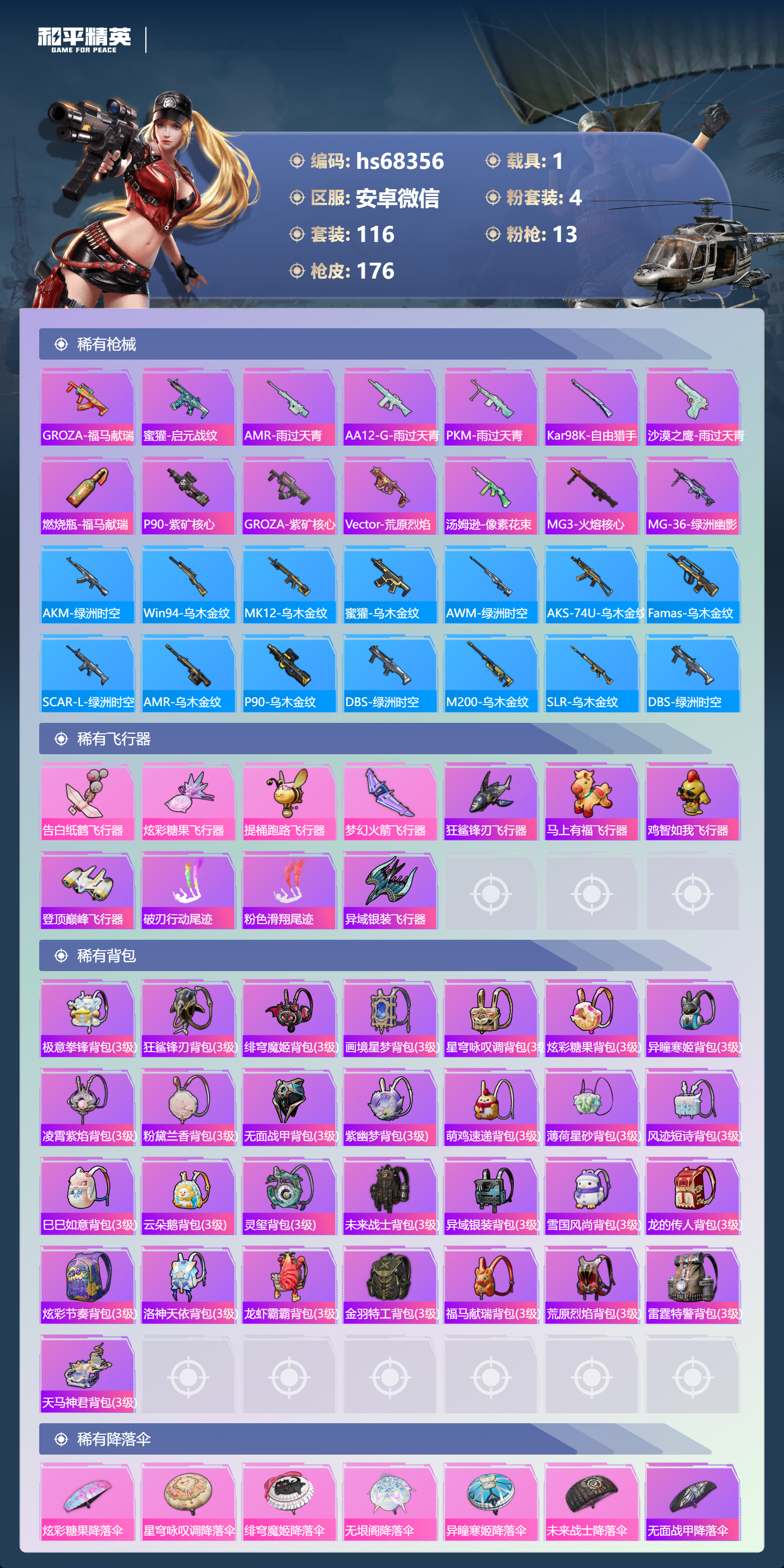 PX_2543293-,安卓微信-7王牌印记-4粉装-13特效枪-1载具-49530热力值-116套装-176枪皮-2卓越印记